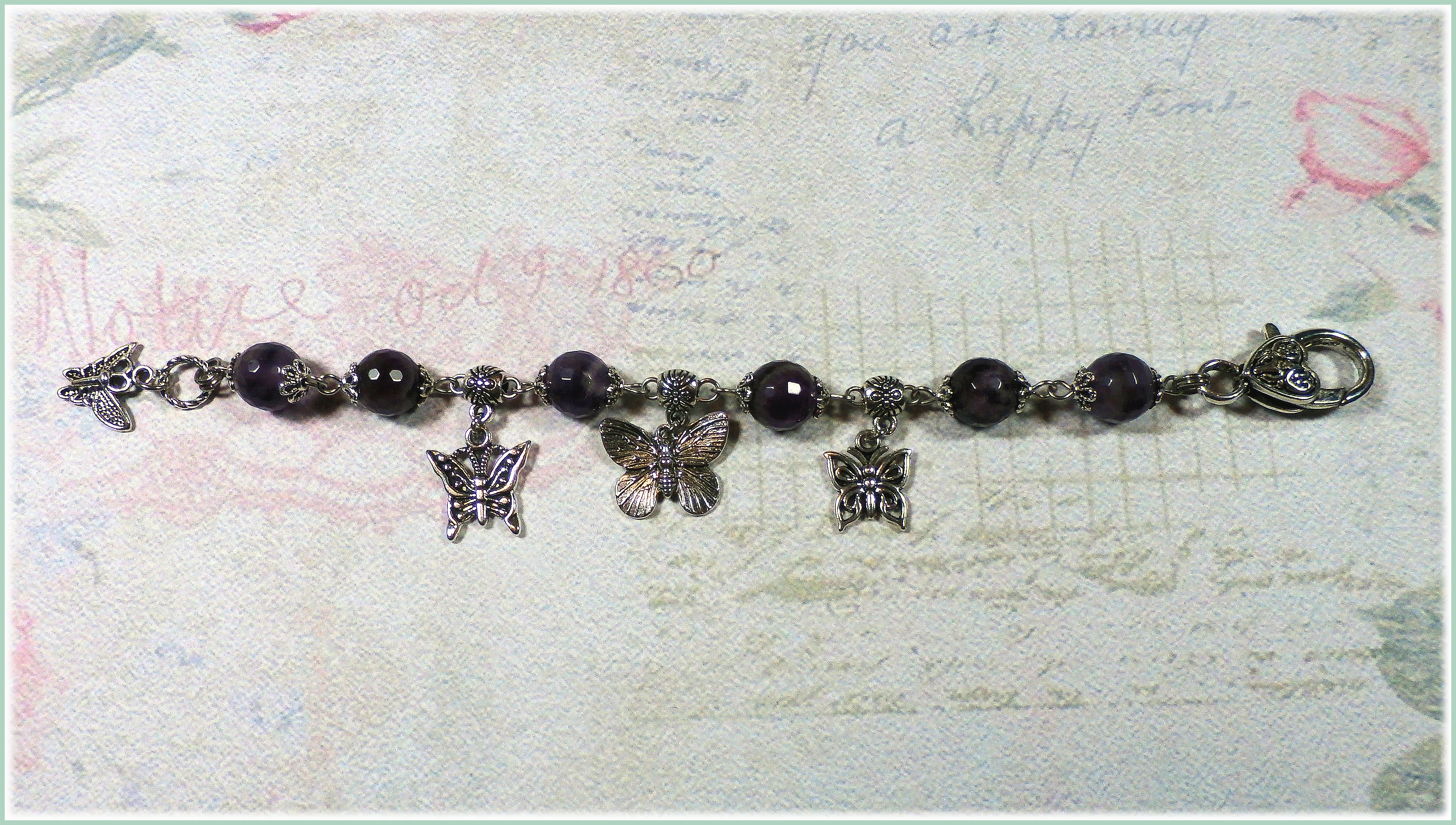 Speziell nach den Wünschen einer Kundin angefertigtes Armband aus facettierten Amethystkugeln und Schmetterlinganhängern.