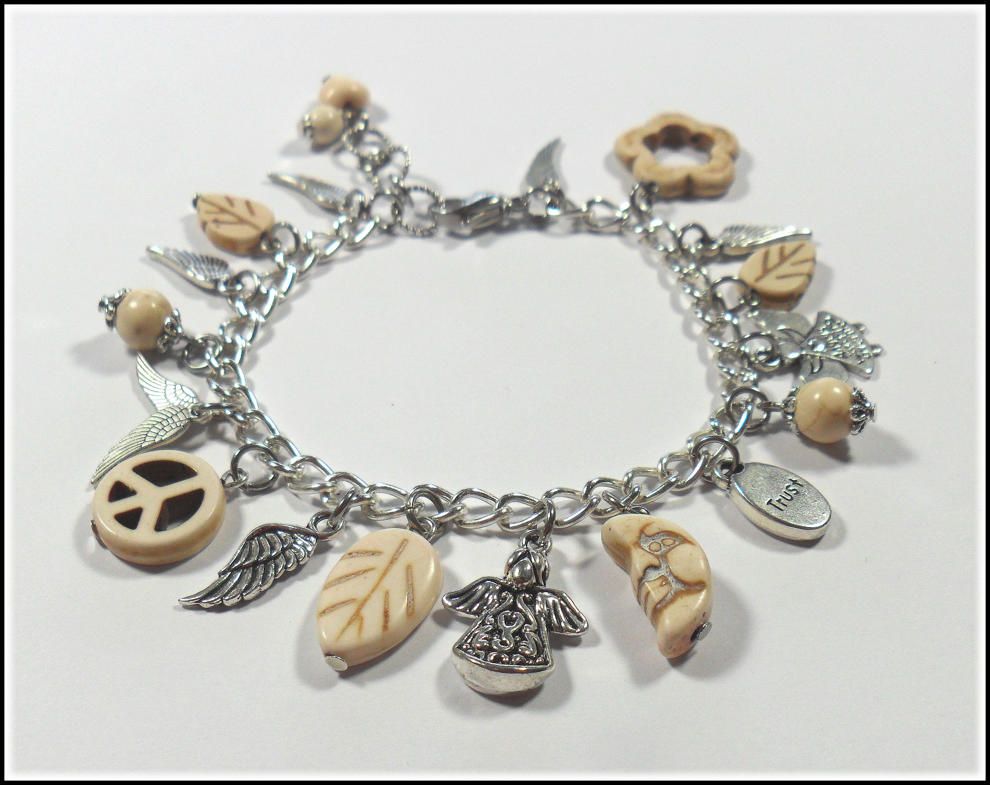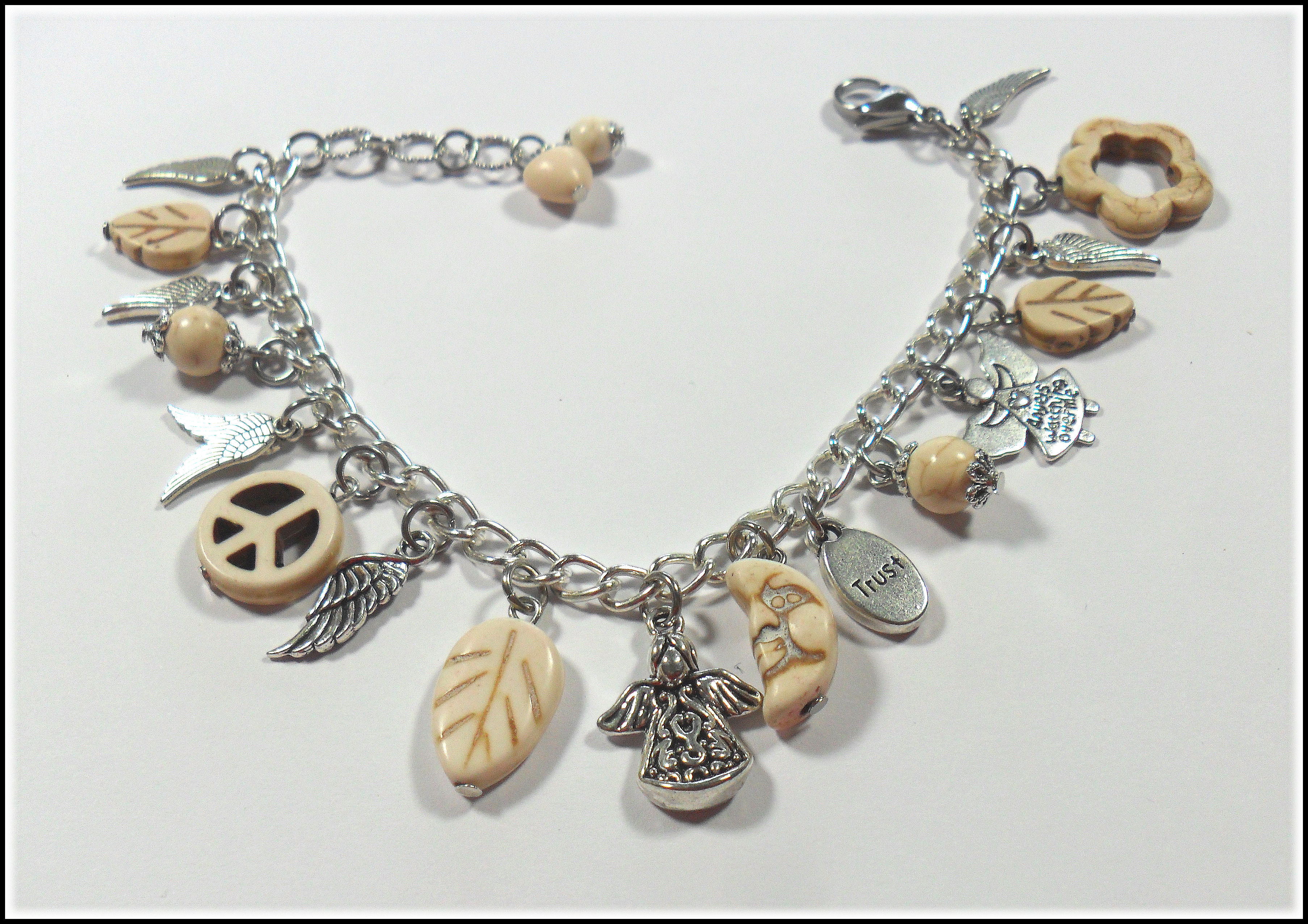Material: Howlith, Tibetsilber, Edelstahl (Karabiner und Ringe), Metalllegierungen (teilweise versilbert)