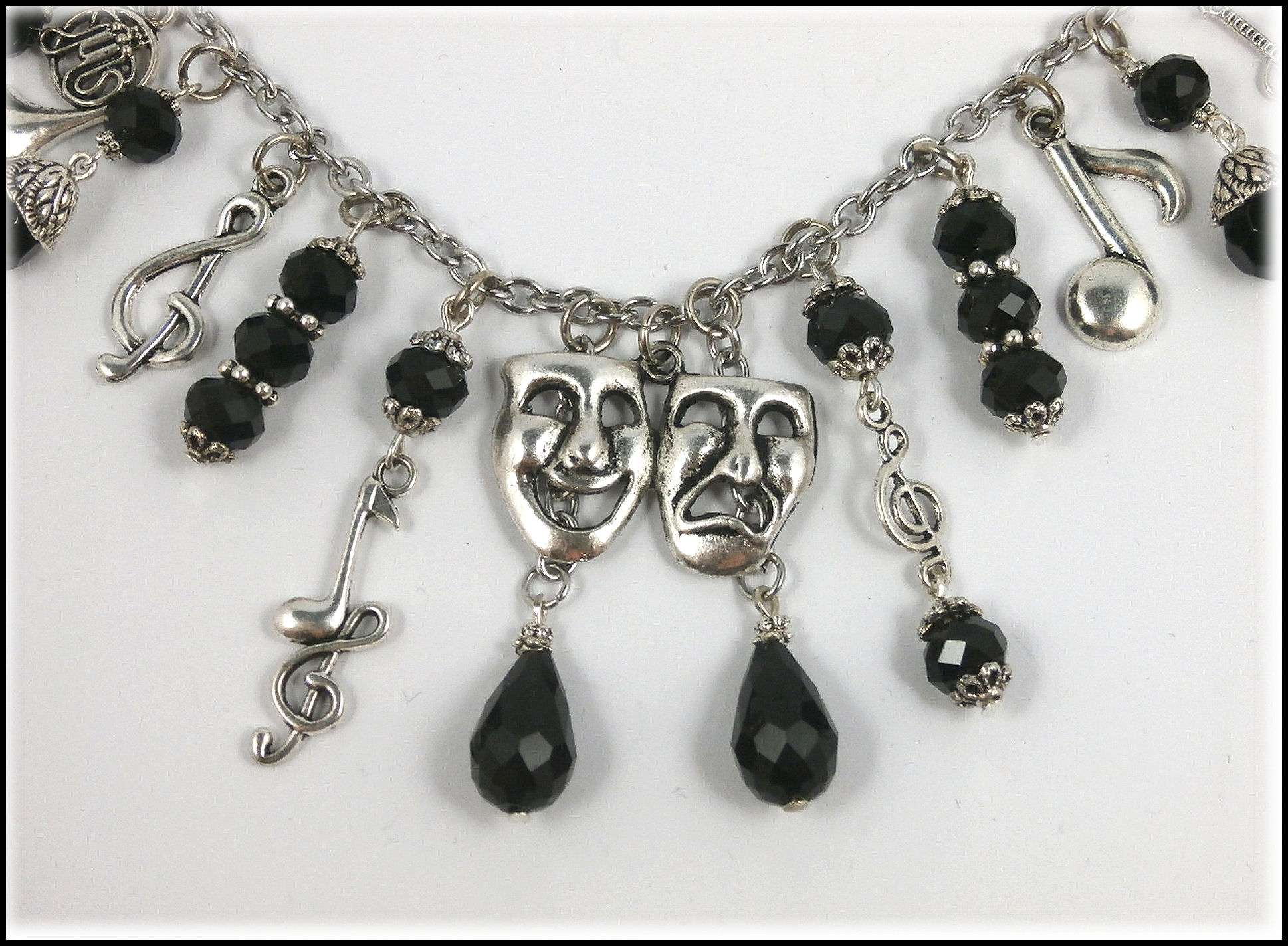Im Zentrum findet sich DAS Theatersymbol schlechthin – die lachende und die weinende Theatermaske. Ergänzt wird sie durch Noten, Notenschlüssel, Musikinstrumente und schwarze Glasschliffperlen.