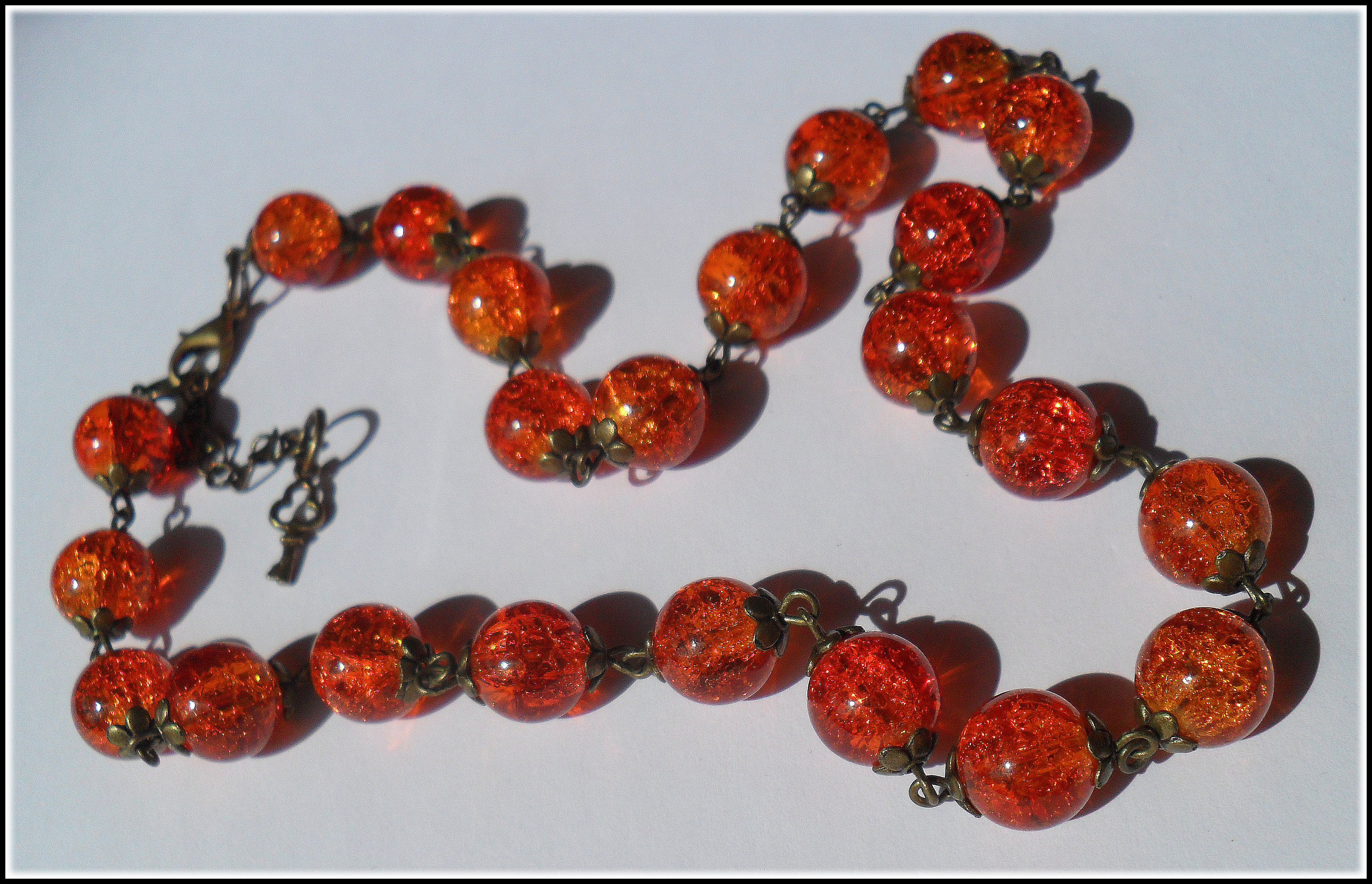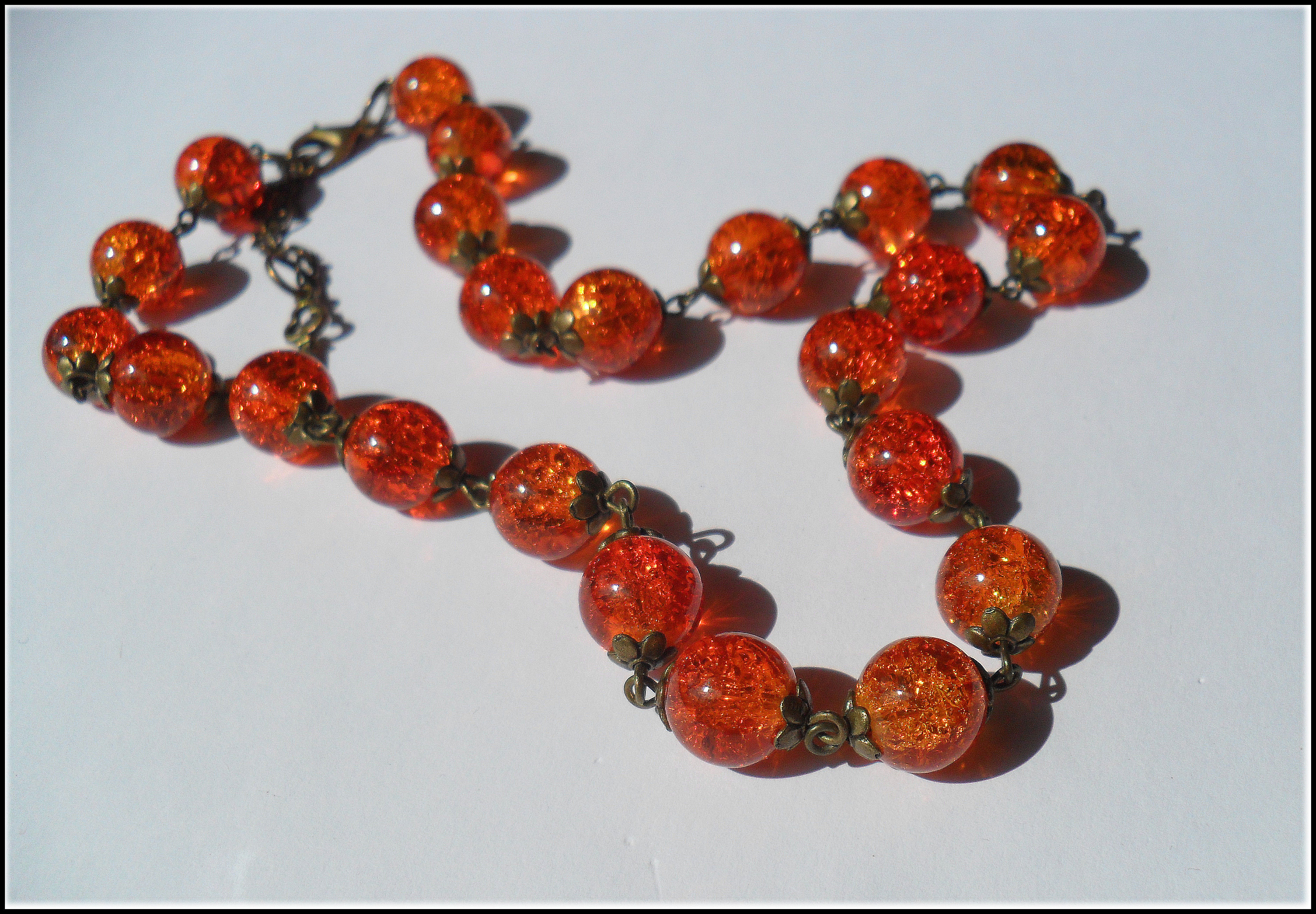 Einmalig schöne orange Crackle-Perlen, gefasst in bronzierte Perlkappen – ein wahrer Klunkerschatz ist dieses herrliche Collier!
