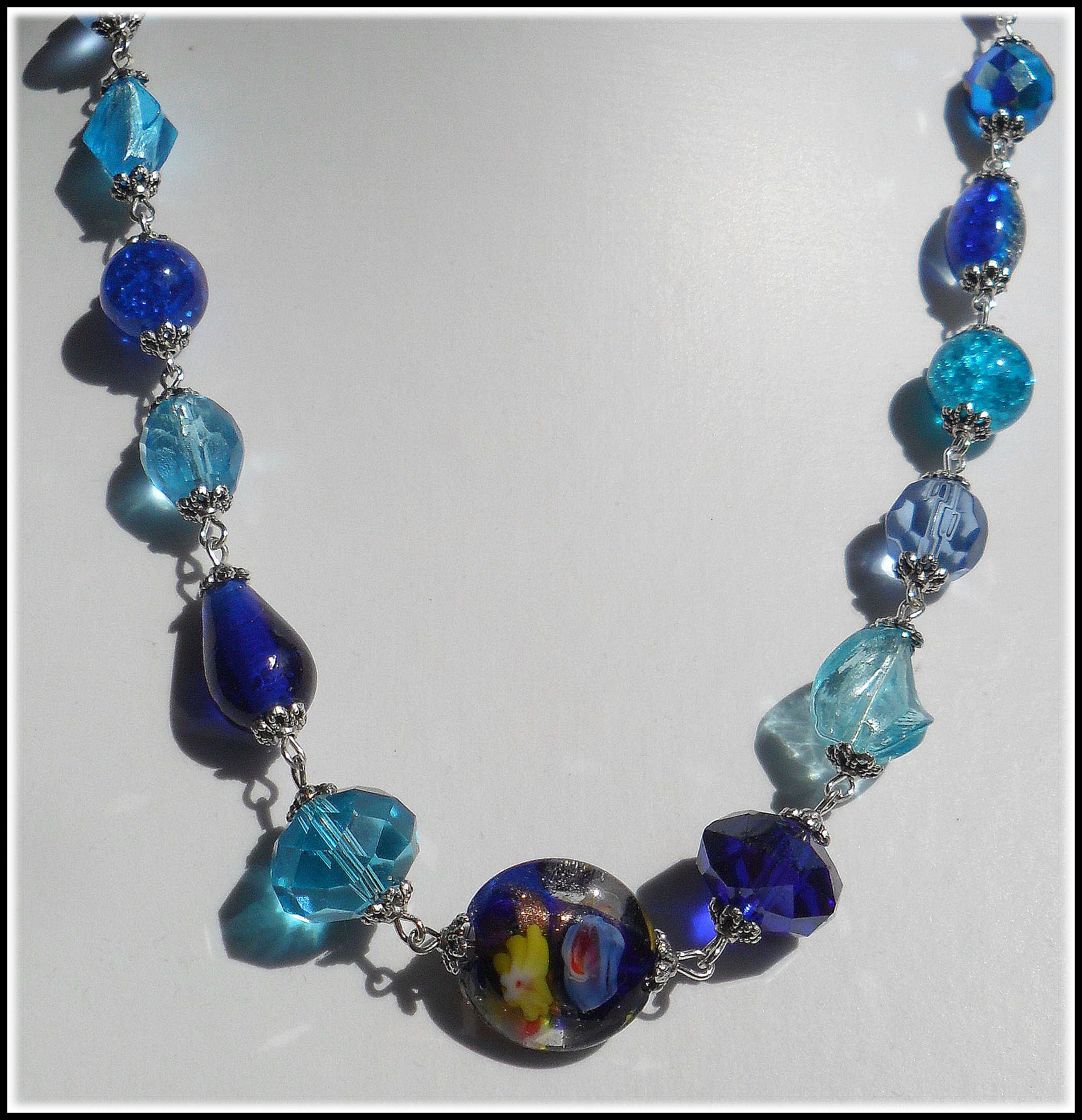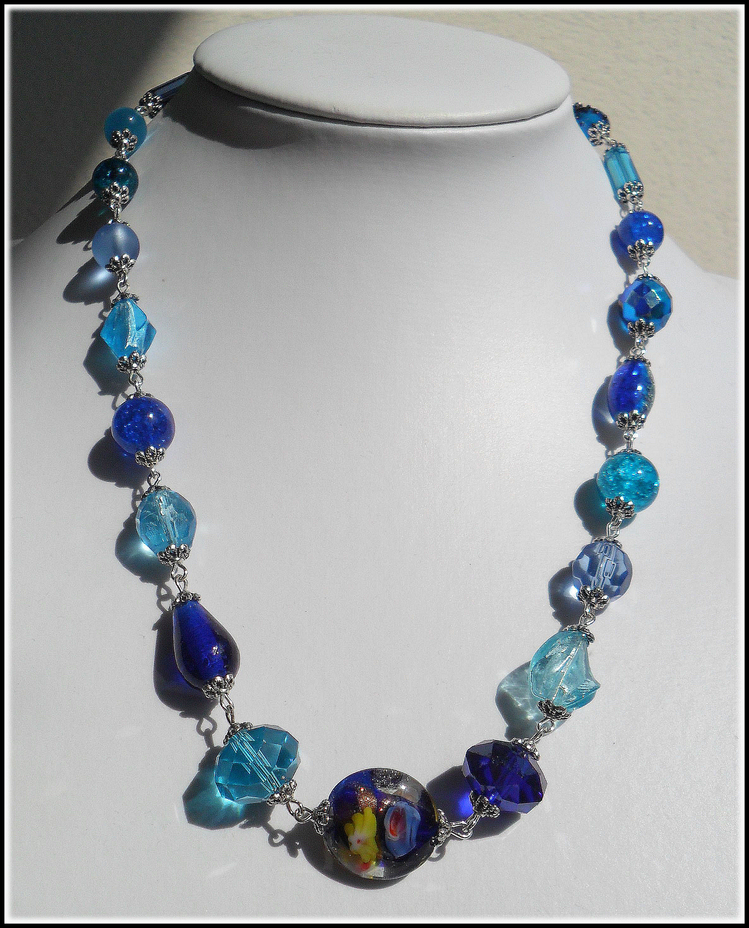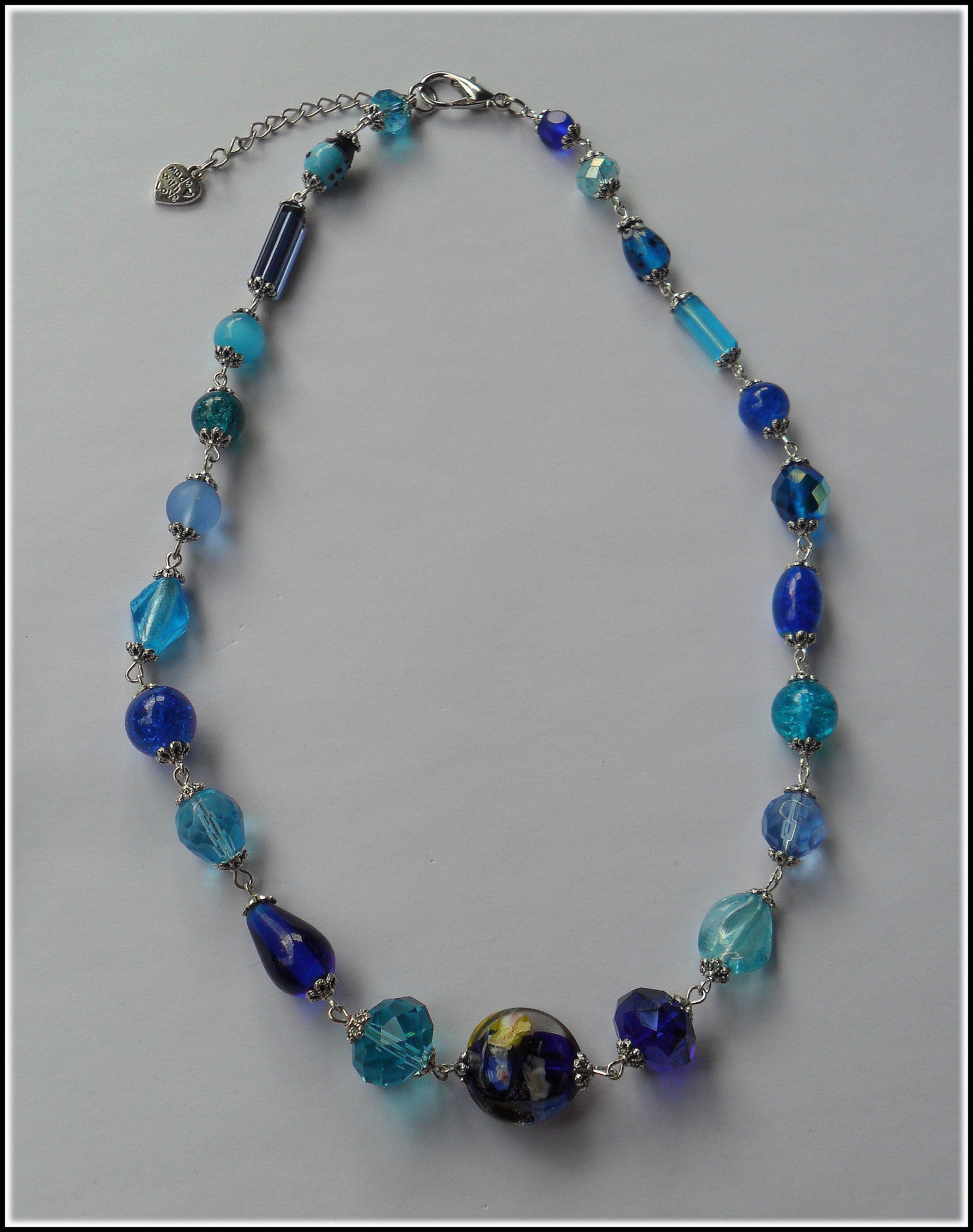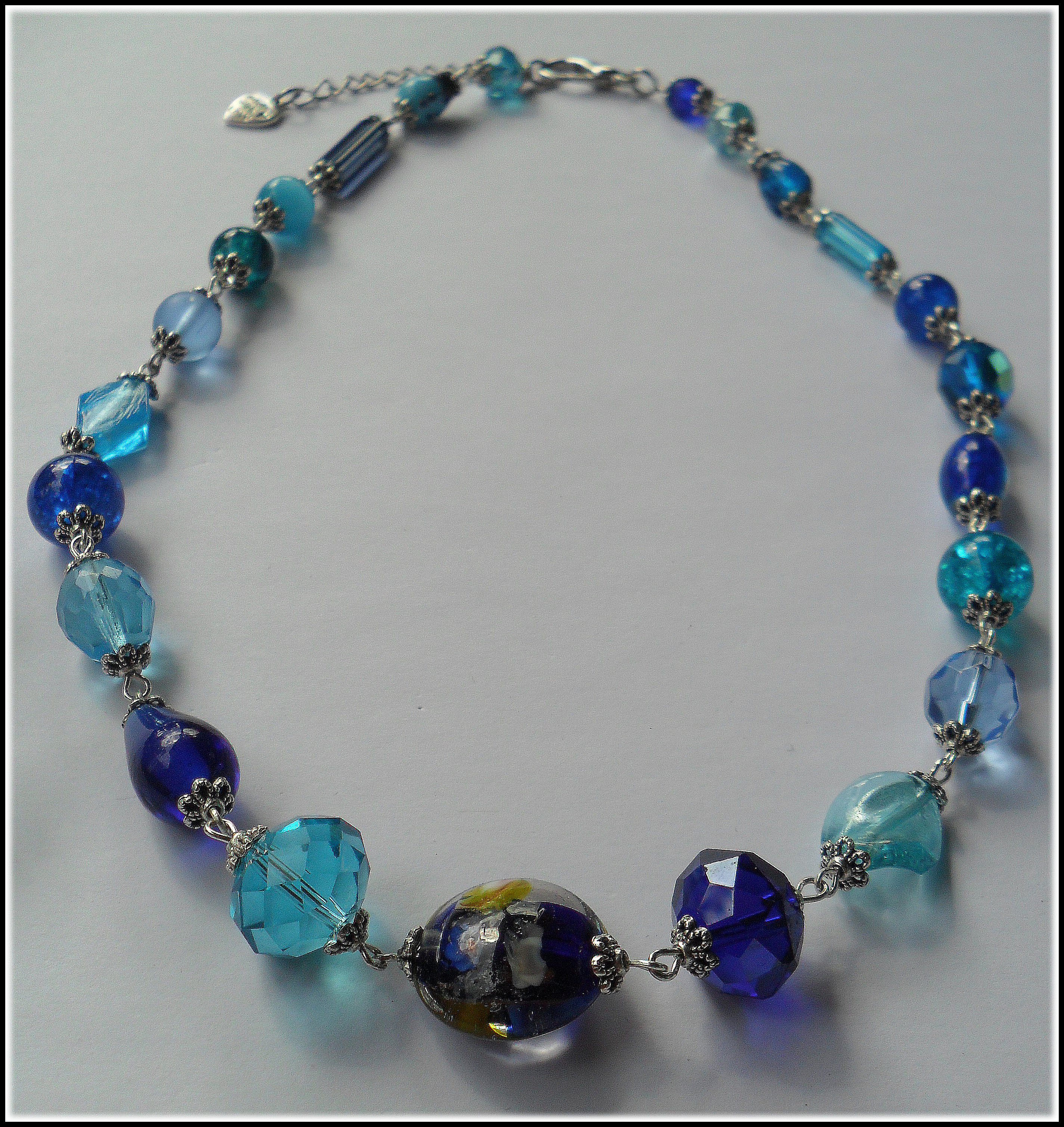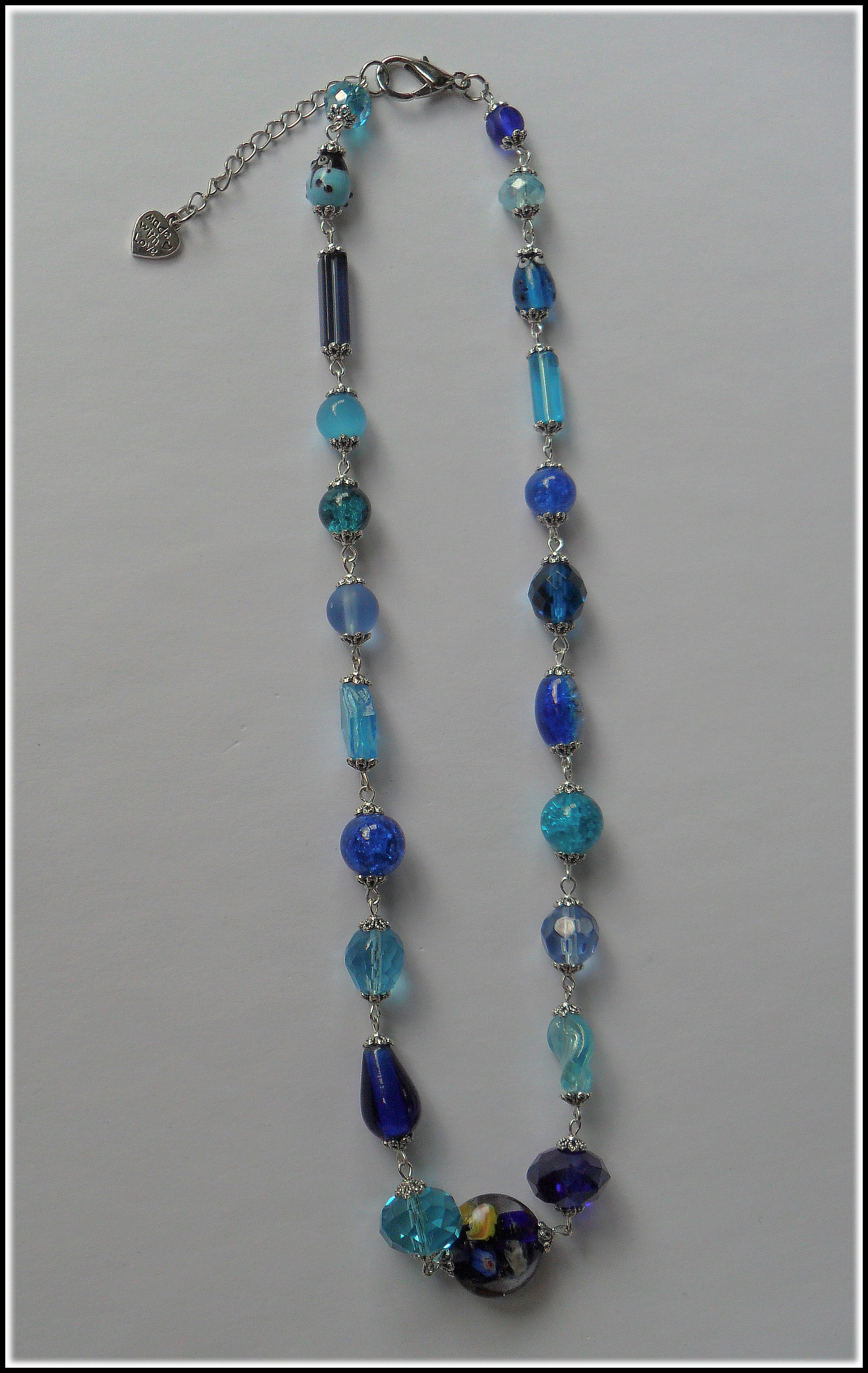 Diese Glasperlenkette steht dieses Mal unter dem Motto „Lieblingsblau“ – Himmelblau, Meerblau, Veilchenblau, Blassblau, Nachtblau, Taubenblau, Königsblau, Kornblumenblau, Blaubeere… Hauptsache Blau!!