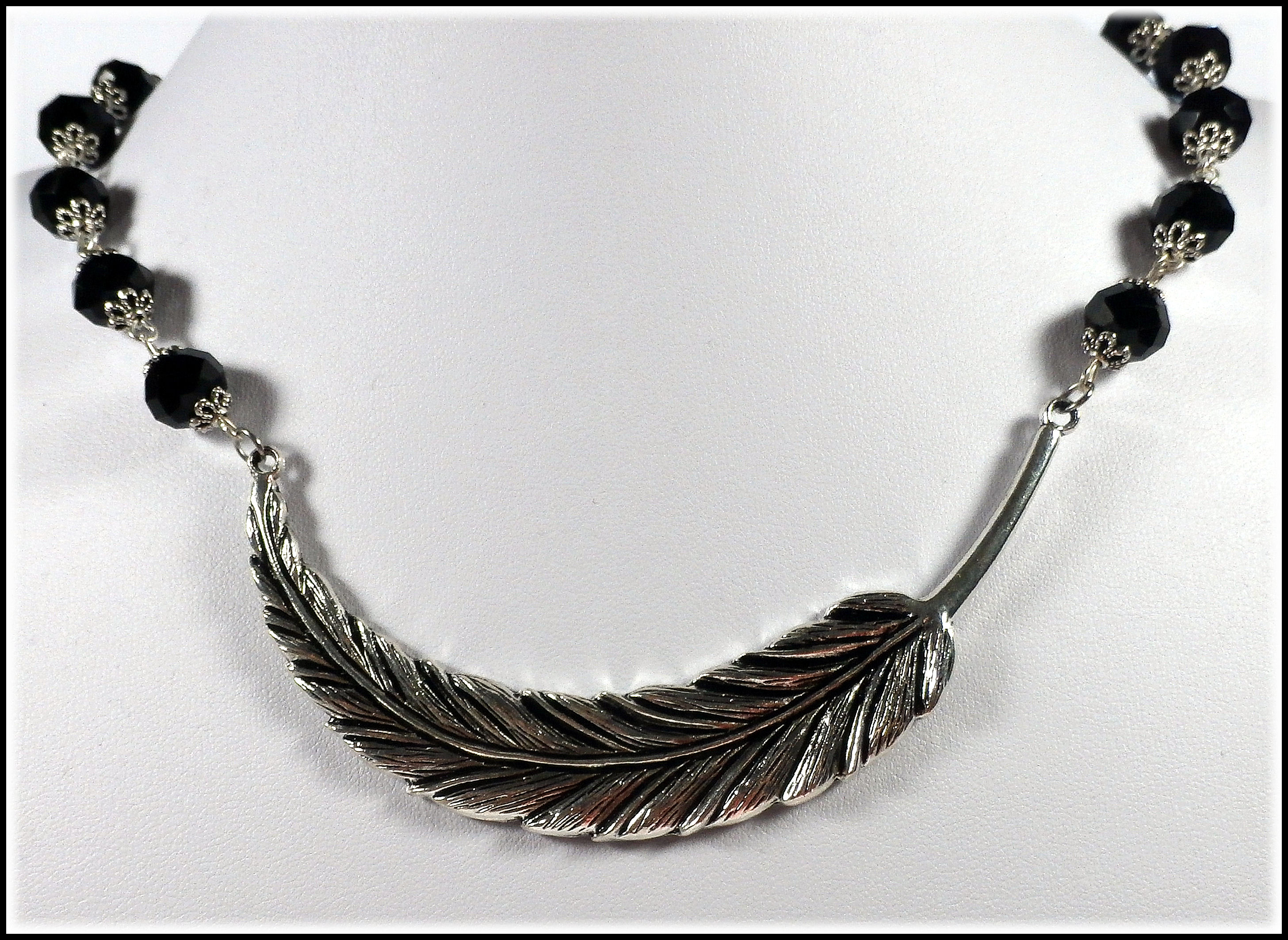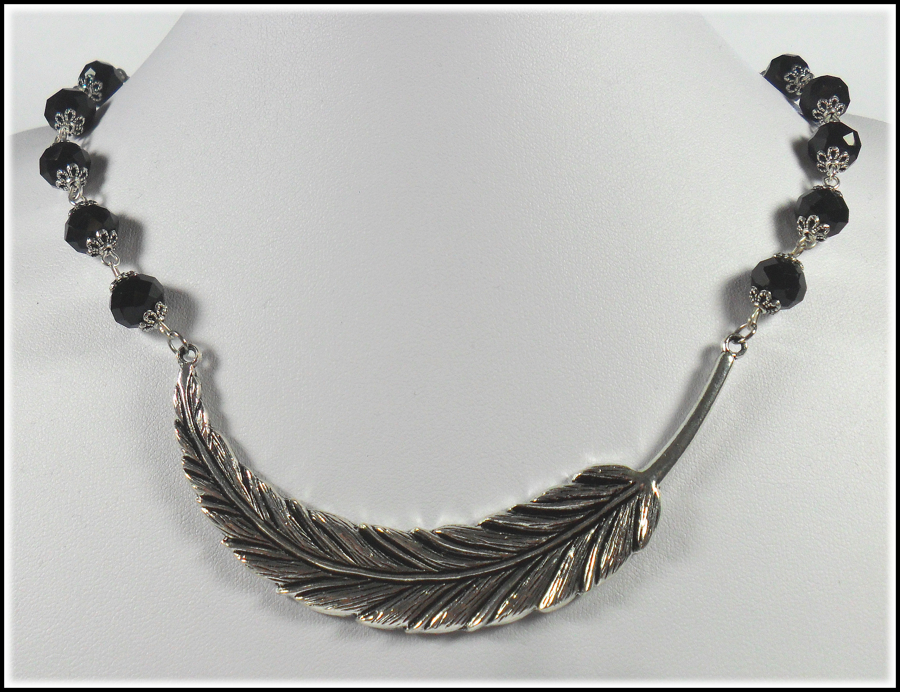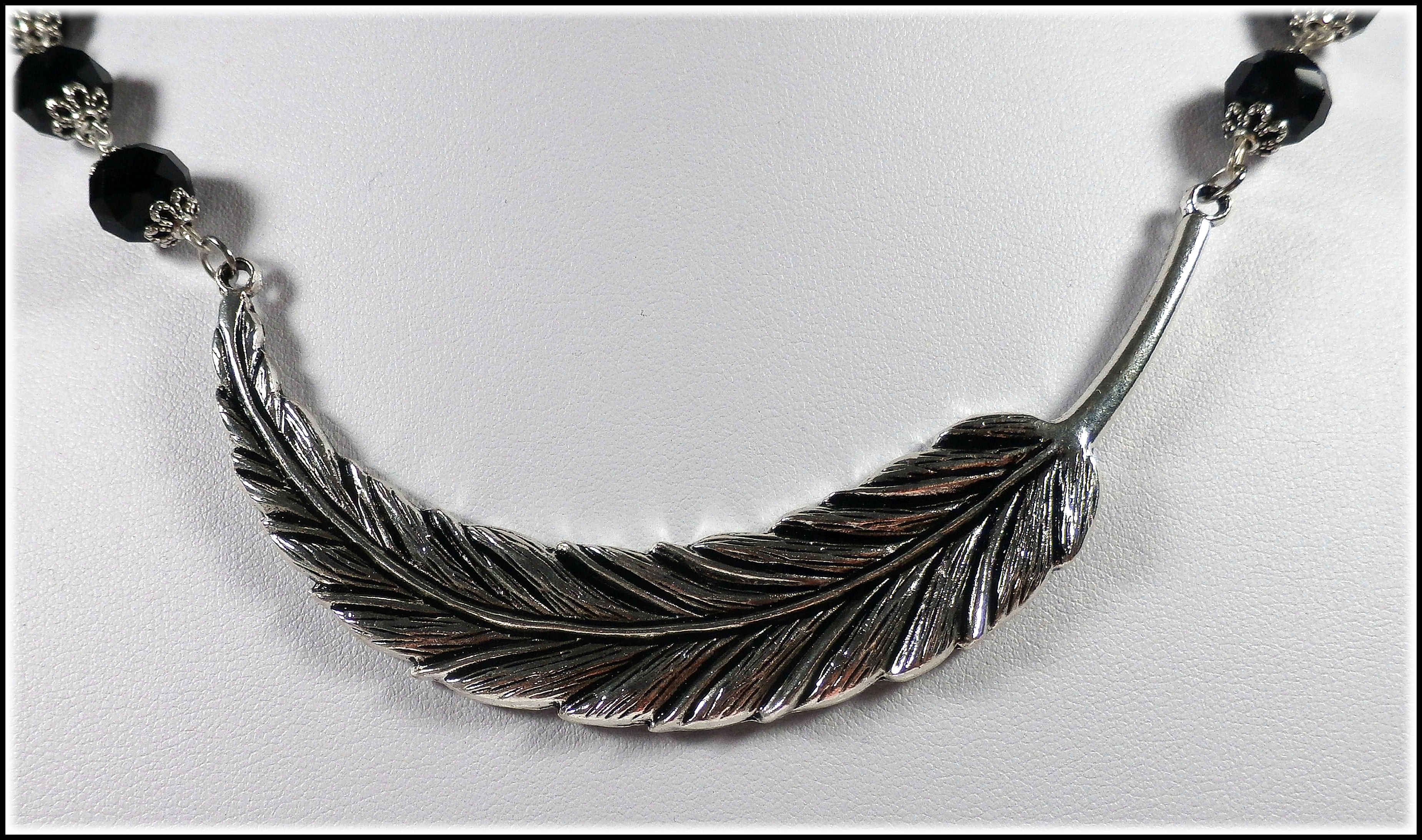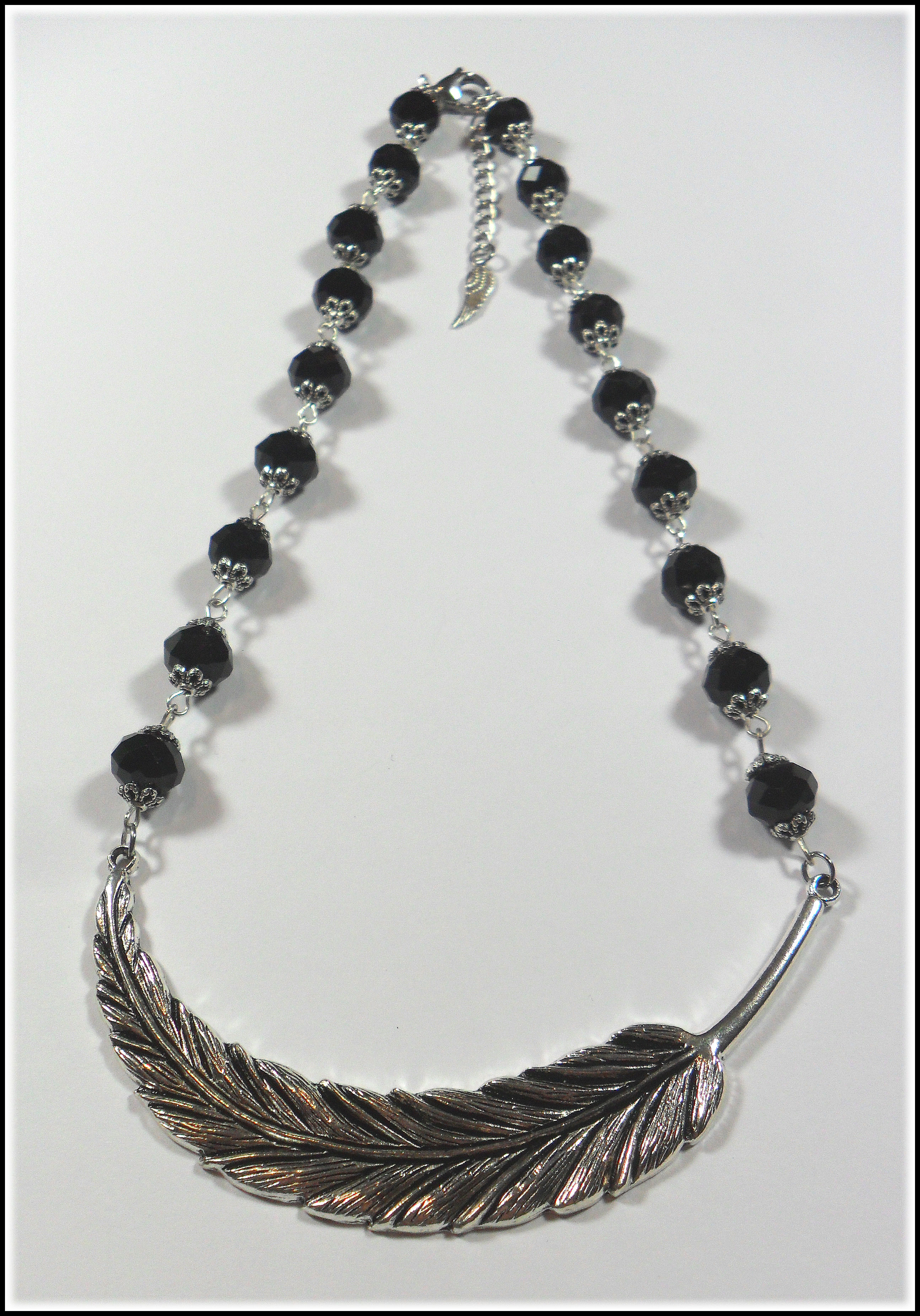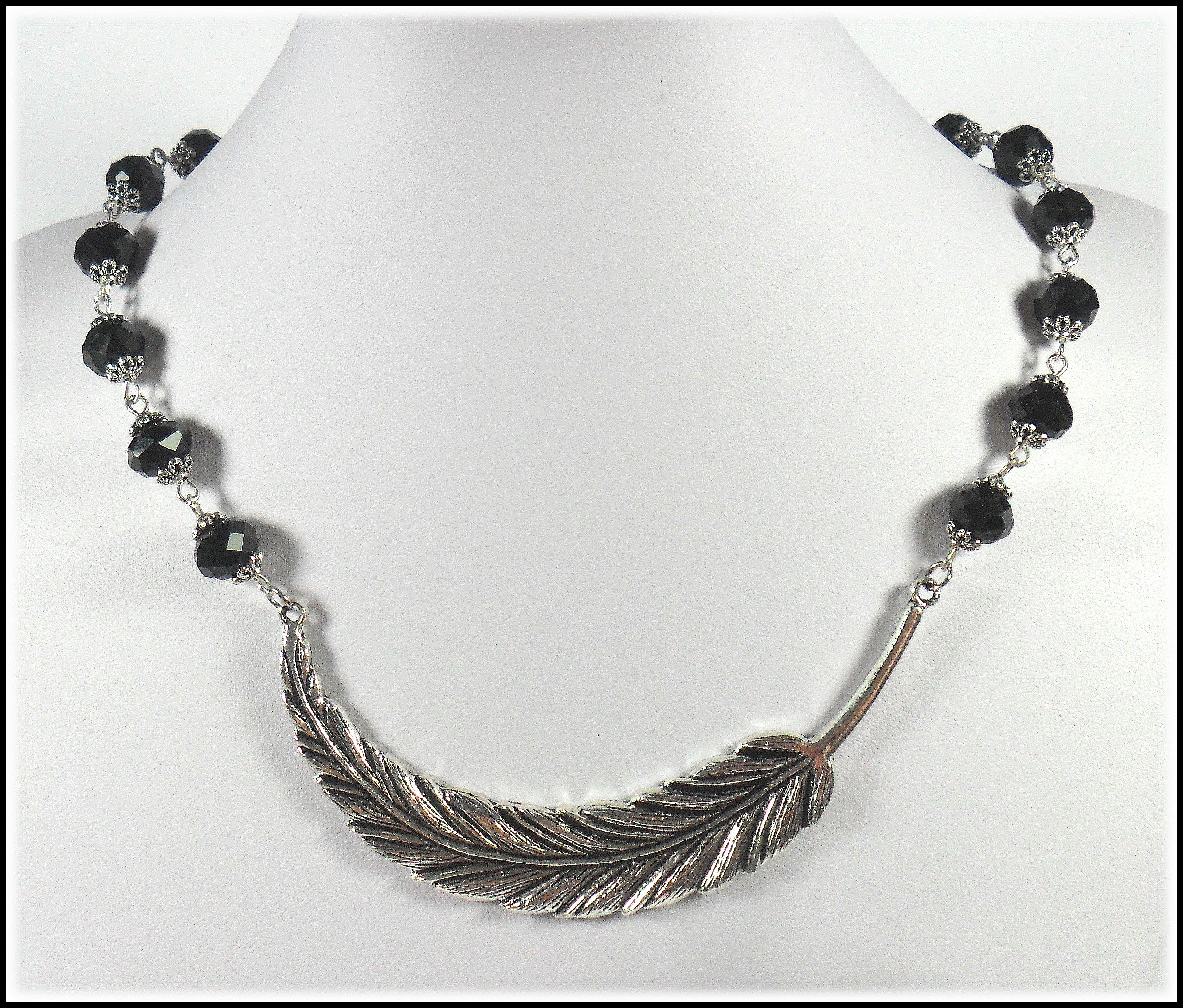 Rabenschwarze, facettierte Glasperlen und eine große (Raben-)Feder… daraus ist ein traumschönes, geheimnisvolles und fast schon mystisches Collier entstanden.