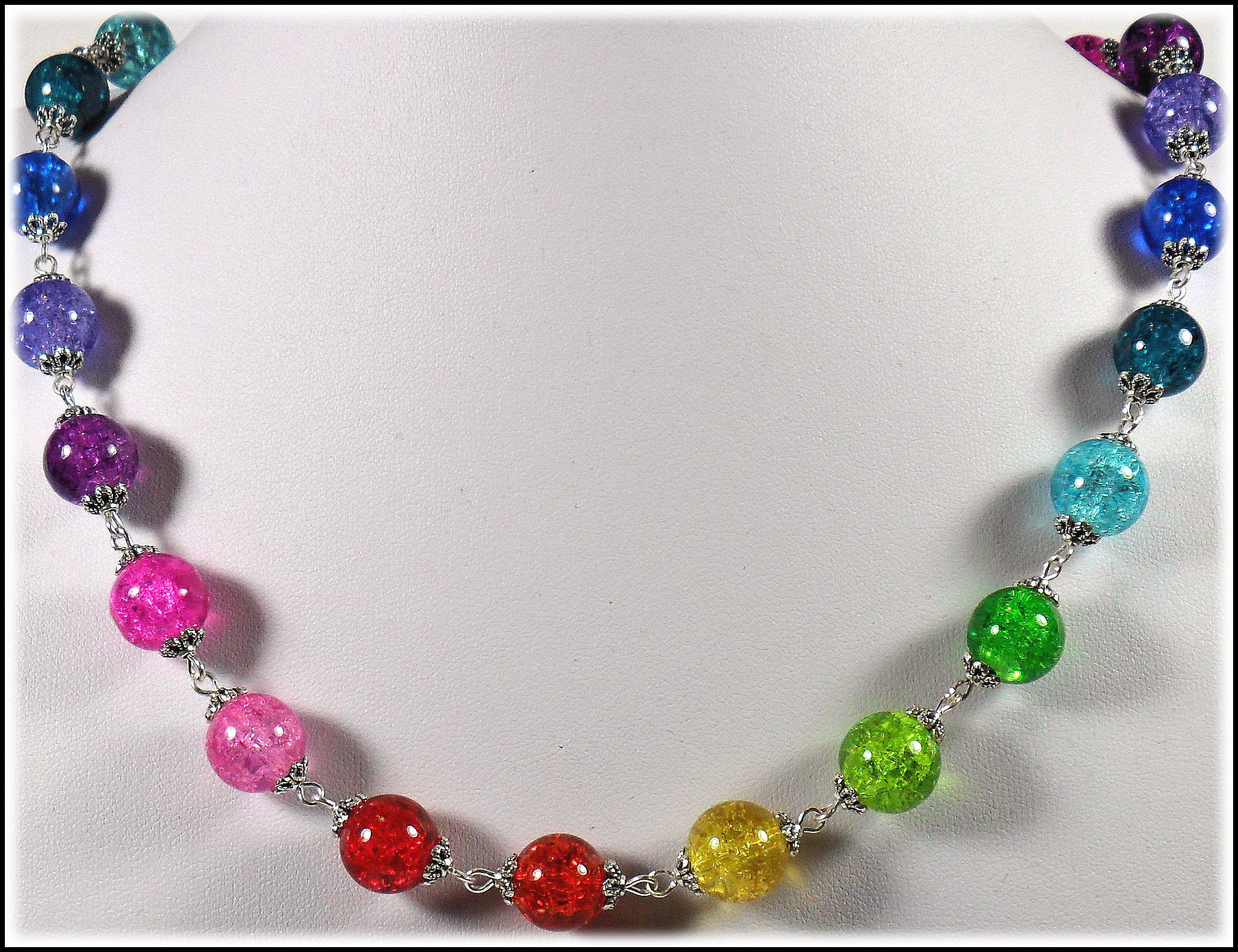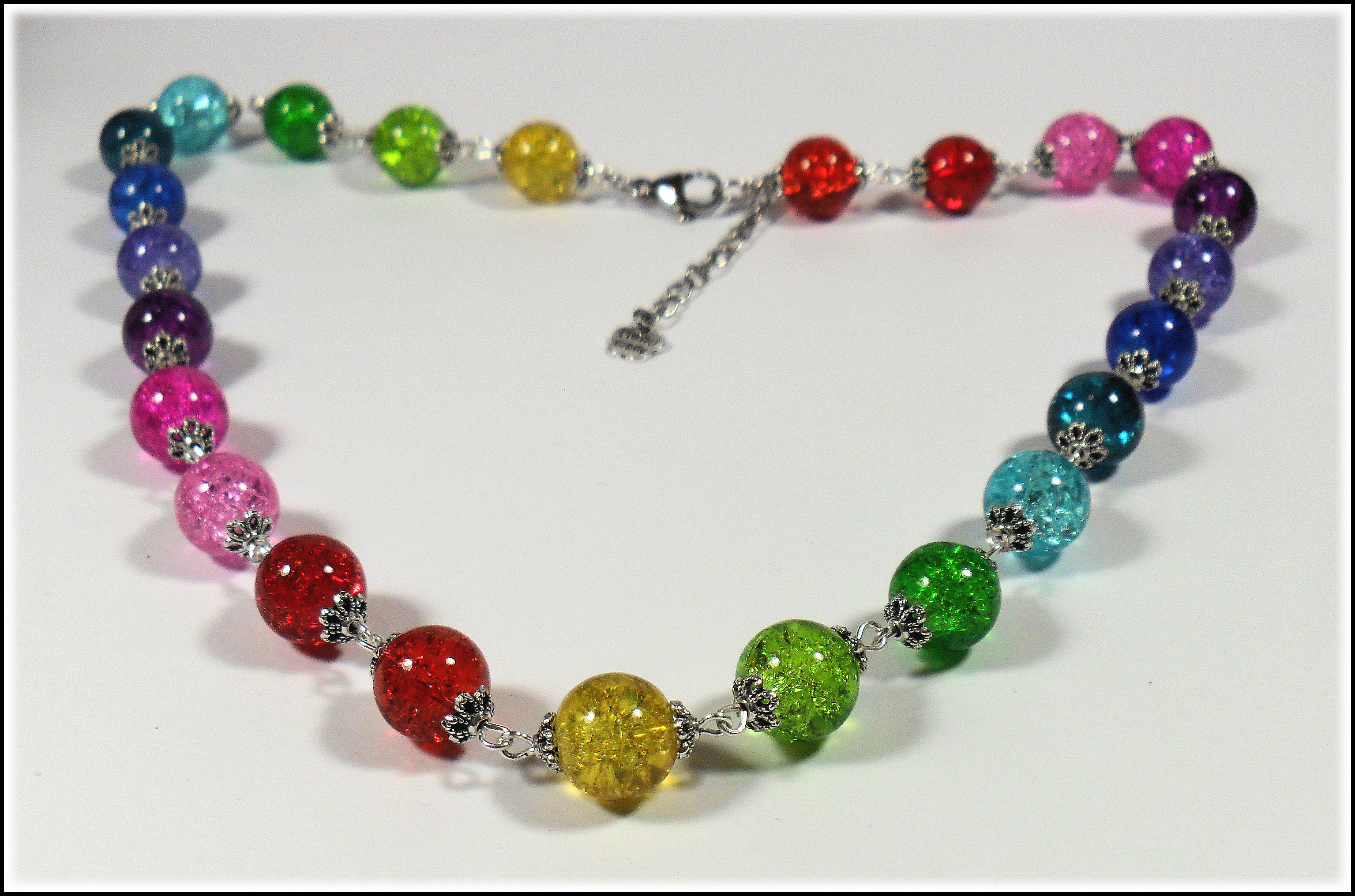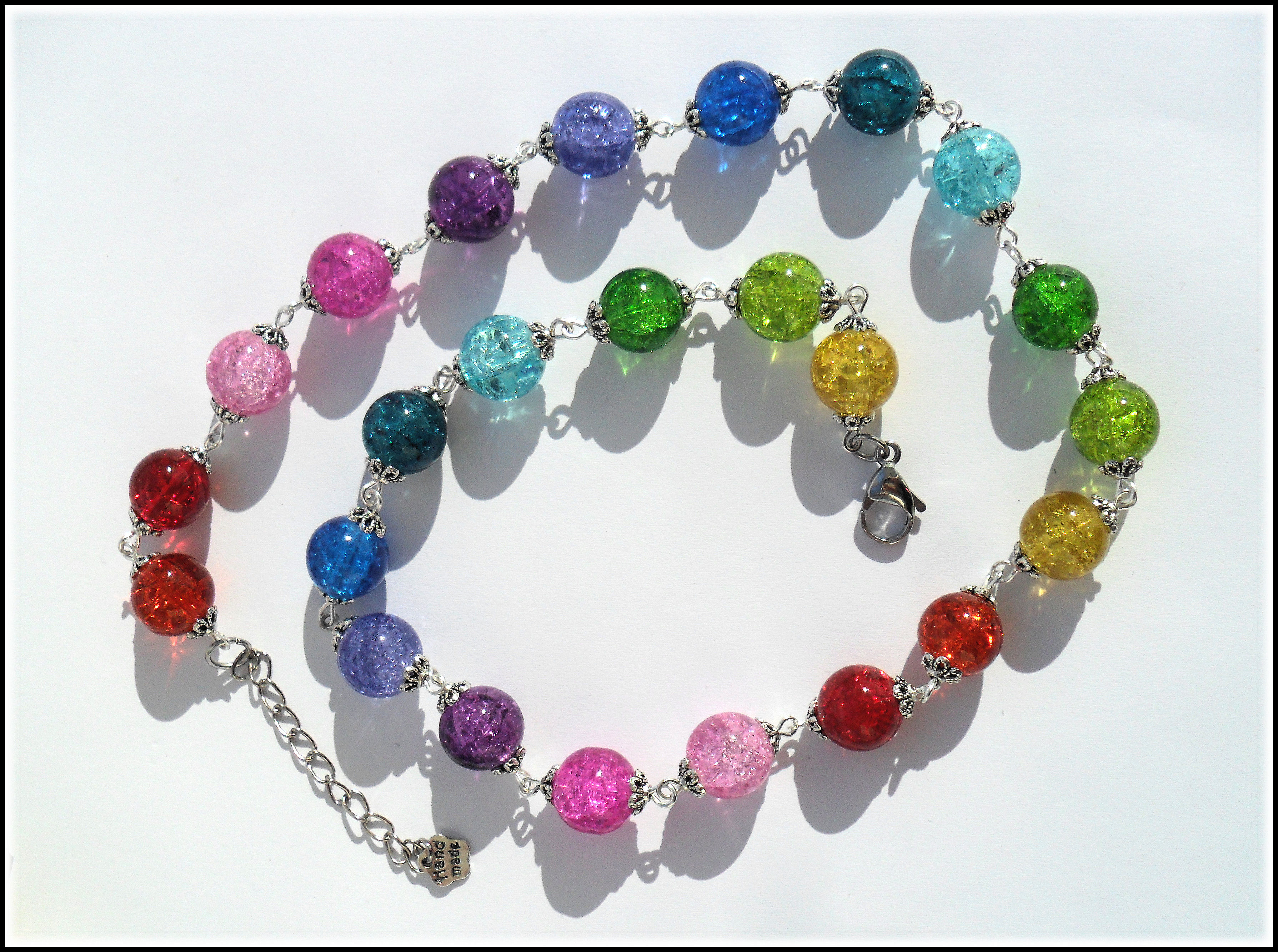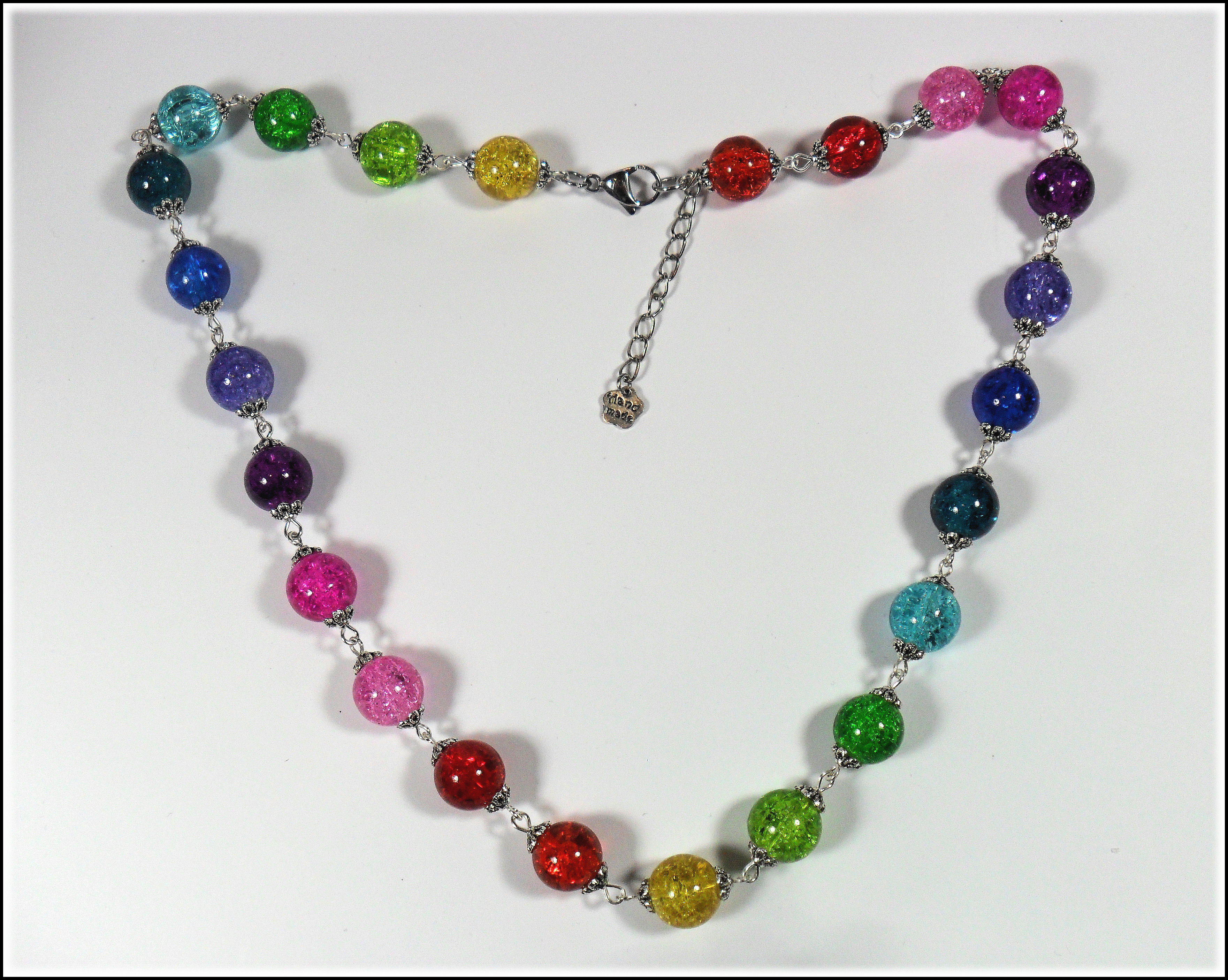 Außerordentlich schöne Crackle-Perlen in allen Farben des Regenbogens, gefasst in Perlkappen aus Tibetsilber – ein wahrer Klunkerschatz ist dieses herrliche Collier, bunt, fröhlich und einmalig!