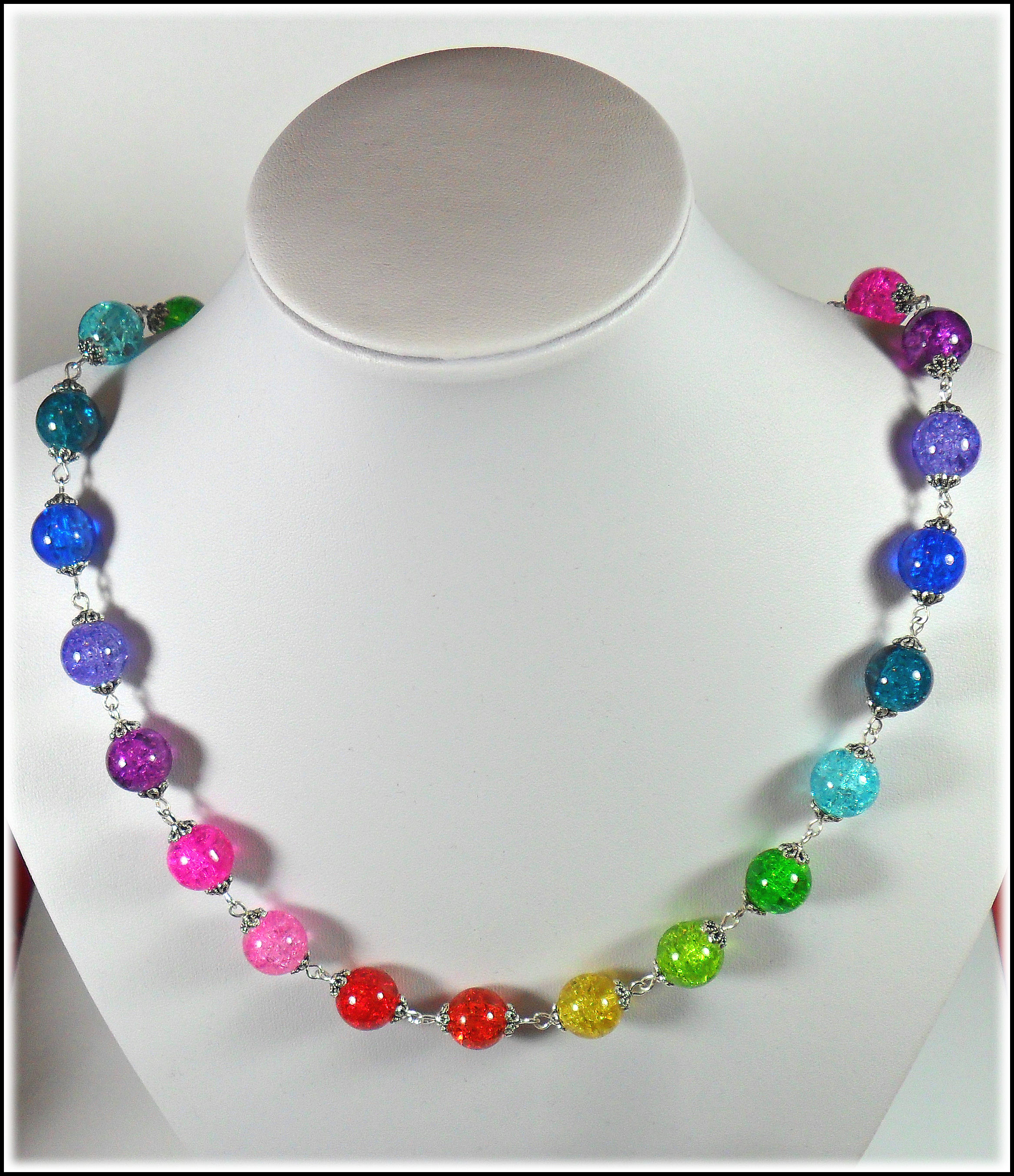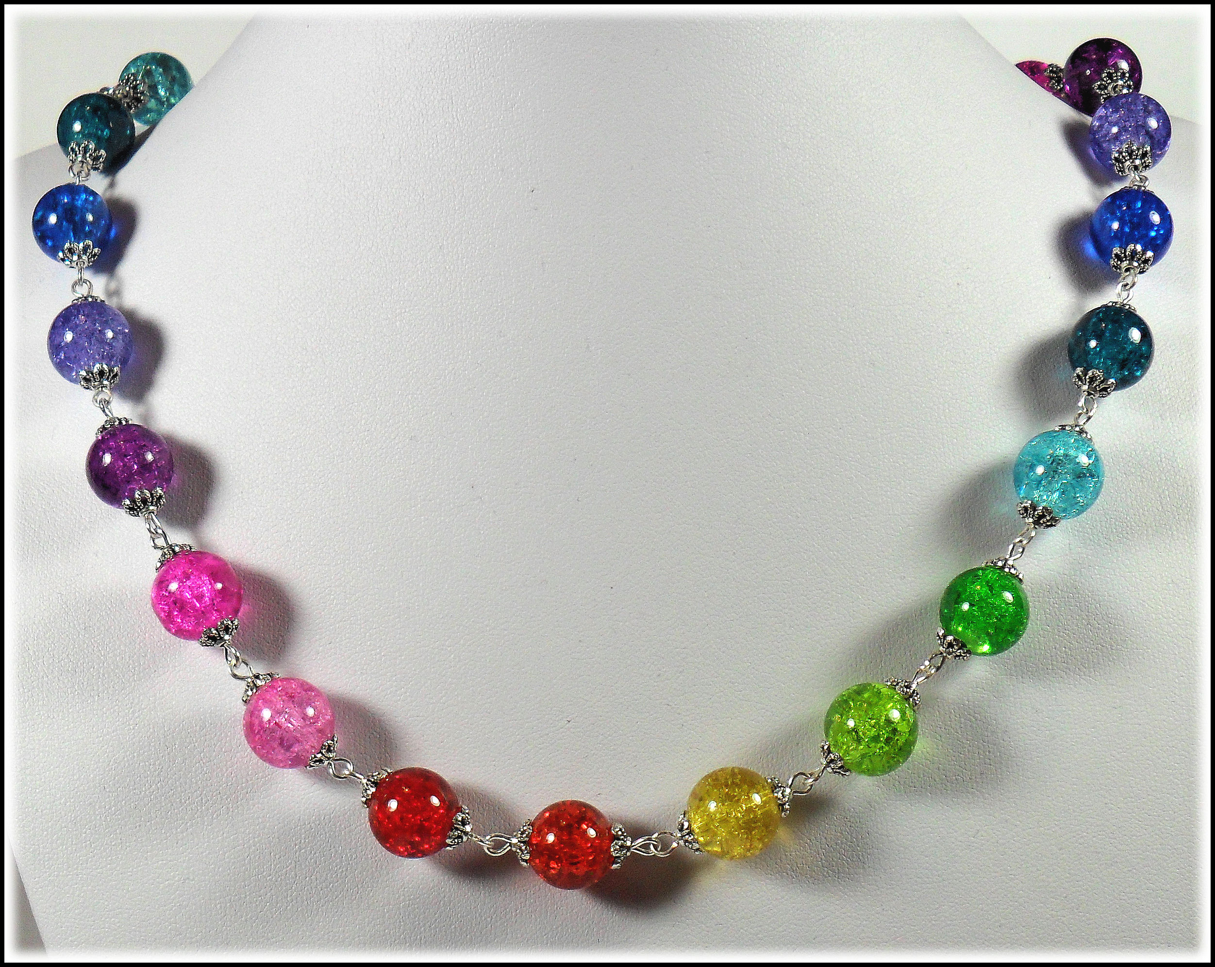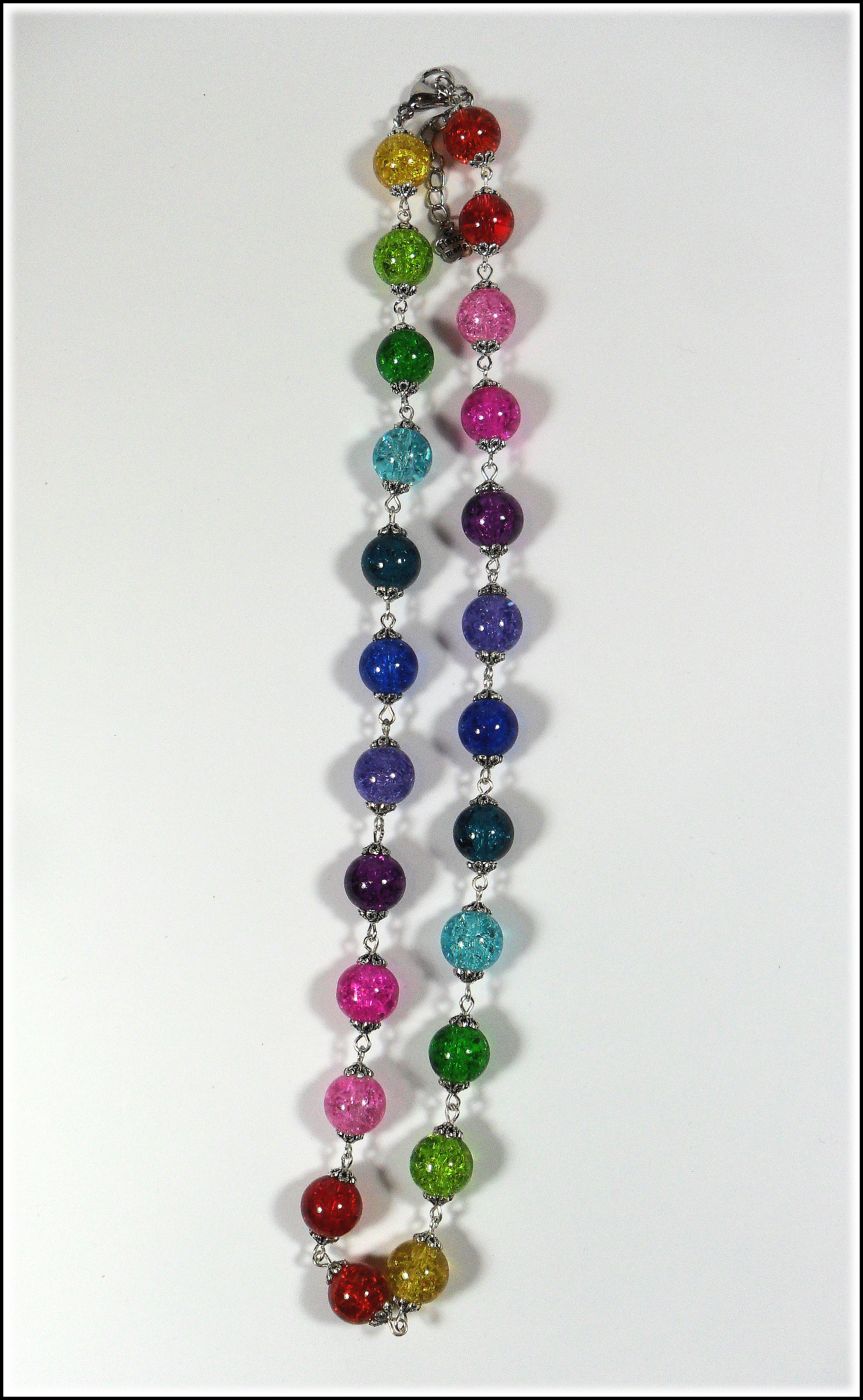 Außerordentlich schöne Crackle-Perlen in allen Farben des Regenbogens, gefasst in Perlkappen aus Tibetsilber – ein wahrer Klunkerschatz ist dieses herrliche Collier, bunt, fröhlich und einmalig!