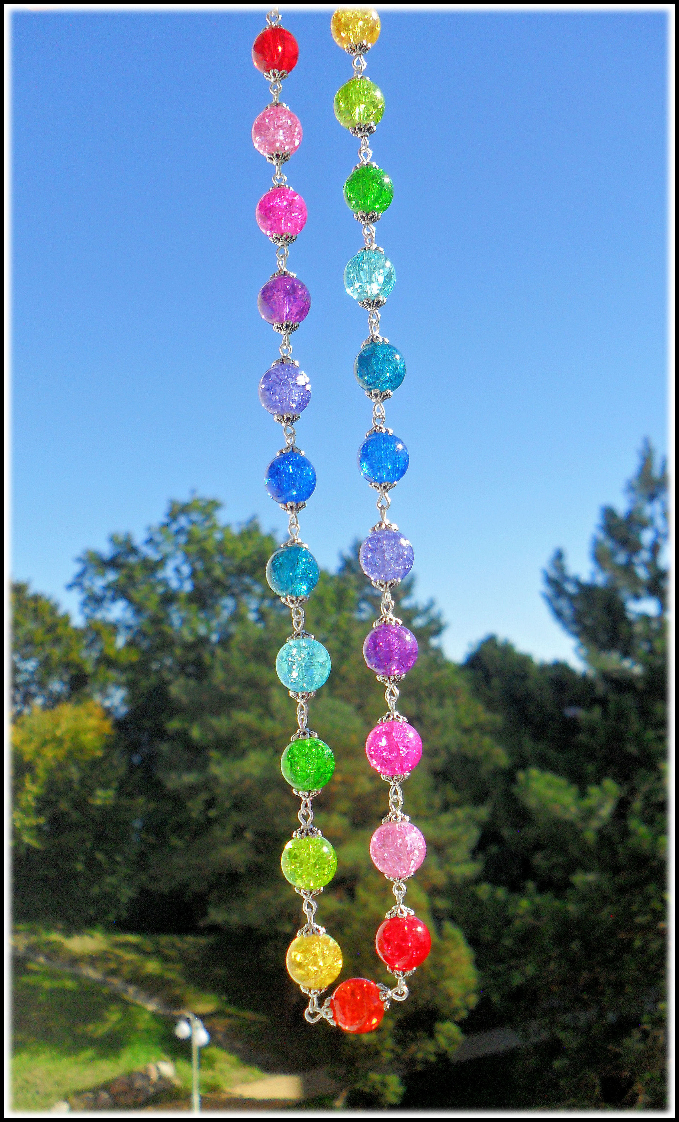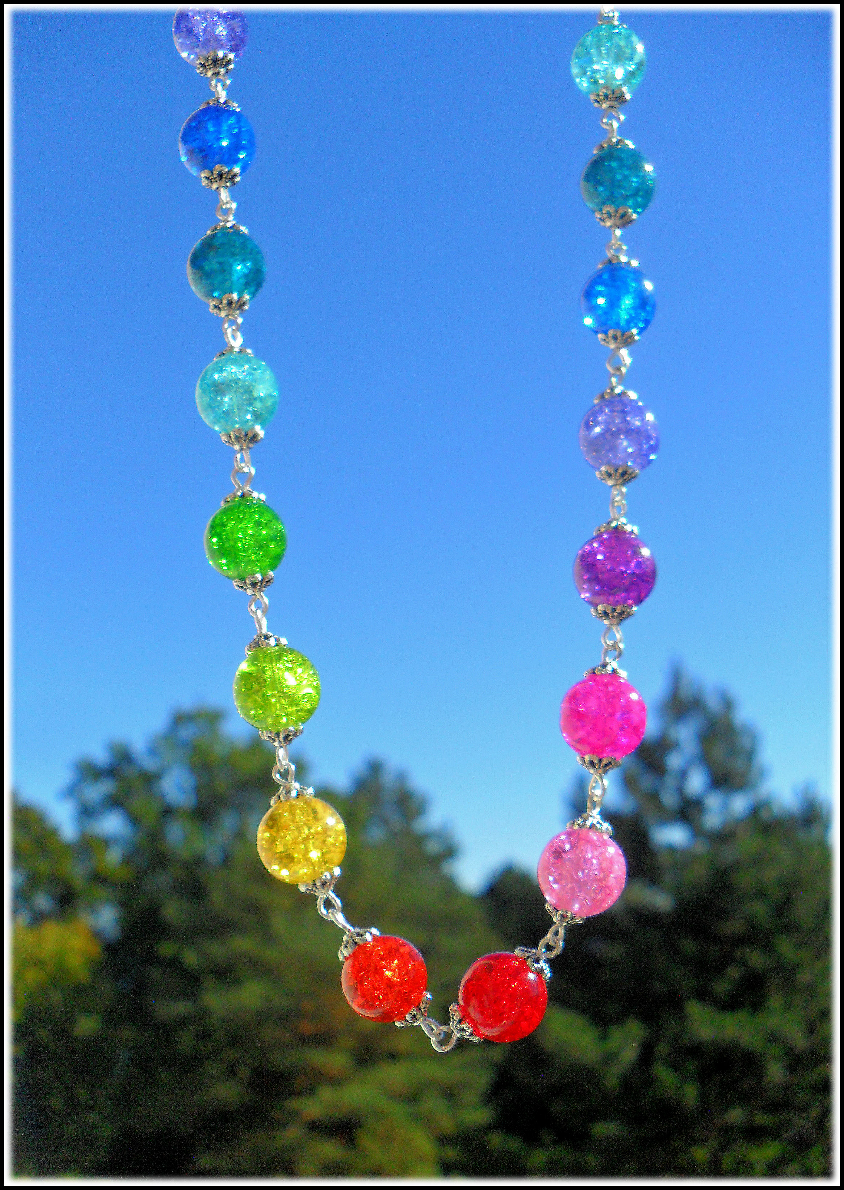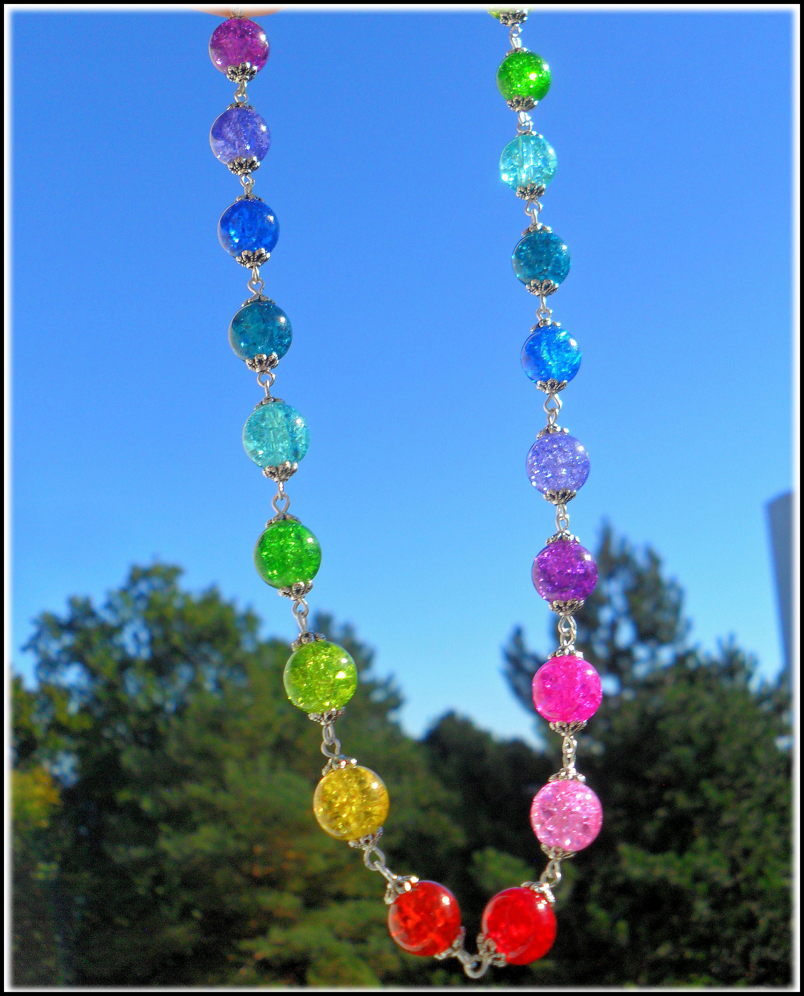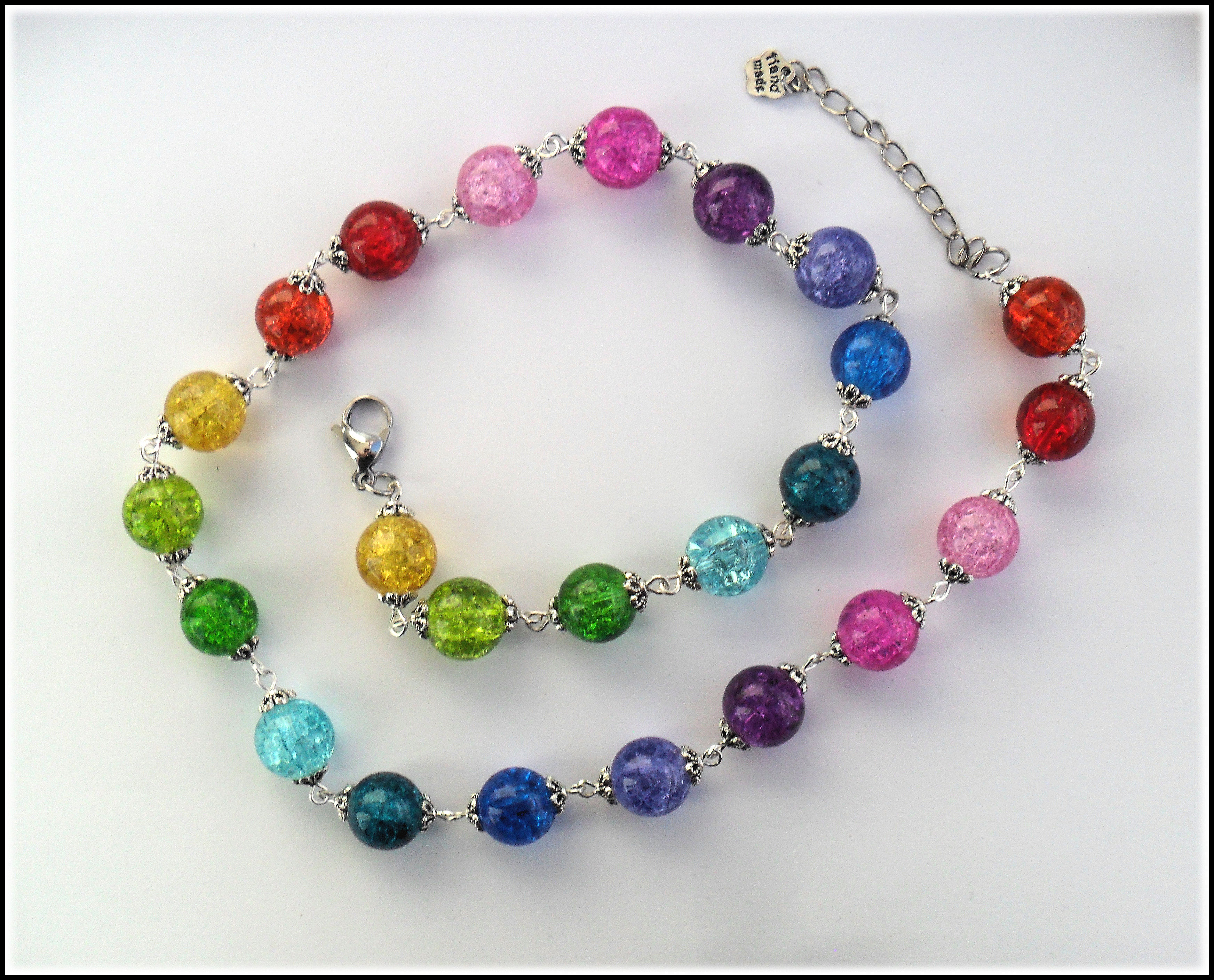 Außerordentlich schöne Crackle-Perlen in allen Farben des Regenbogens, gefasst in Perlkappen aus Tibetsilber – ein wahrer Klunkerschatz ist dieses herrliche Collier, bunt, fröhlich und einmalig!