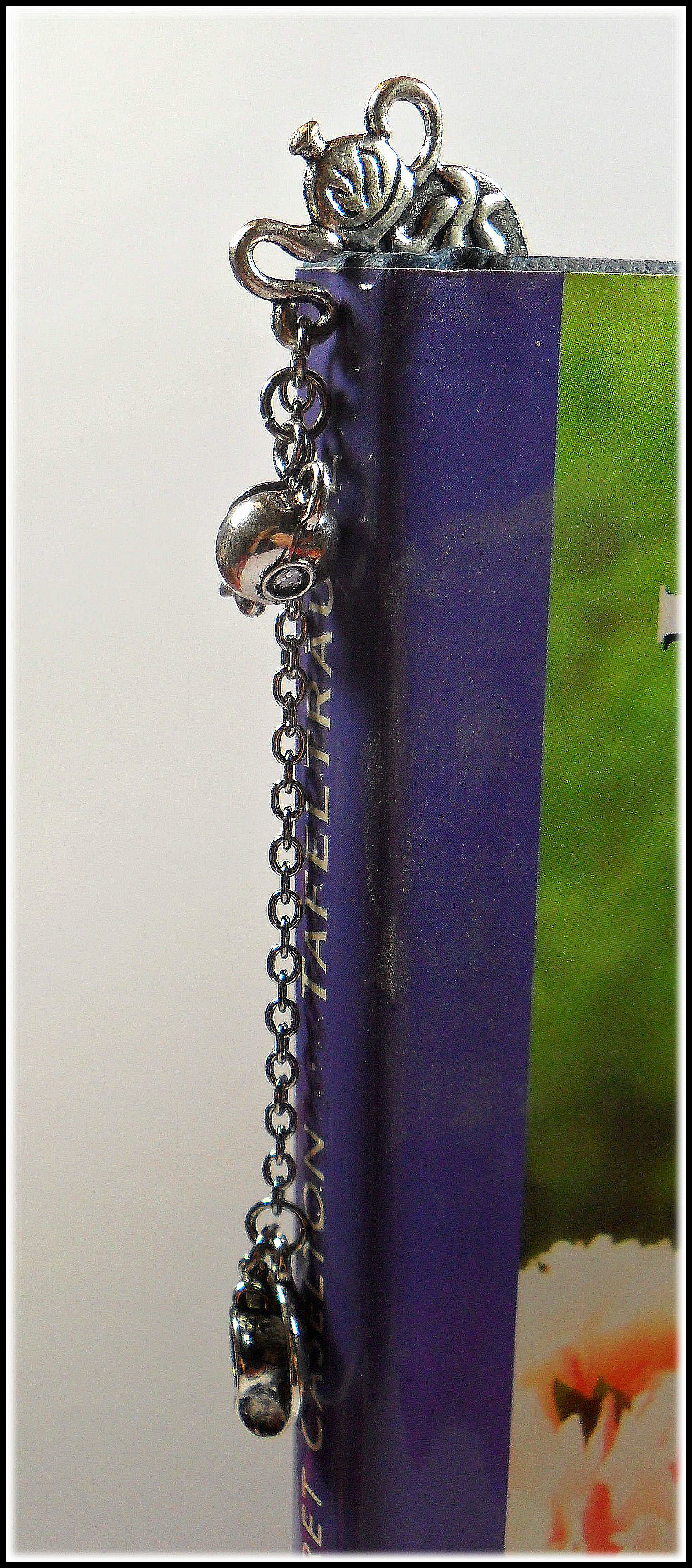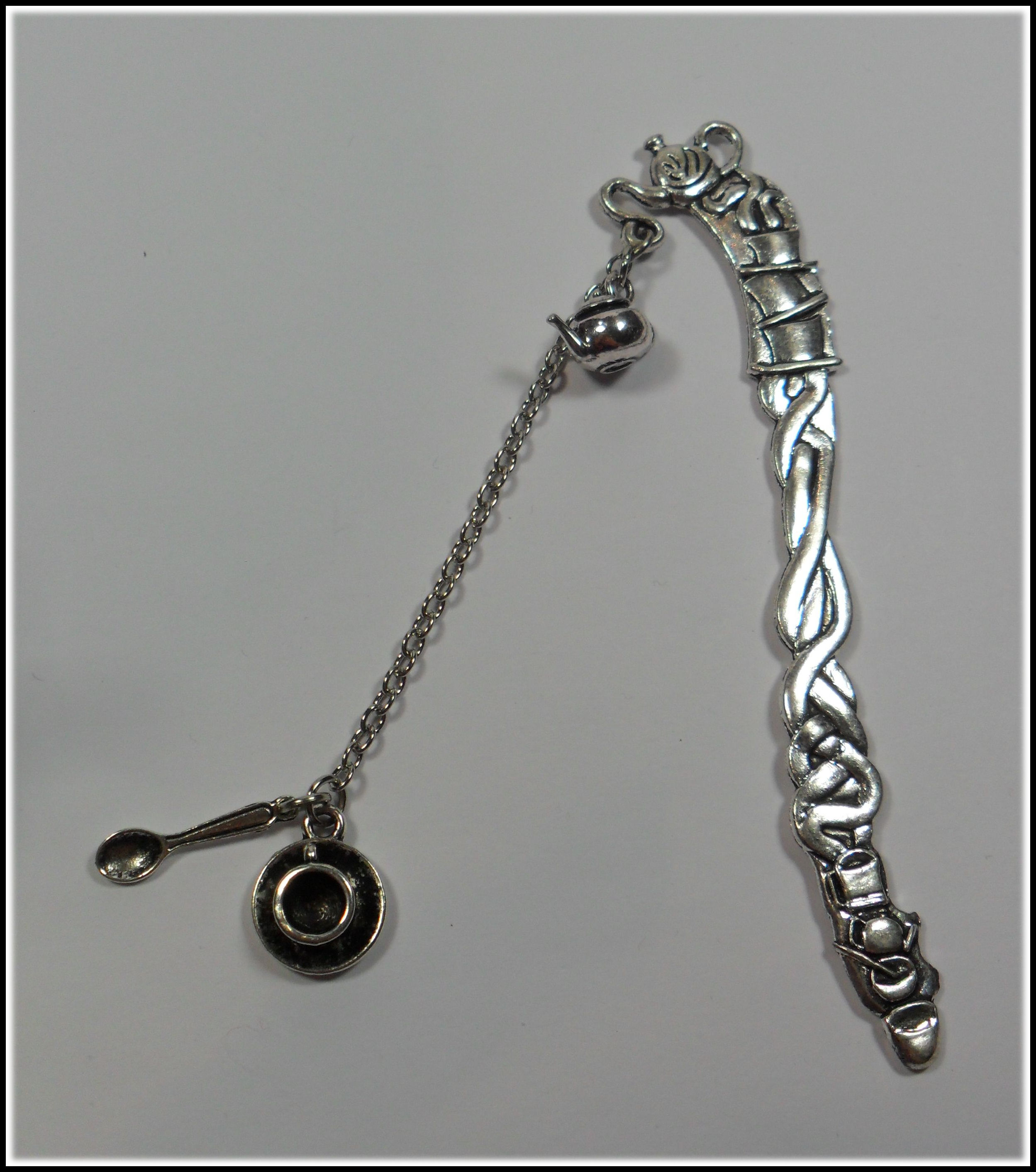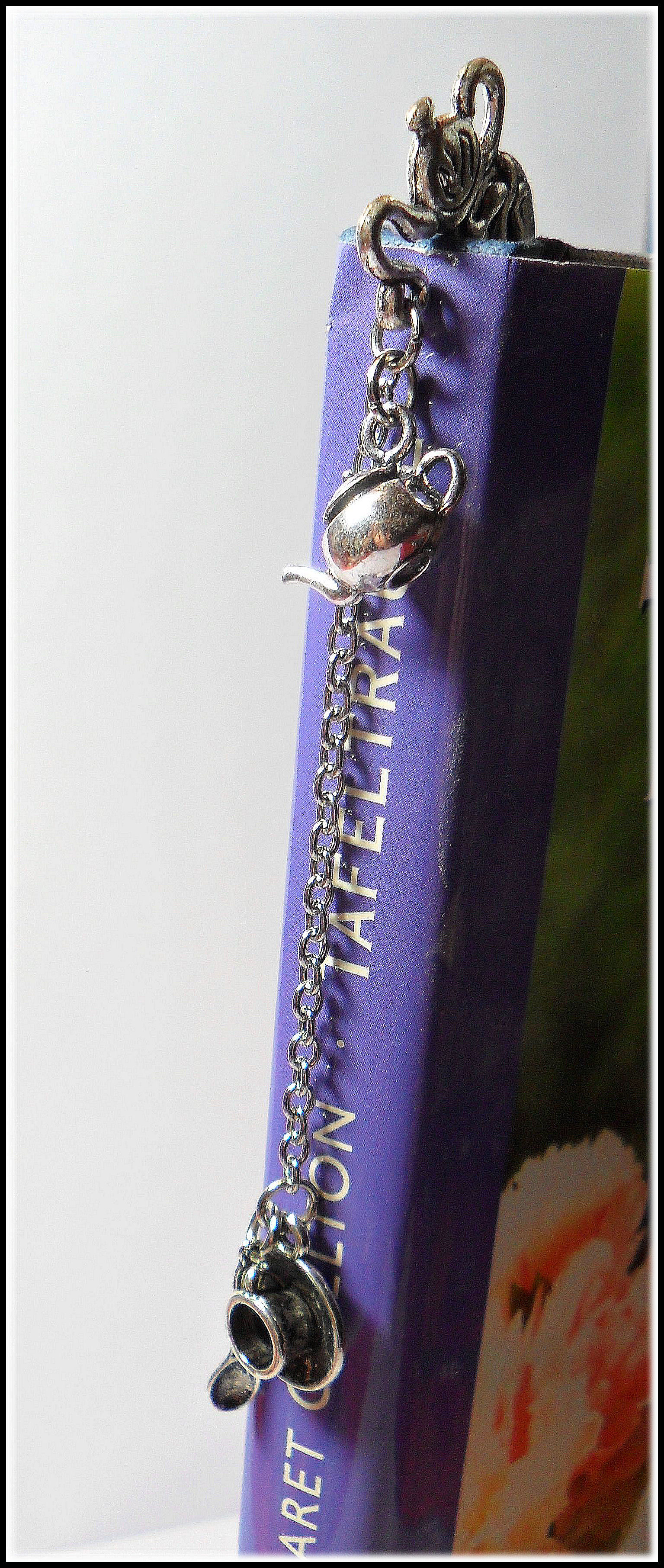 Schon das Lesezeichen selbst ist liebevollst gestaltet; da finden sich gestapeltes Teegeschirr und schließlich ganz oben eine süße Teekanne, aus der sich die Kette und weitere hübsche Charms ergießen. Da findet sich eine naturgetreue, bauchige Teekanne und am unteren Ende der Kette eine Tasse und ein Löffelchen. Das alles harmoniert so perfekt mit einander, dass jedes Lesezeichen für sich zu einem kleinen Kunstwerk wird.