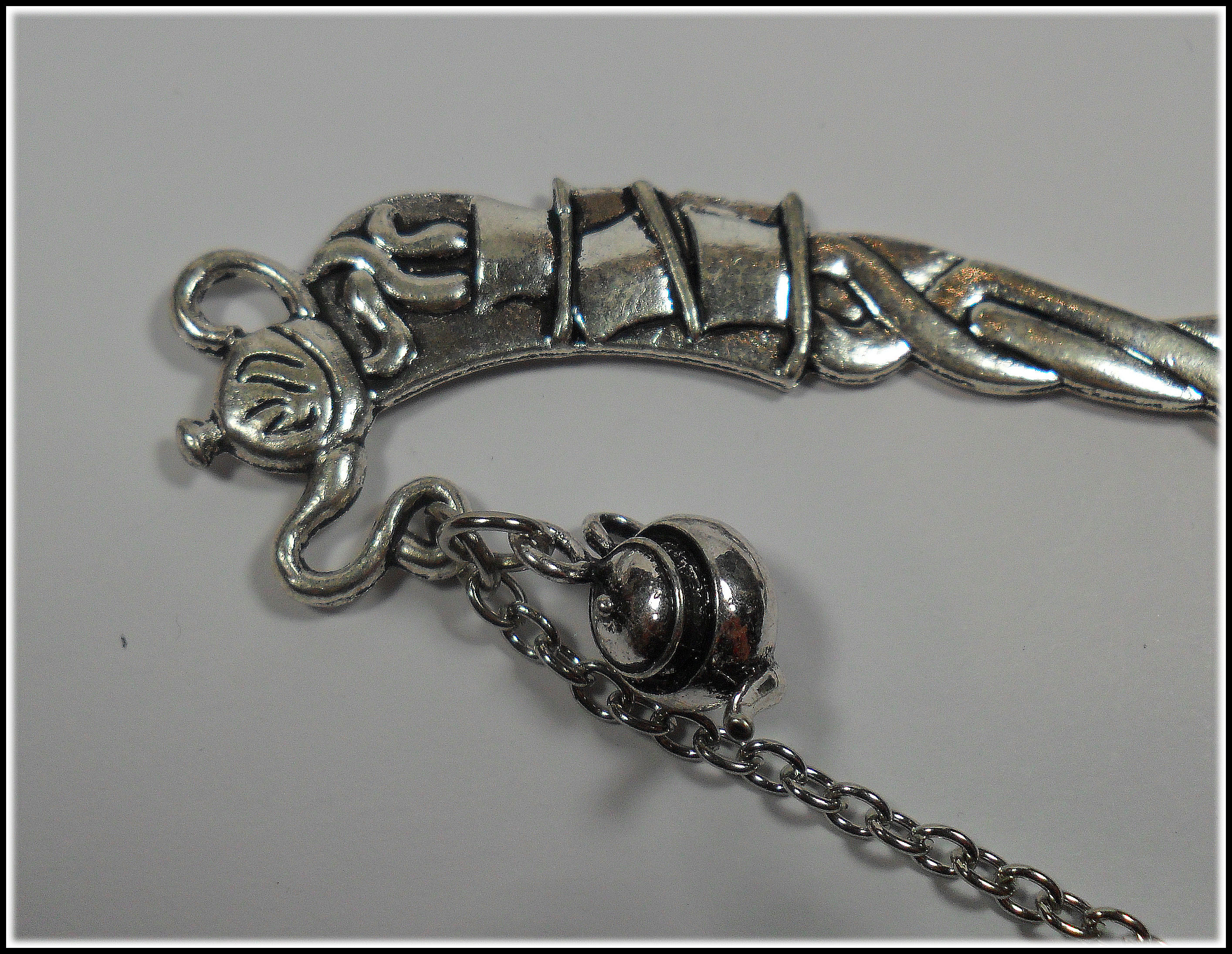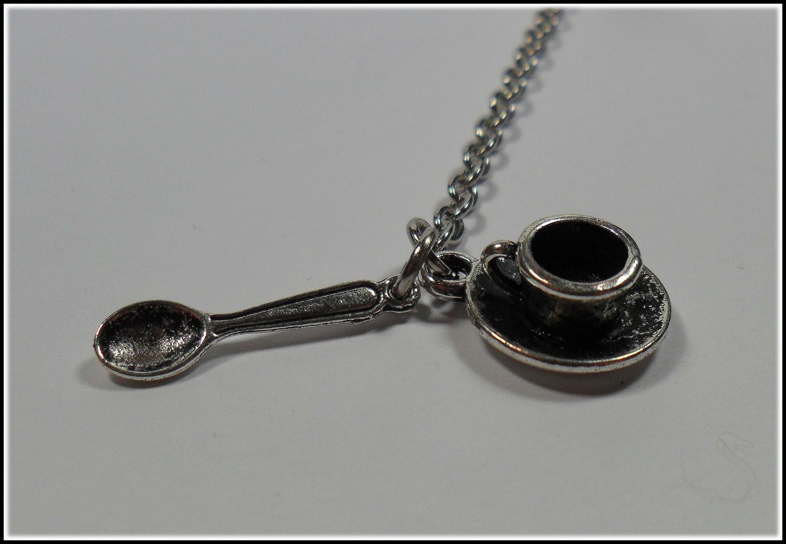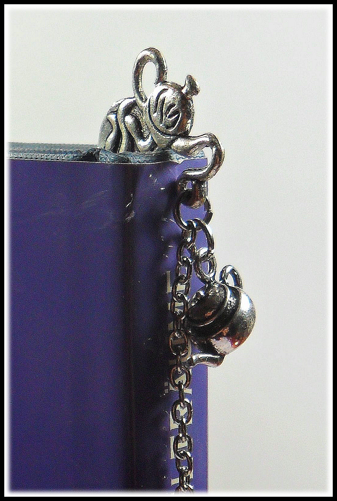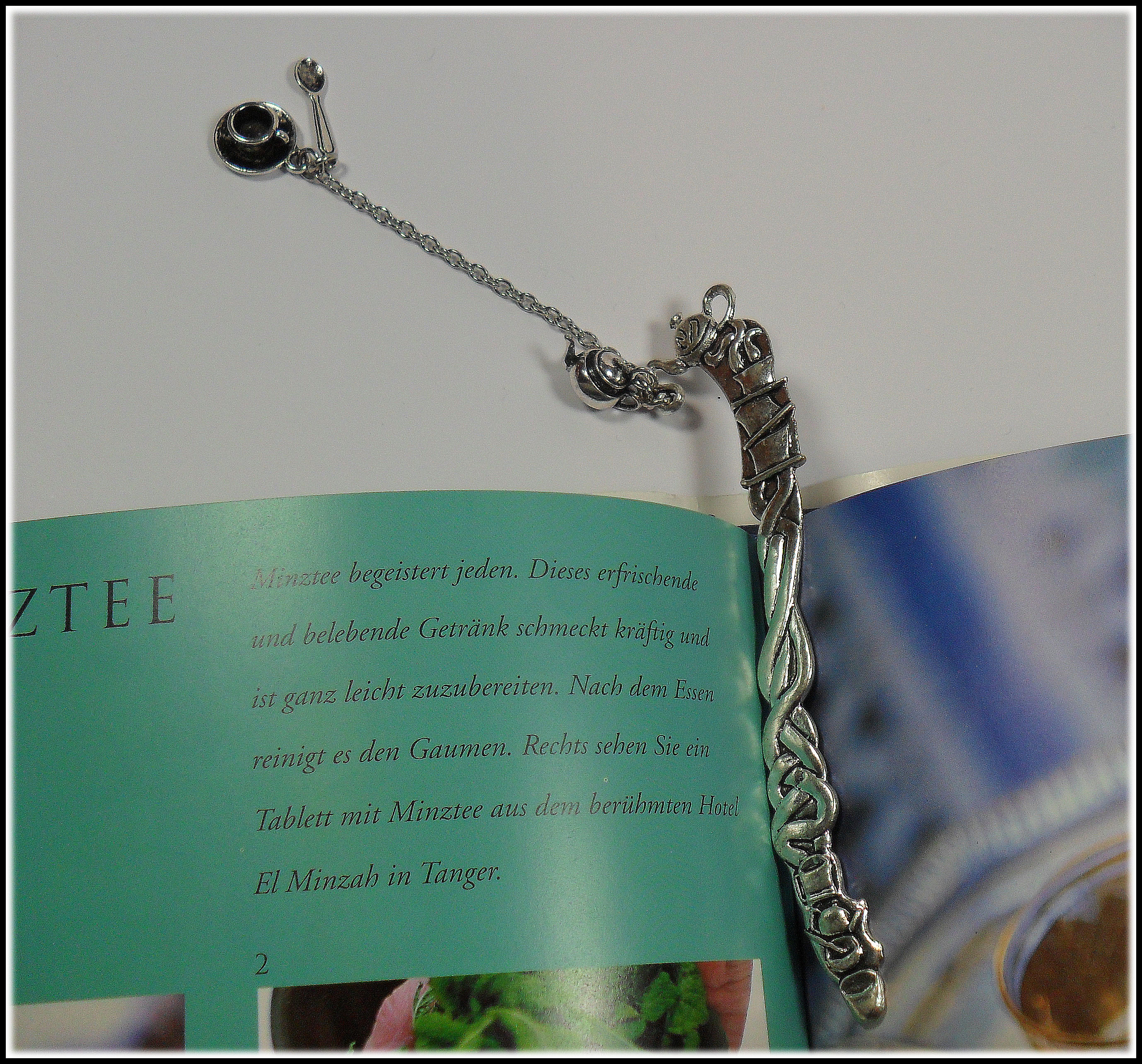 Schon das Lesezeichen selbst ist liebevollst gestaltet; da finden sich gestapeltes Teegeschirr und schließlich ganz oben eine süße Teekanne, aus der sich die Kette und weitere hübsche Charms ergießen. Da findet sich eine naturgetreue, bauchige Teekanne und am unteren Ende der Kette eine Tasse und ein Löffelchen. Das alles harmoniert so perfekt mit einander, dass jedes Lesezeichen für sich zu einem kleinen Kunstwerk wird.