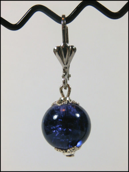 Die große Crackle-Glasperle in der geheimnisvollen Farbe „Mitternachtsviolett“, die in diesen Ohrringen verarbeitet wurde, reflektiert das Licht – ganz gleich, ob Sonnen- oder Kunstlicht – besonders schön.