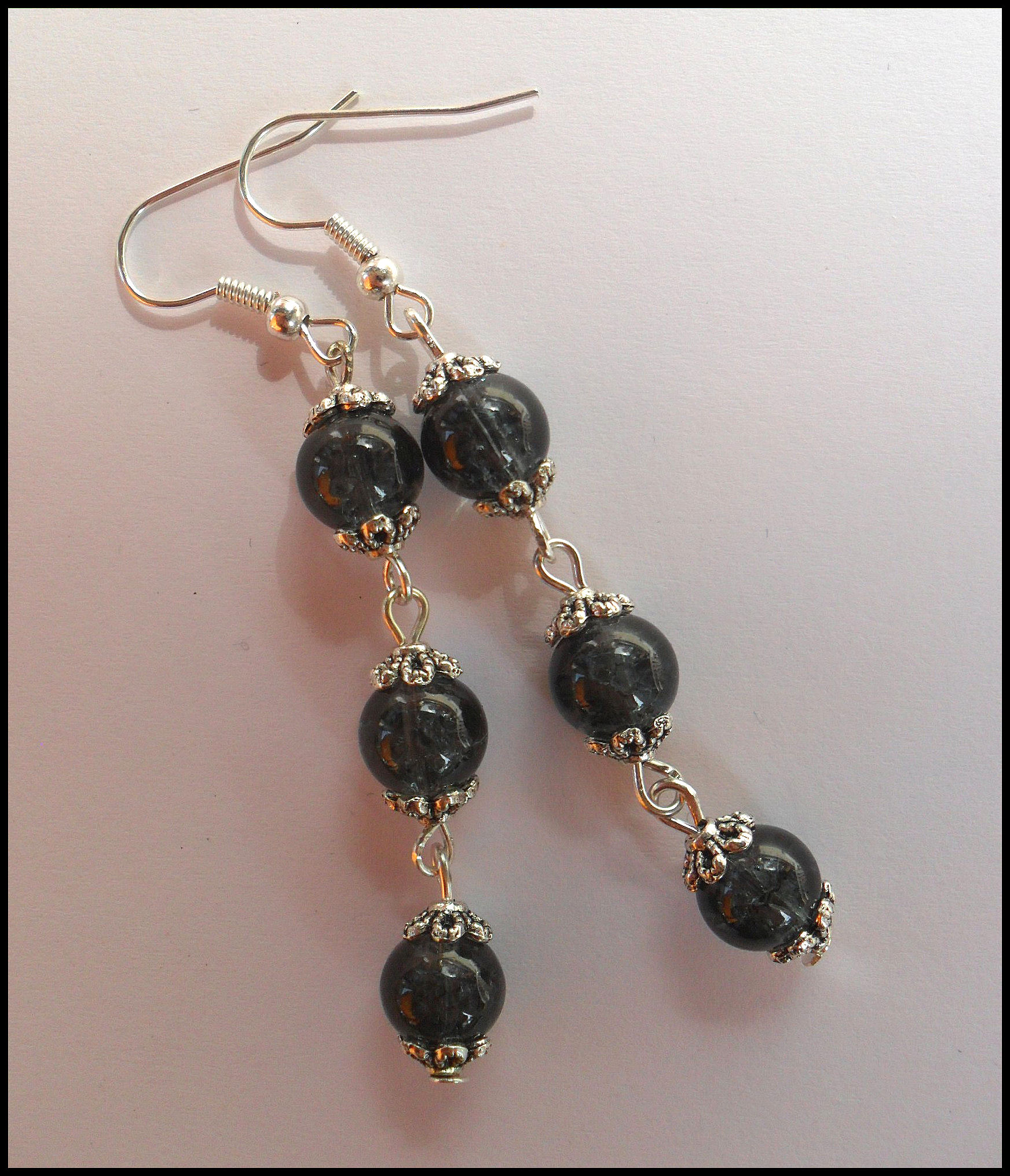 Ohrhänger aus jeweils drei 8 mm großen Crackle-Perlen, gefasst in Perlkappen aus Tibetsilber.