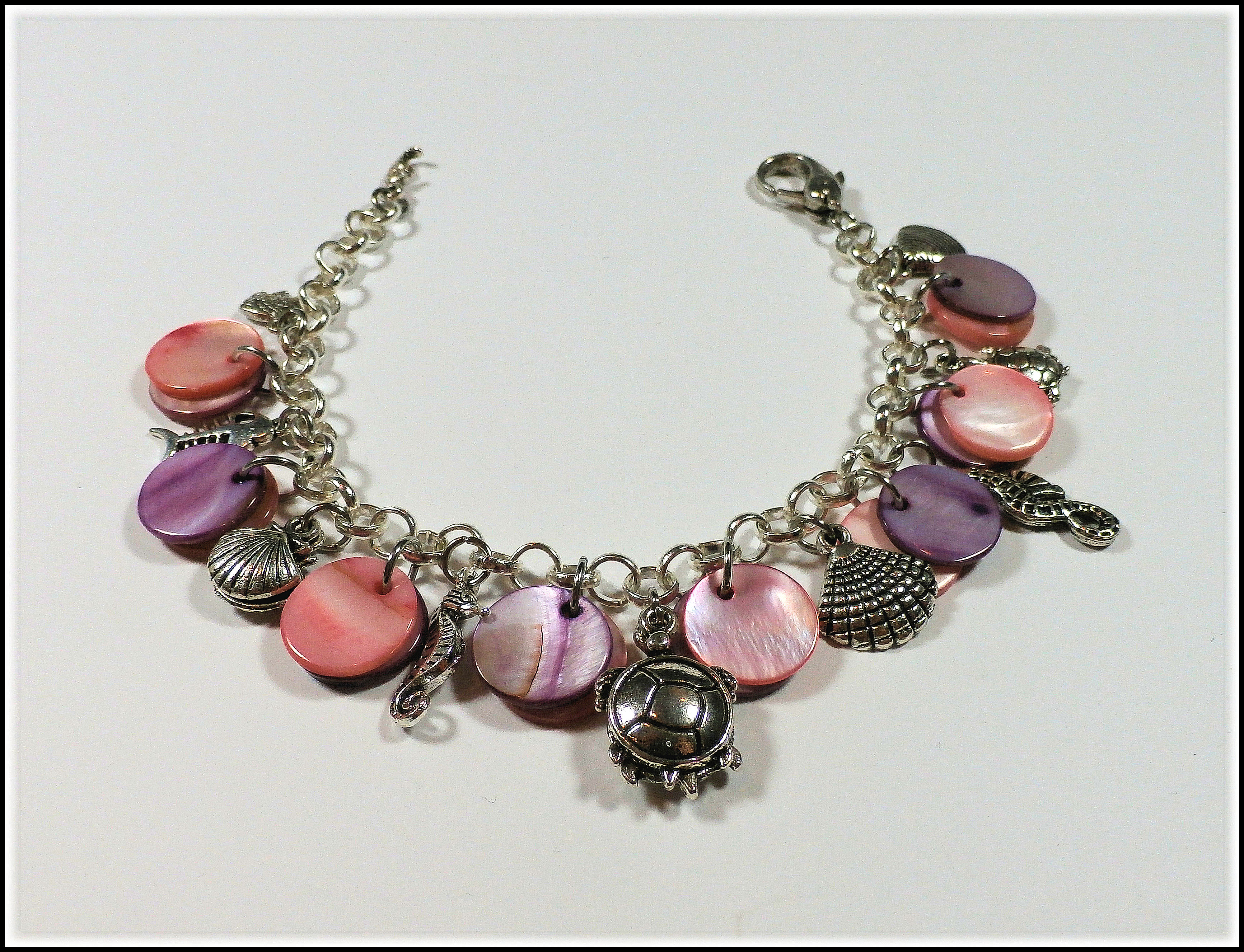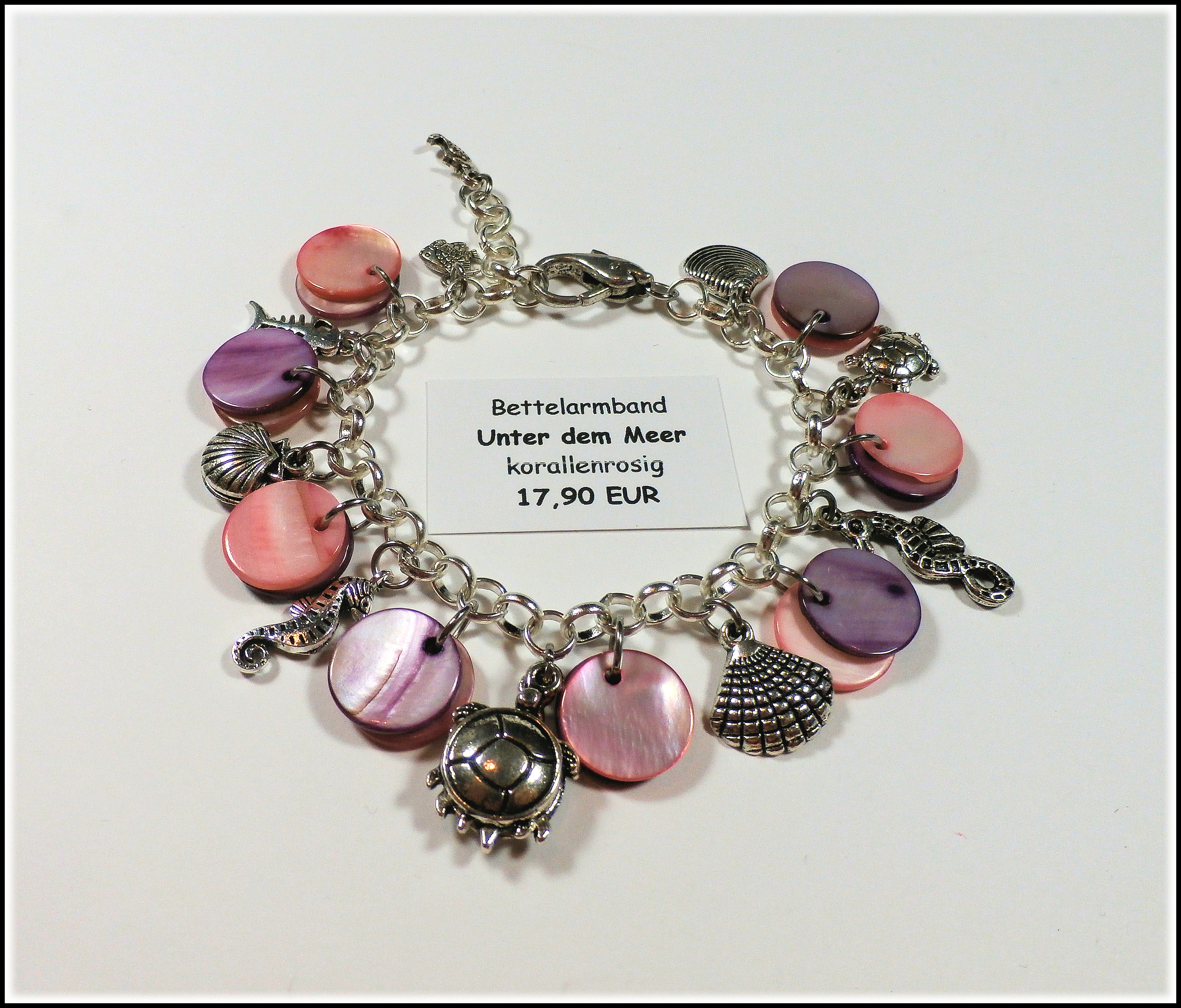 Hier ist ein besonders schönes Set entstanden aus verschiedenen maritimen Charmanhängern und großen Perlmuttscheiben in rosé und lila.