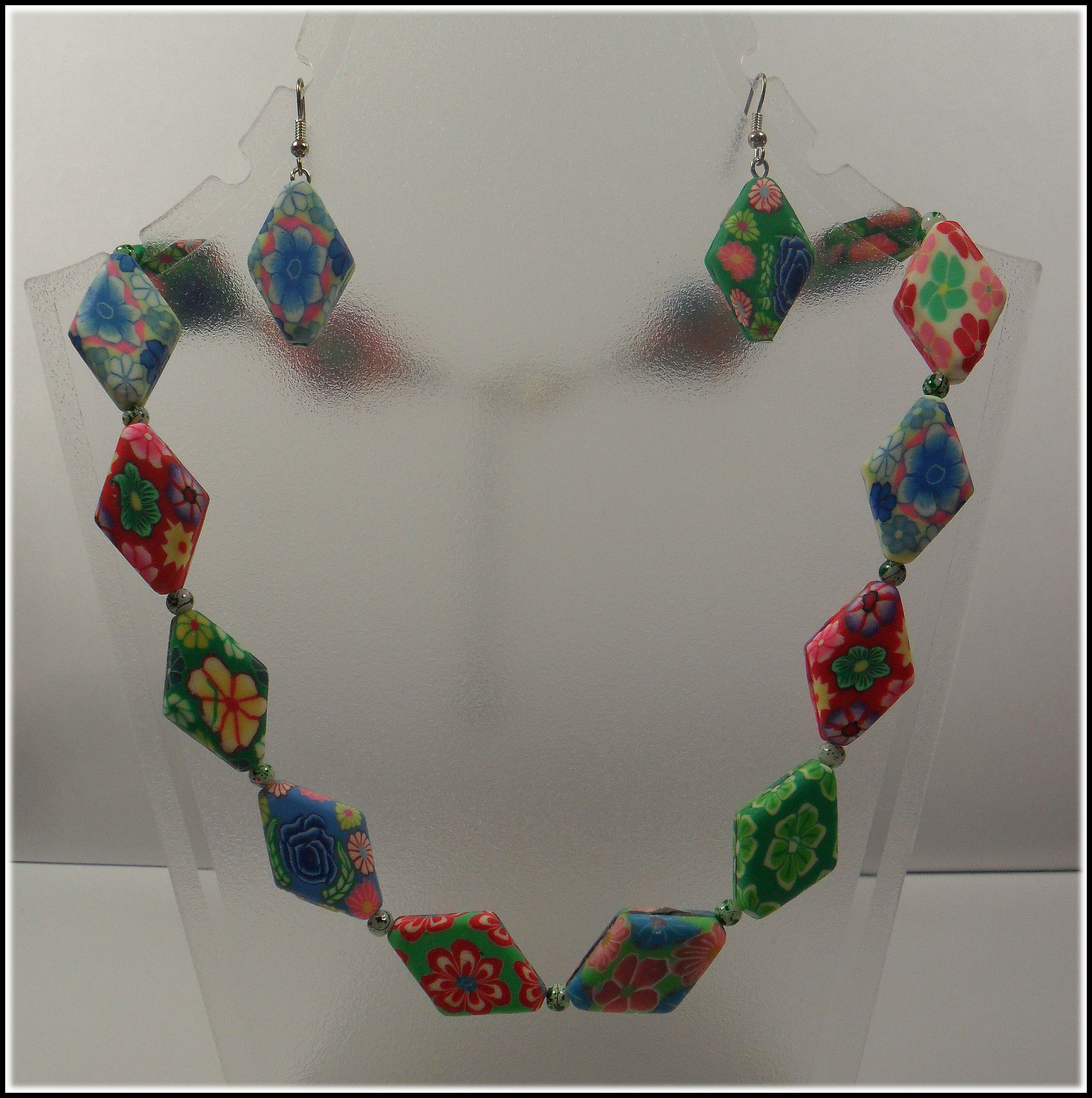 Einmalig schöne, phantasievolle Rauten aus Clay Ton (vergleichbar mit Fimo), jede für sich ein Unikat, und kleine Glasperlen (perfekt passend in Weiß mit grünen Sprenkeln) ergeben diesen wahren Klunkerschatz – ein wirklich außergewöhnliches Collier!