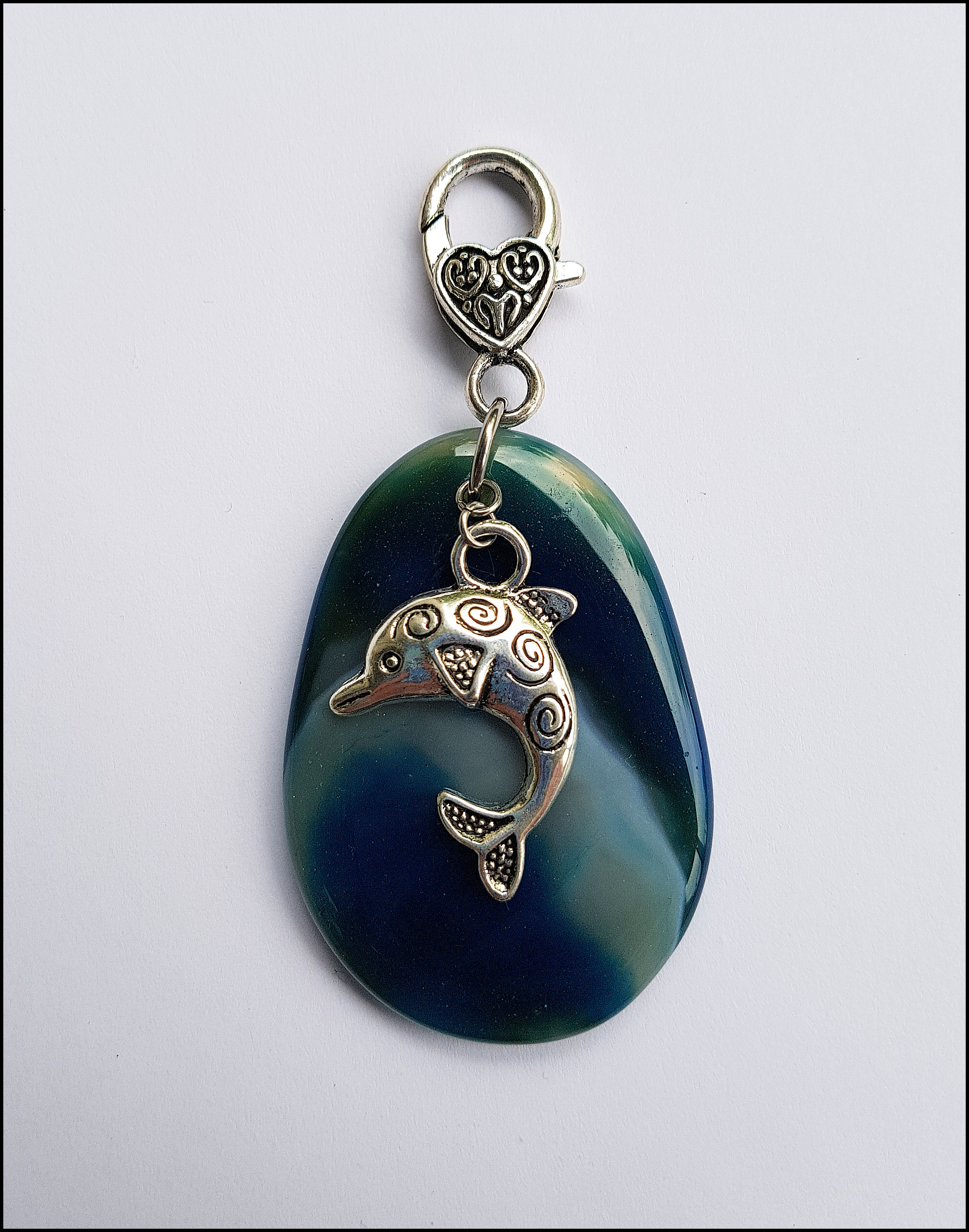 Ein großer Achatanhänger in Schattierungen von zartem Hellblau, sanftem Beige bis hin zu strahlendem Blau, mit schöner Zeichnung/Bänderung und ein Delfin, verarbeitet mit unserem schönsten Karabiner zu einem kraftvollen Schutzamulett.
