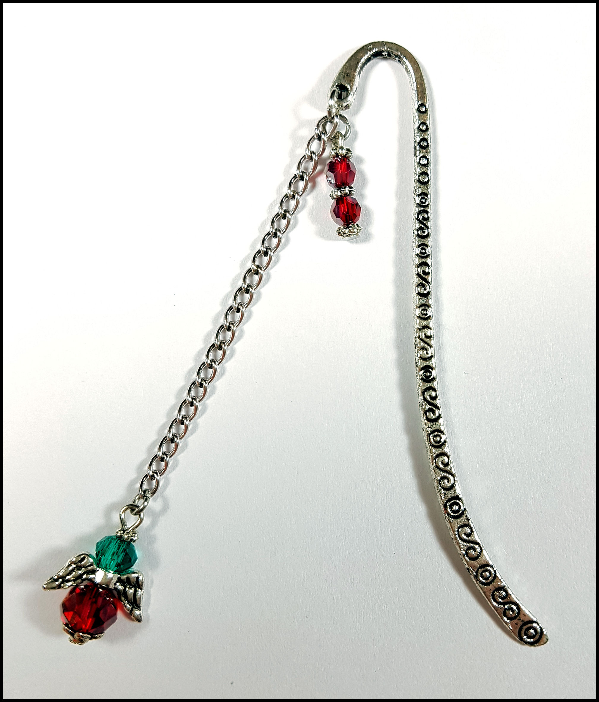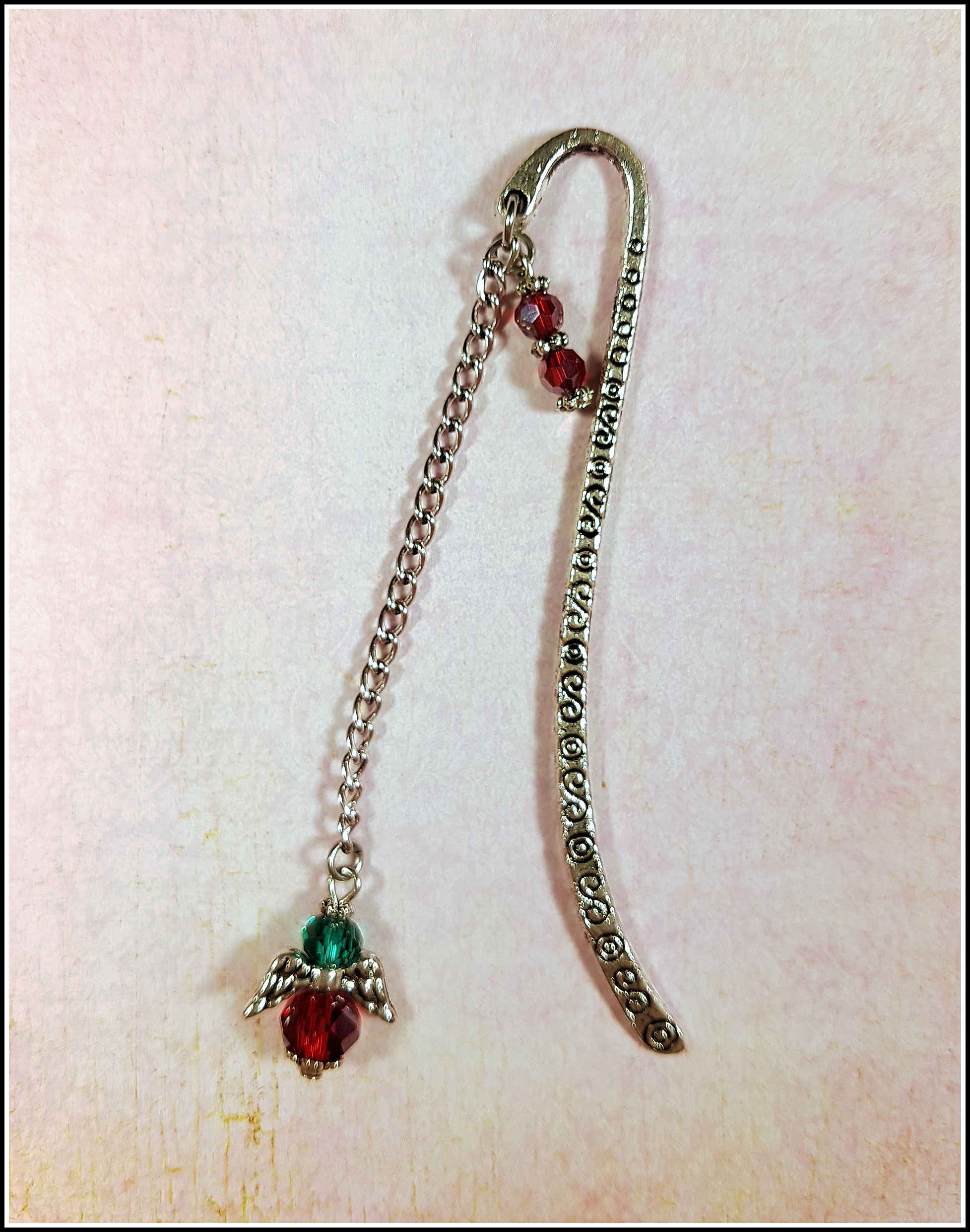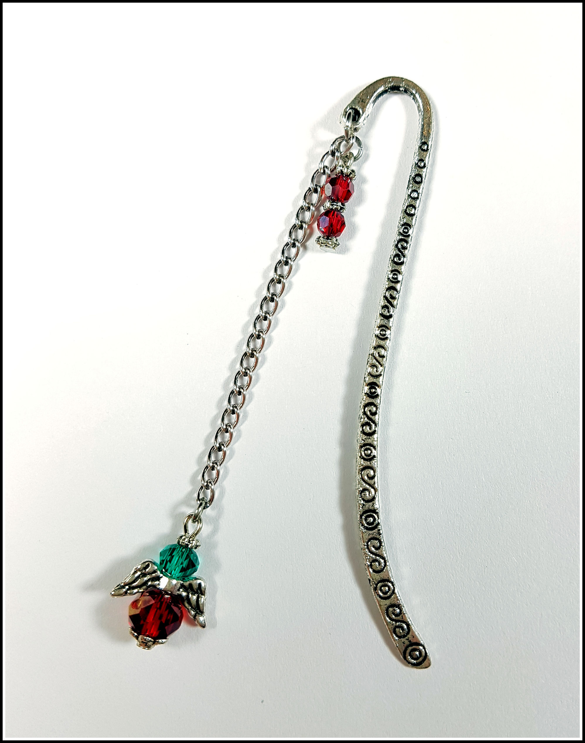 Das Lesezeichen „Schutzengelchen“ wird bestimmt durch den zweifarbigen Engel (mit seinem Körper aus einer roten Glasschliffperle und einem Köpfchen aus einer petrolfarbenen Glasschliffperle) und einem Anhänger aus zwei kleinen roten Glasschliffperlen. Der Körper des Lesezeichens ist hübsch graviert.
