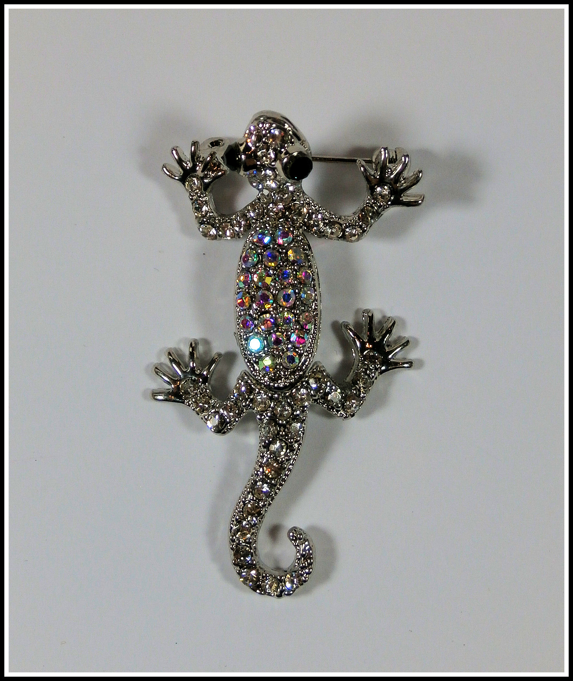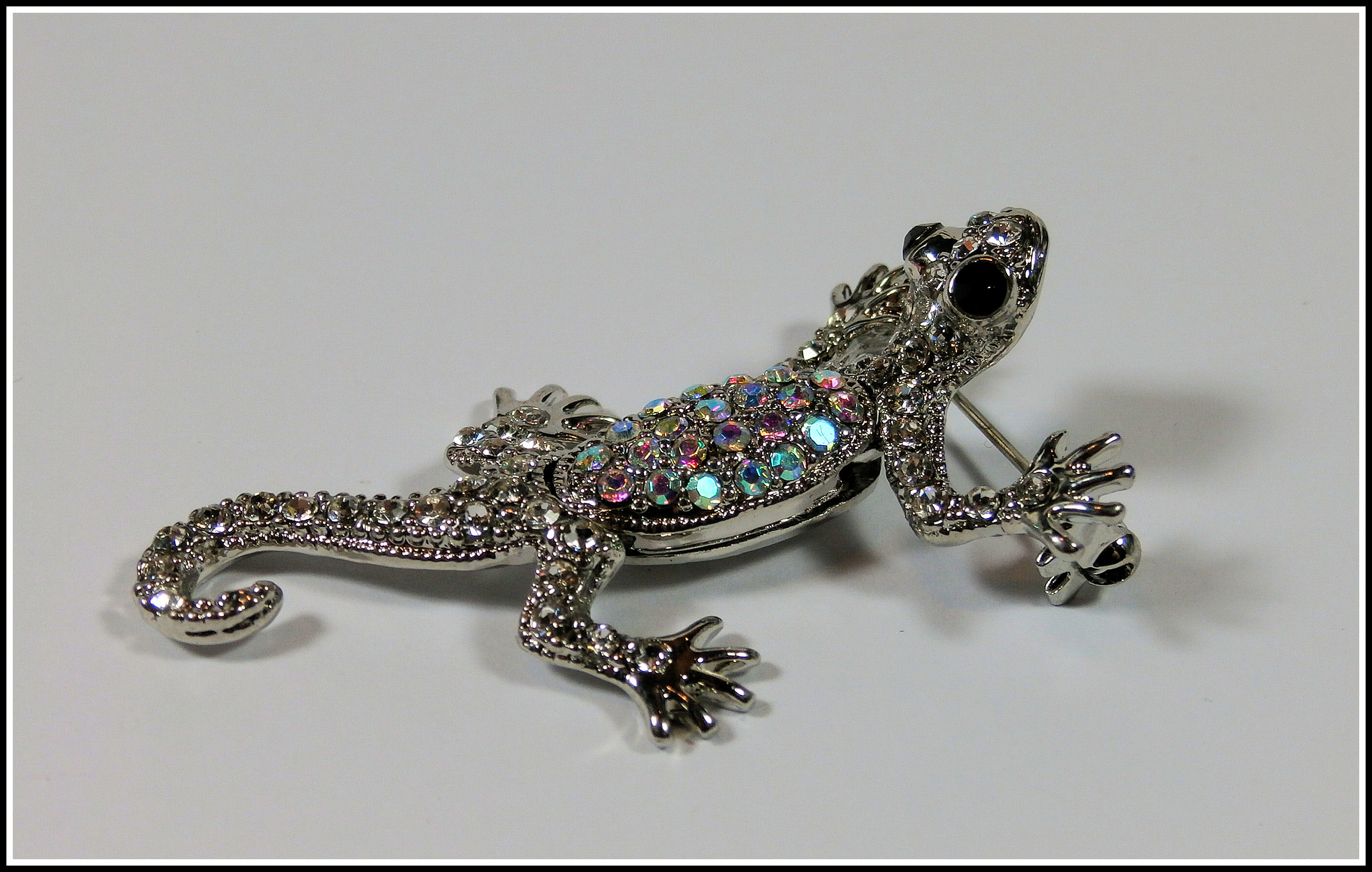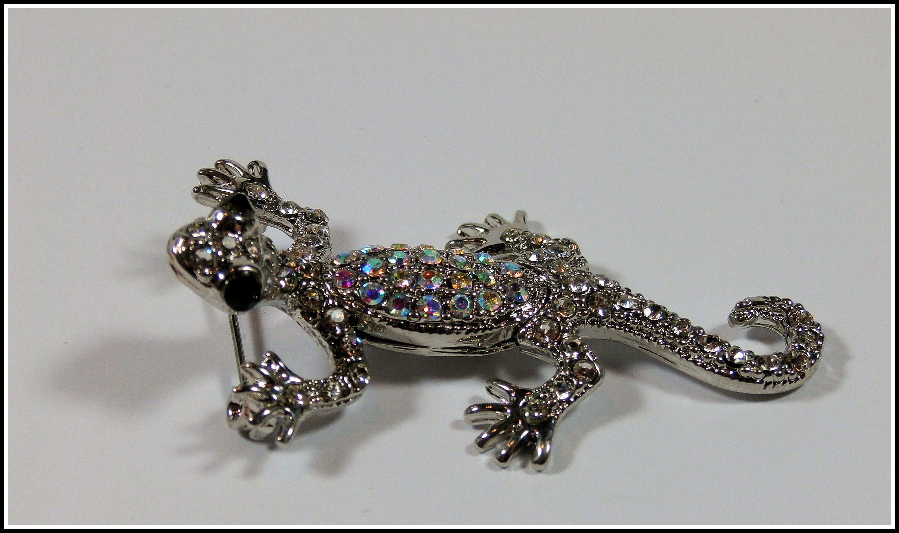 Ein ganz besonders schöner Klunkerschatz ist diese lebhafte Eidechse. Lebhaft? Ja! Zum einen besteht das Tierchen aus drei beweglichen Teilen (Kopf und Vorderfüße, Körper und Hinterfüßchen mit Schwanz) und zum anderen funkeln die unzähligen Glassteine nicht nur klar, sondern auf dem Rücken auch in zarten Farben des Regenbogens. Schließlich blickt die kleine Echse auch noch munter aus ihren schwarzen Glassteinaugen. Mit diesem Schmuckstück bekommt man unwillkürlich gute Laune.
