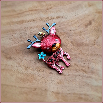 Dieser Hirsch ist so vielseitig! In der Weihnachtszeit wird man ihn auf den ersten Blick für ein Rentier halten. Da mag auch das Rot seines Fells und das Gold des Vögelchens weihnachtlich wirken. Im Frühling sieht es ganz anders aus – da fallen sicher zuerst das türkisfarbene Blümchen und der Vogel ins Auge, und das Rot ist einfach nur eine freundliche, leidenschaftliche Farbe.