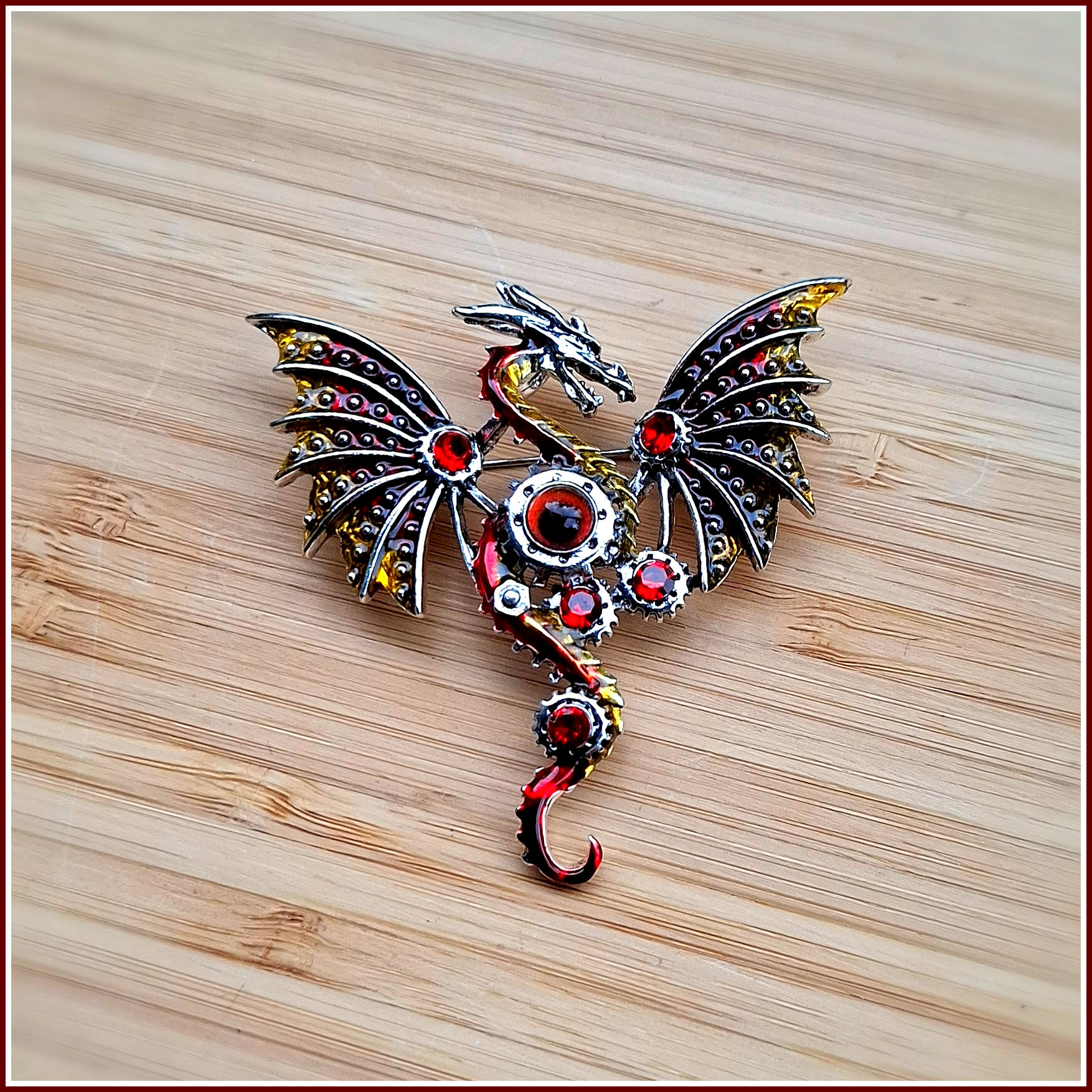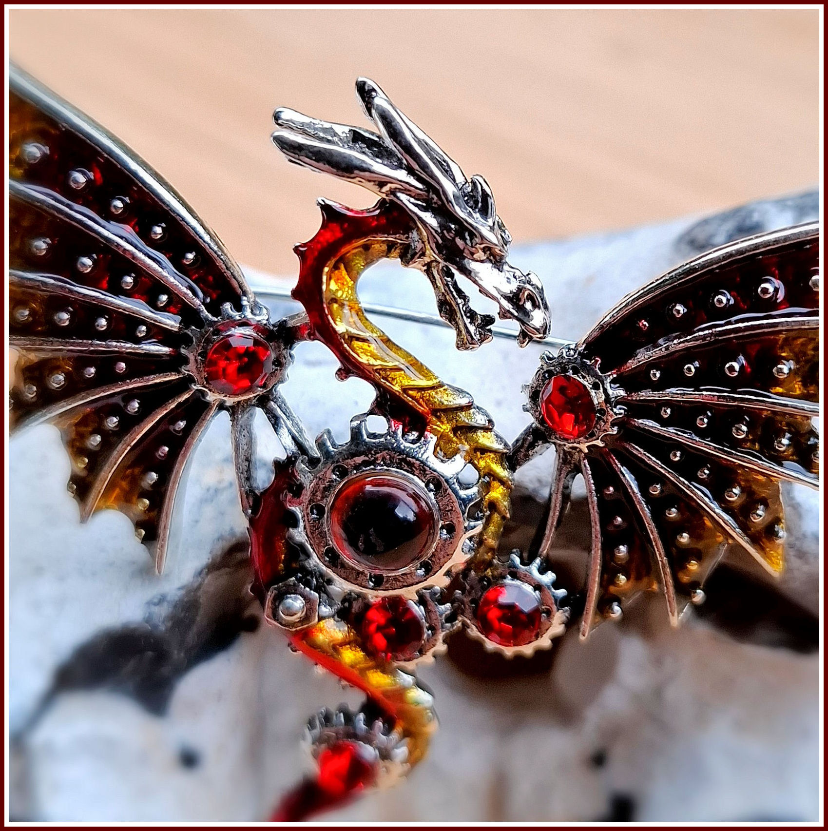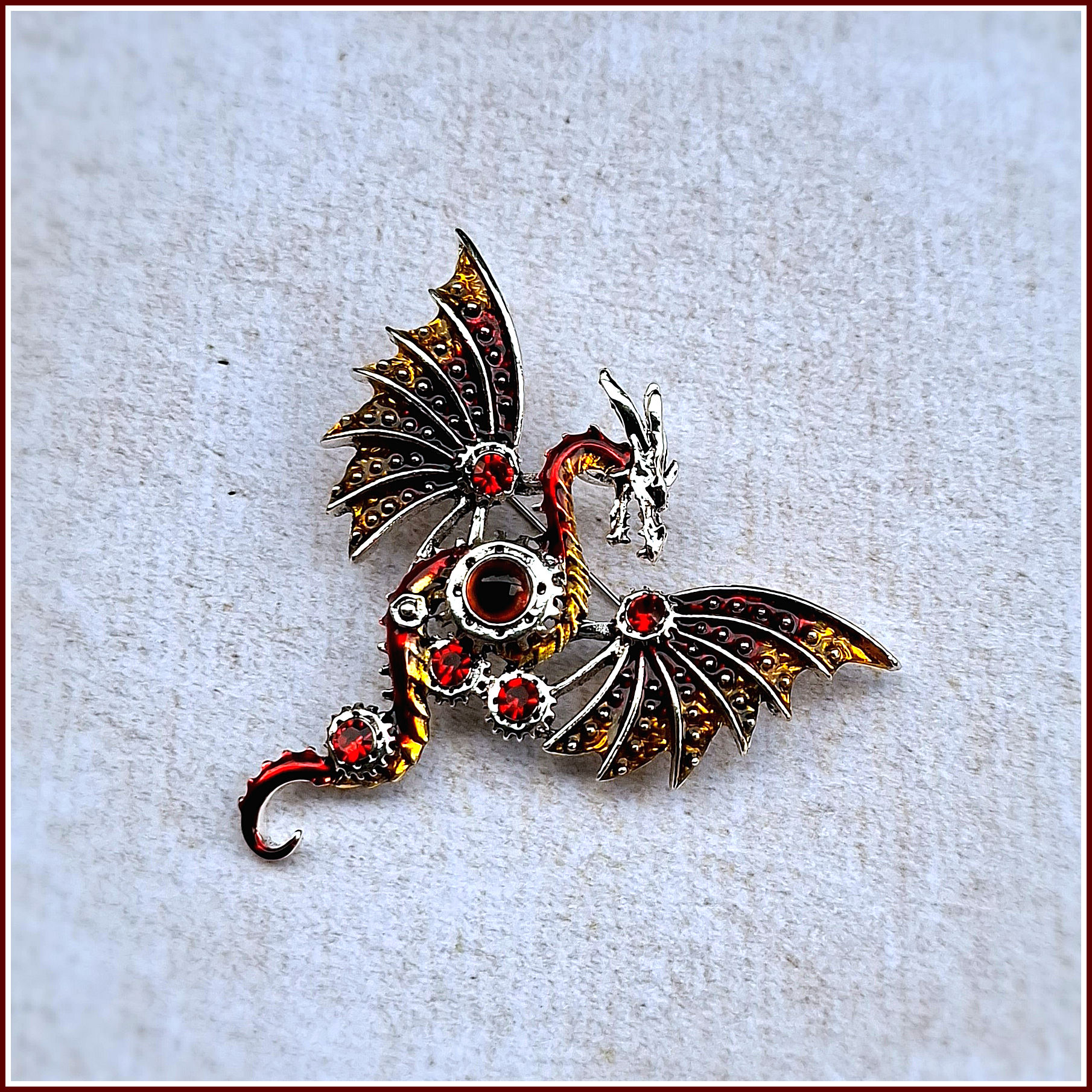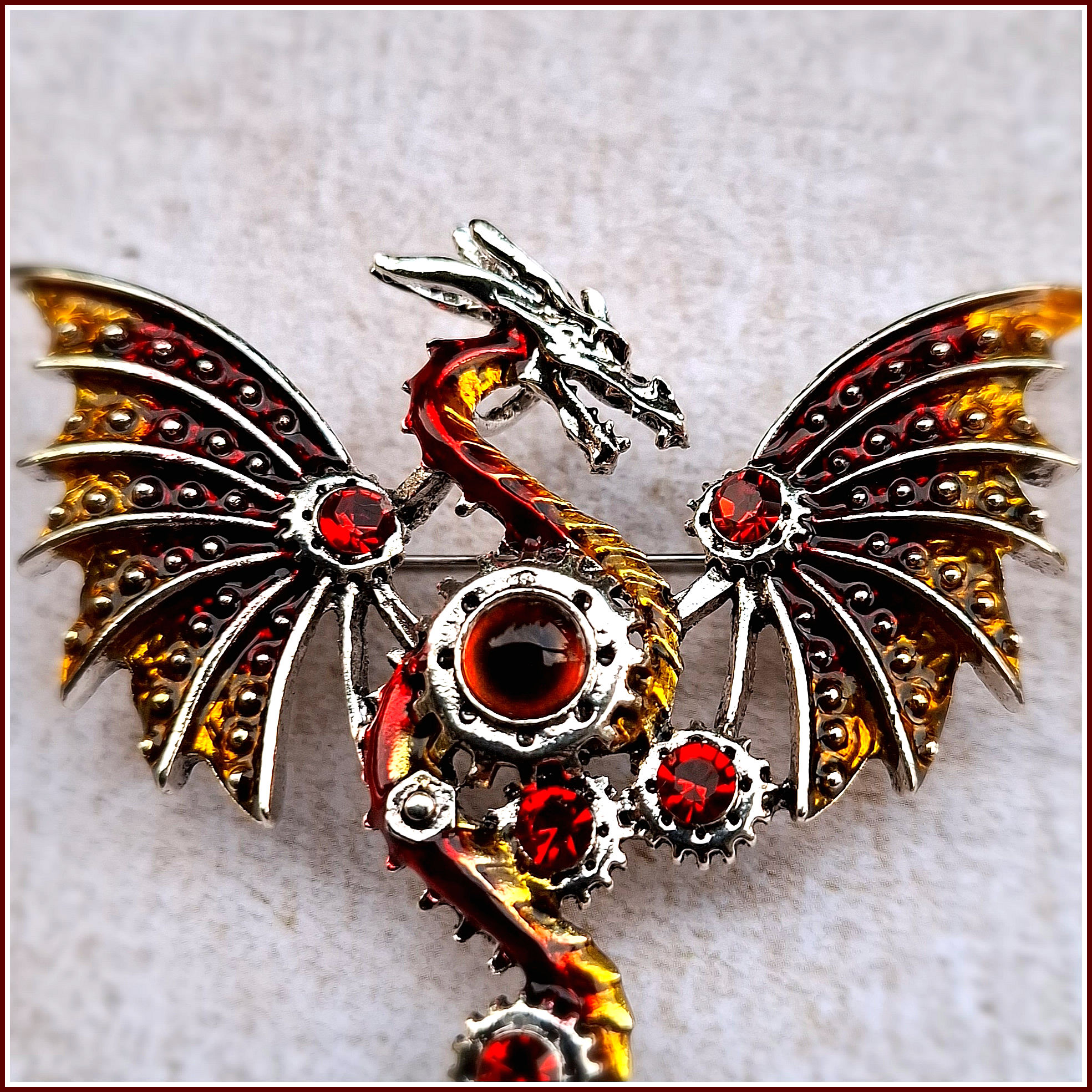 Die emaillierte Schuppenhaut dieses wunderschönen Drachens im Steampunk-Stil hat eine große Strahlkraft und glänzt mit eingelassenen funkelnden Strasssteinen um die Wette.