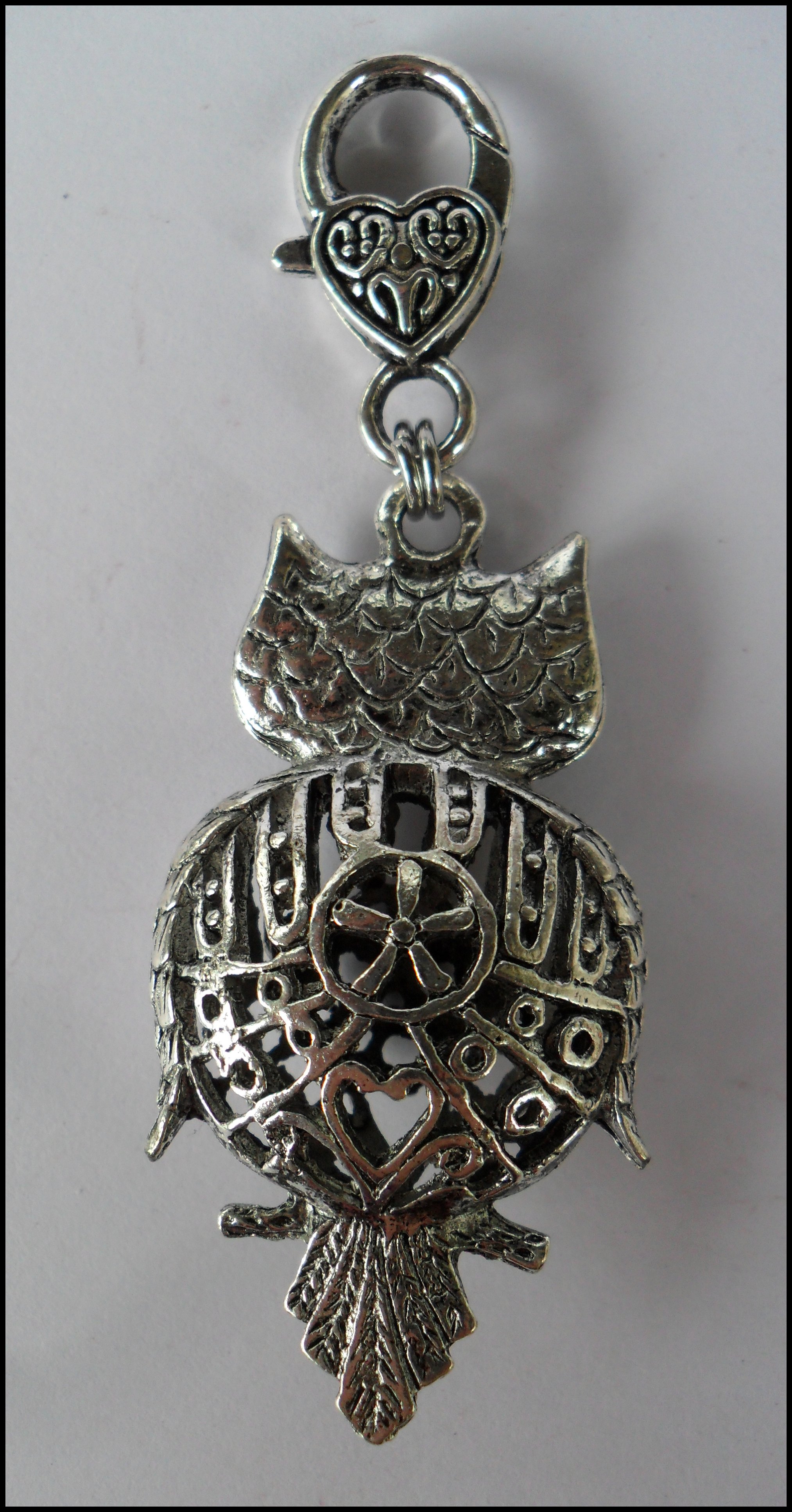 Eine wunderschöne, große Eule, einerseits filigran gearbeitet, aber dennoch stabil, die Sie als Kettenanhänger oder auch als Anhänger an einer Handtasche oder einer Gürtelschlaufe begleiten möchte.