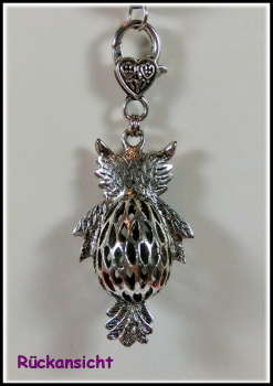 Diese Eule – und auch der außergewöhnlich schöne Karabiner - kommt in der Farbe „Antiksilber“ zu Ihnen, das heißt, sie sind silberfarben mit schwarzen Akzenten; was auf den Fotos ganz gut zu sehen ist. Bitte beachten Sie auch das Foto, das die Rückseite des Anhängers zeigt, die fast ebenso attraktiv ist wie die Vorderseite. Ein wirklich sehr schön gearbeitetes Schmuckstück!