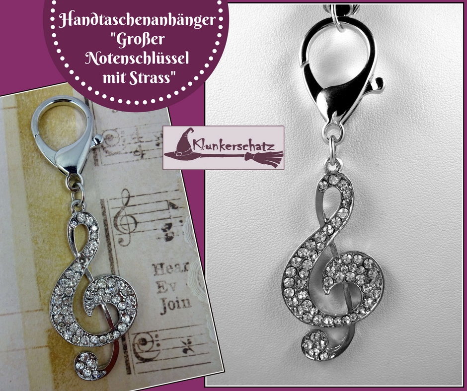 Besetzt mit vielen klaren Glassteinen ist dieser Notenschlüssel ein Handtaschenanhänger der Extraklasse!