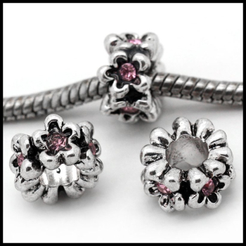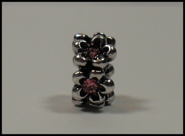 Diese romantisch schöne European Bead besteht aus fünf an einander gereihten Blüten, jede einzelne mit einem rosa Blütenkelch, bestehend aus einem rosa Strasssteinchen, versehen. Eine unserer schönsten Beads!