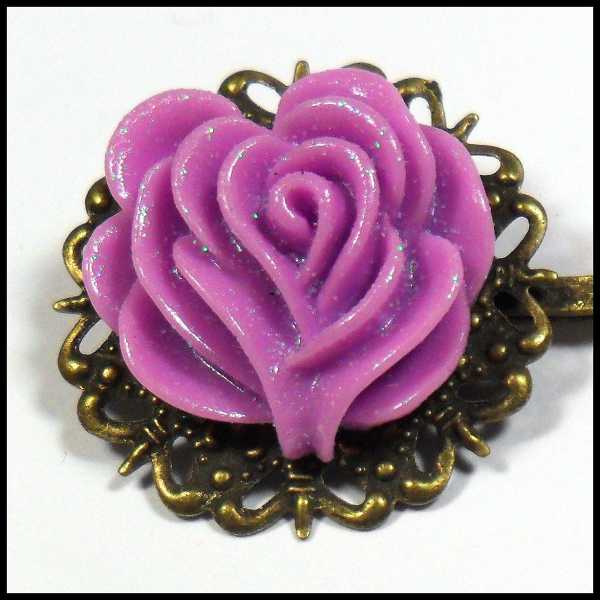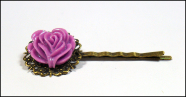 Eine filigrane Haarklemme in Bronze im „Antiqued Brass Style“, geschmückt mit einer intensiv fliederfarbenen Rose, die wiederum zart mit einem sehr dezenten und feinen Glitzerlack lackiert ist.