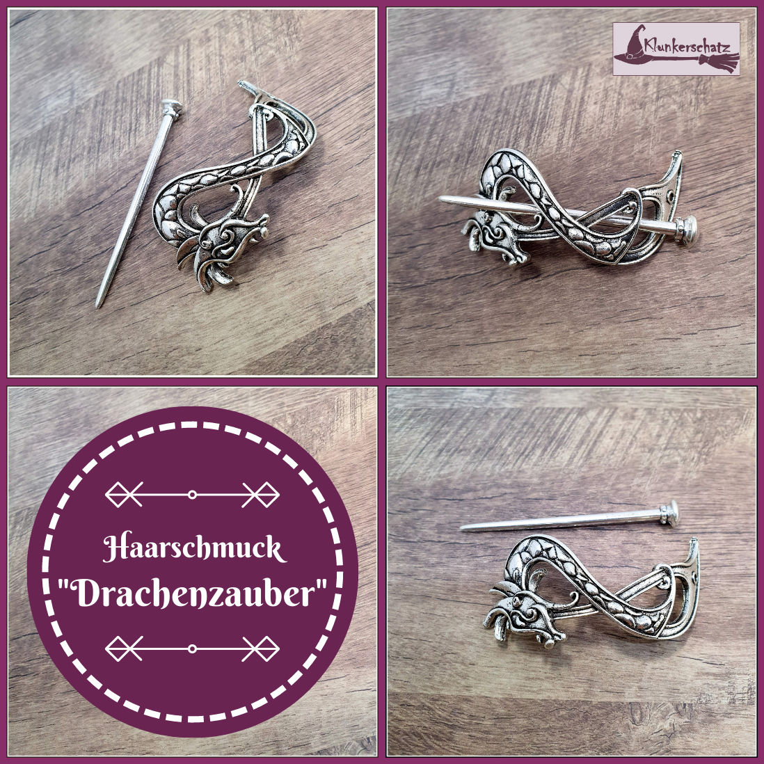 Dieser Haarschmuck ist mit einer Größe von 3,5 x 7,5 cm nicht sehr groß. Einen ganzen Zopf oder Pferdeschwanz kann er nicht aufnehmen. Wir von Klunkerschatz verwenden ihn eher als Schmuckstück über oder unter einem Knoten oder Zopf.