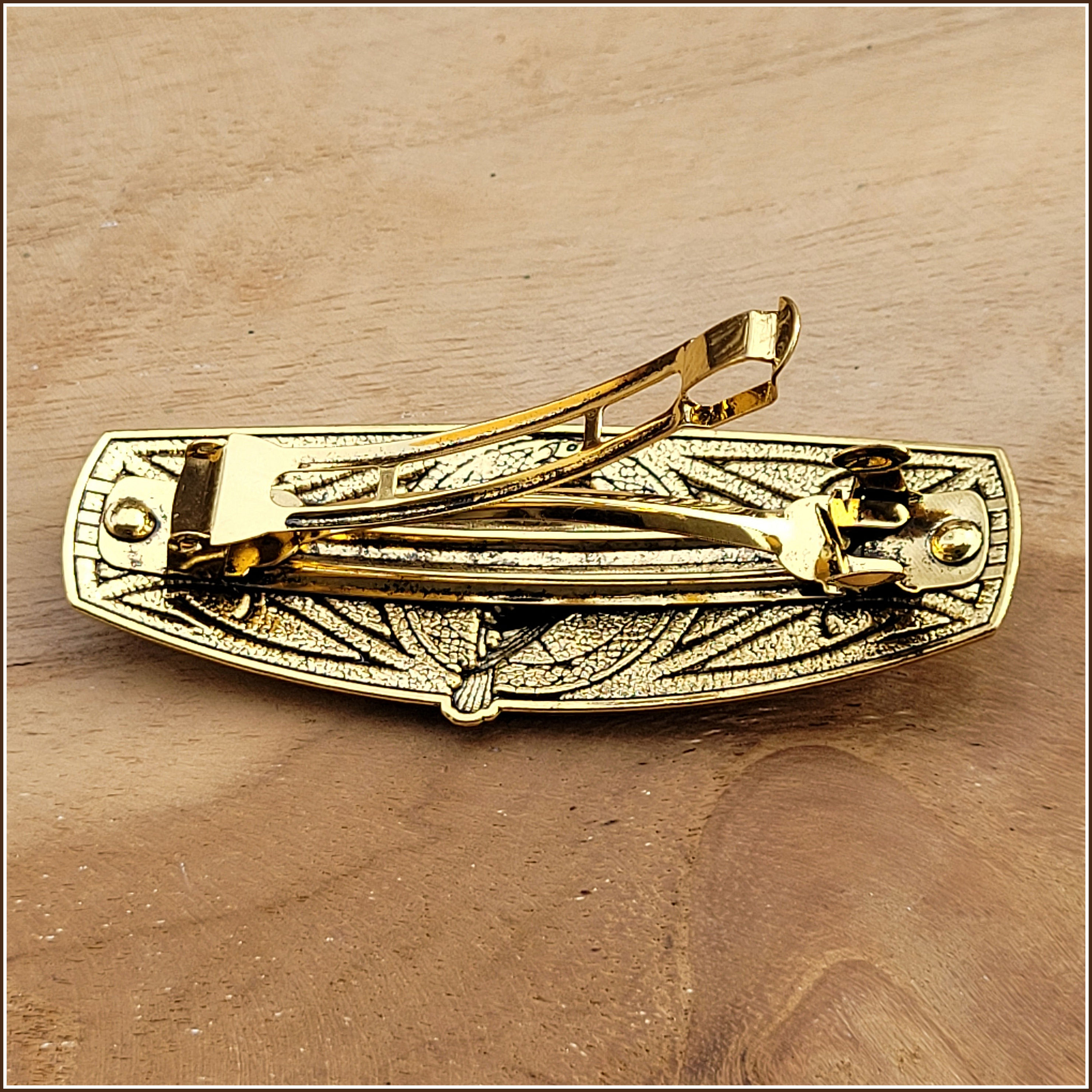 Diese Haarspange hat eine Größe von 3,4 x 8 cm. Einen starken Zopf oder Pferdeschwanz kann sie nicht aufnehmen, aber sie hält bequem das Deckhaar oder auch mehr bei feinerem Haar.