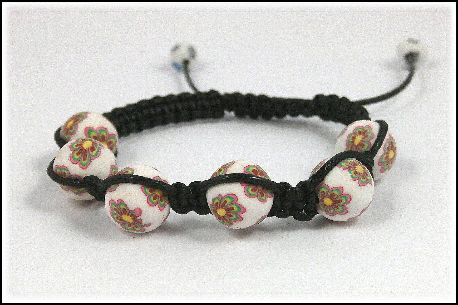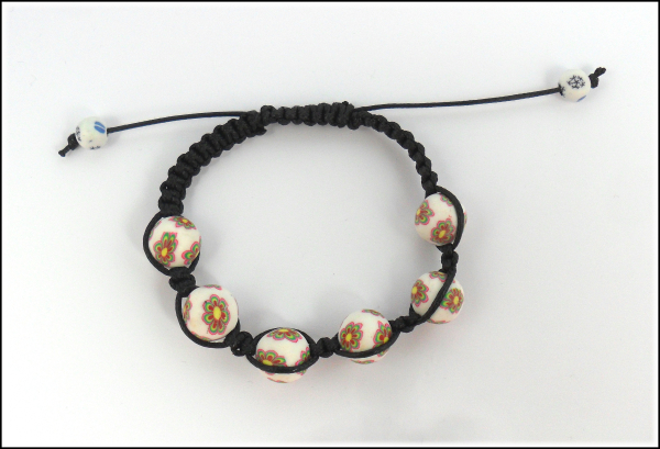 Im vorliegenden Armband sind sechs Perlen (Durchmesser jeweils ca. 12 mm) aus Primo (ähnlich dem deutschen Fimo, im Ausland auch oft als „Clay Ton“ bezeichnet) eingeflochten. An beiden Verschluss-Enden befinden sich jeweils zwei weitere Perlen (Durchmesser jeweils ca. 8 mm).