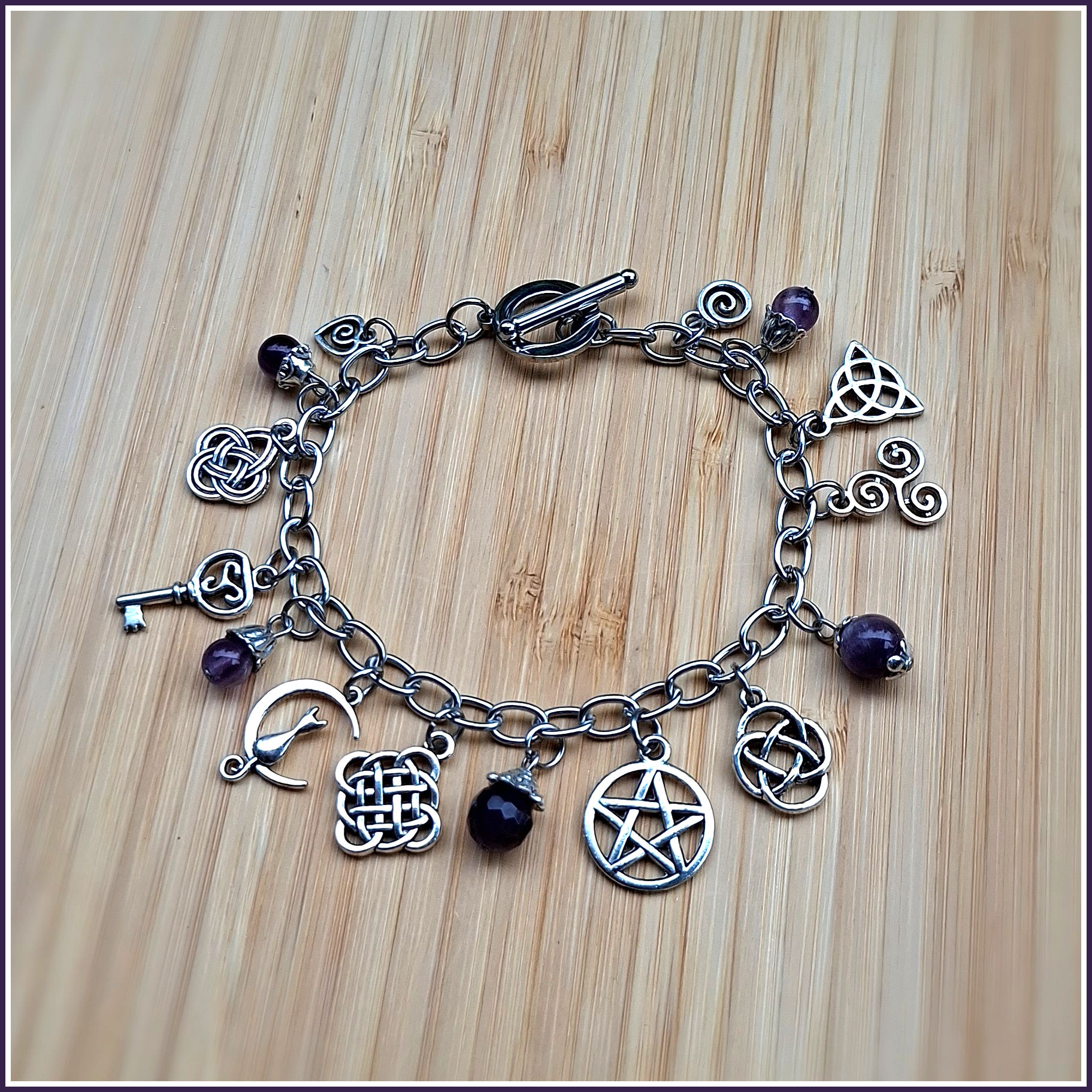 Für diese Armkette haben wir kraftvolle Symbole ausgesucht wie Pentagramm, Triqueta, Triskele, einen Schlüssel, eine Katze in einer Mondsichel, ein Herz und eine Vielzahl keltischer Knoten.