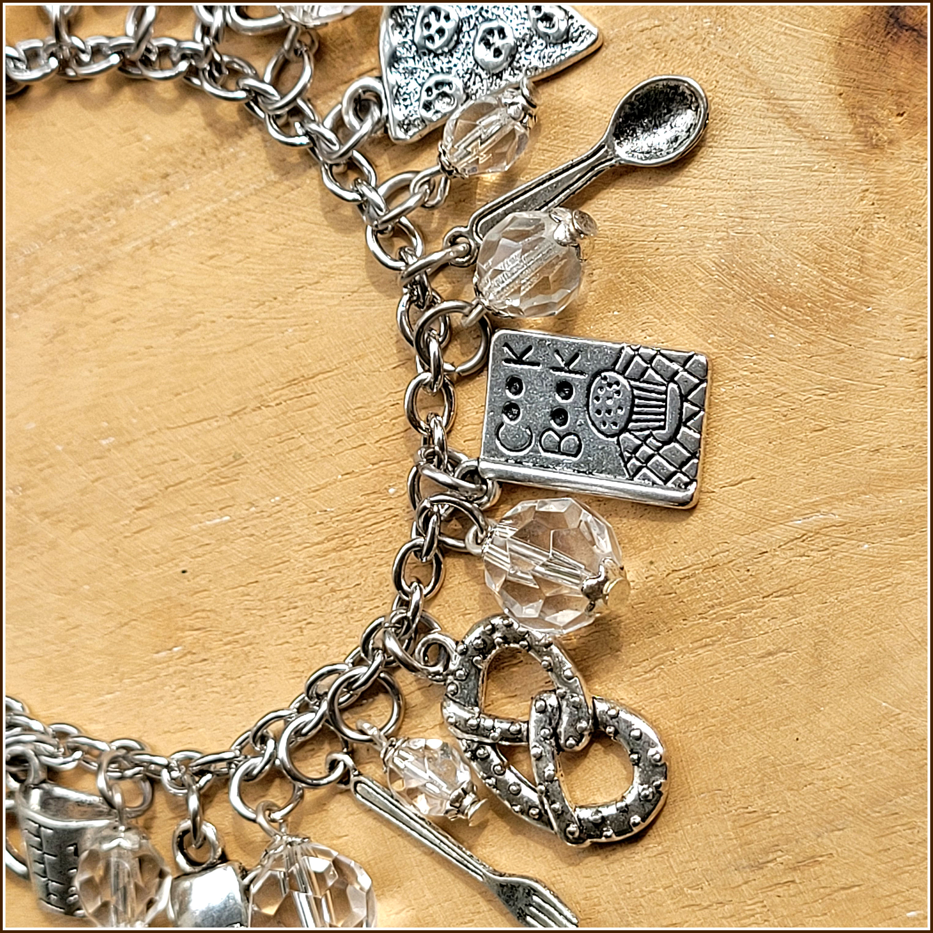 Pizza, Brezel, Kochbuch, Kaffeetasse und noch viel, viel mehr passende Motive wechseln sich ab mit facettierten, klaren Glasperlen in drei verschiedenen Größen.