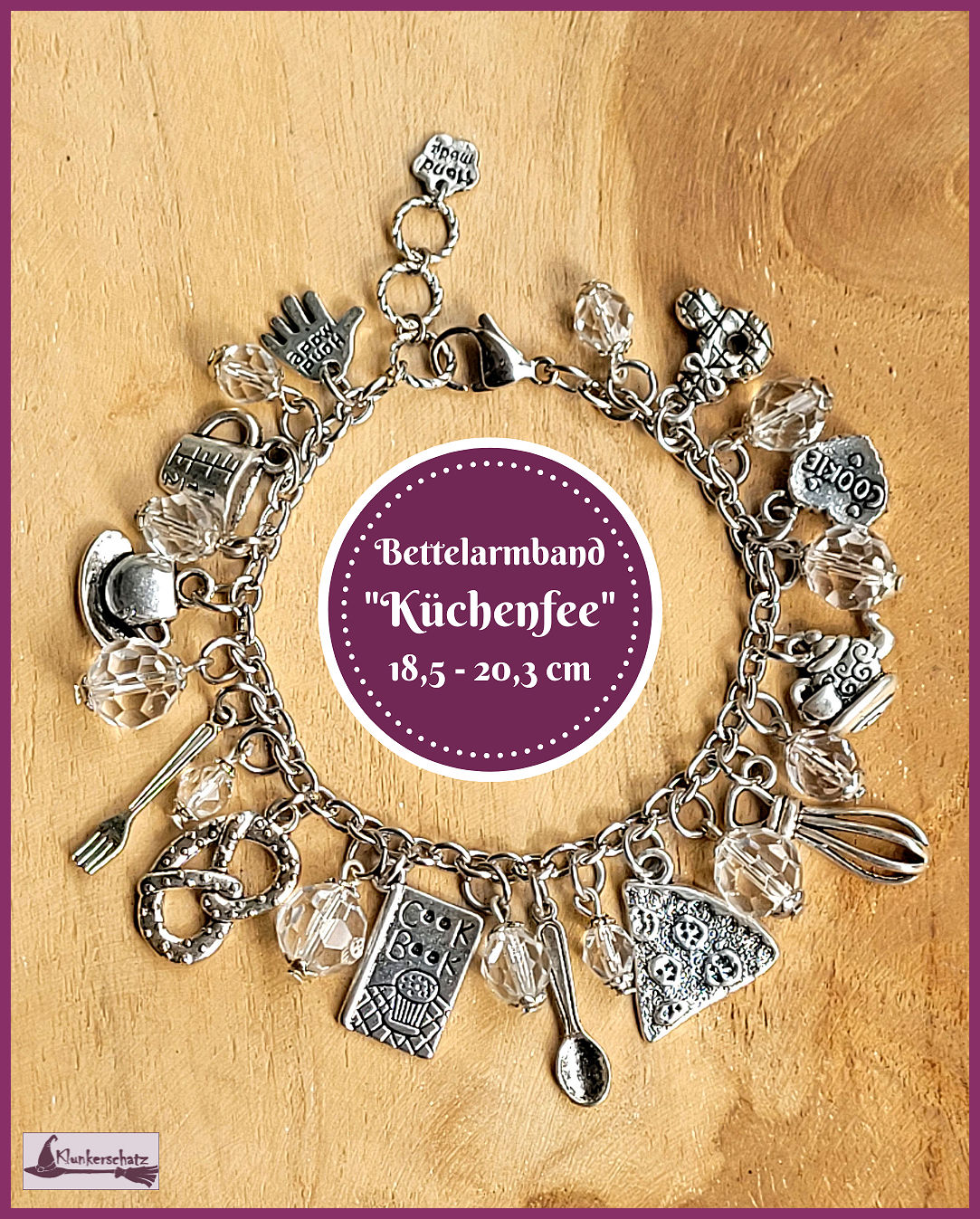 Typisch Klunkerschatz – ein Edelstahlarmband und liebevoll ausgesuchtes Geklunker (exakt 25 klare Glasperlen und Motivanhänger), zusammengestellt zu einer einzigartigen Armkette für alle Küchenfeen!