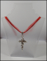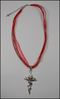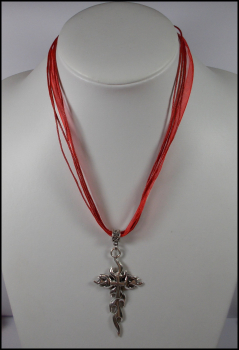 Das große Kreuz hängt an einem fünfreihigen Band in – wie passend – flammendem Rot (1 Oganzaband & 4 gewachste Baumwollkordeln ). Sollte Ihnen ein anderes Band aus unserem Shop farblich besser gefallen, schreiben Sie uns einfach an. Wir können das dann gerne austauschen.