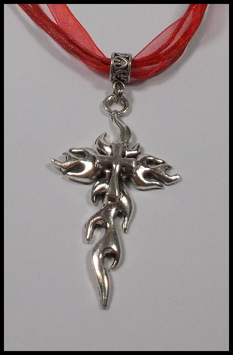 Ein großartiges, geradezu dramatisches flammendes Kreuz an einem leuchtend roten mehrreihigen Halsband.