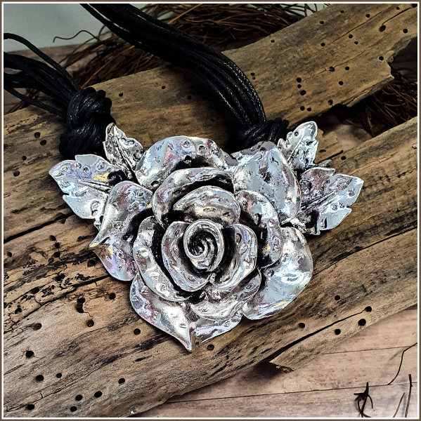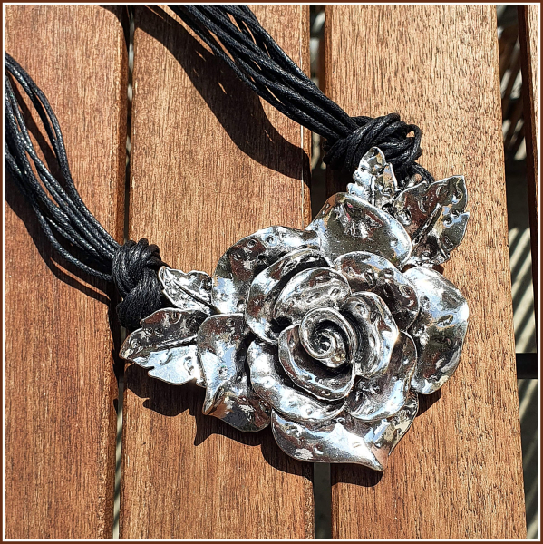 Eine großartige, auffallende Rose bildet den Mittelpunkt dieses Schmuckstücks– gehalten von einer 16reihigen gewachste Bauwollkordel. Der ideale Schmuck für den ganz großen Auftritt – ganz gleich ob im LARP-, Gothic- oder sogar im dunklen, modern interpretierten Trachten-Style, schick und extravagant aber auch einfach mal zu Shirt und Jeans oder zum „Kleinen Schwarzen“. Mit 90 Gramm ein schönes, schweres Stück.