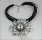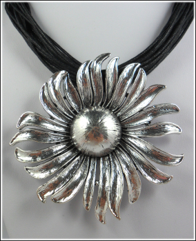 Eine wirklich, wirklich große Blüte an einer Halskette aus 18 (!) Textilbändern. Dieses sehr besondere Schmuckstück stammt zwar nicht aus der eigenen Werkstatt, aber wir haben uns sofort in dieses schöne Stück verliebt, so dass wir einige wenige Exemplare einkaufen „mussten“…. In den Shop gelangt sind von diesen Exemplaren nur noch zwei– die anderen wurden direkt vom Werkstatttisch „weggekauft“.