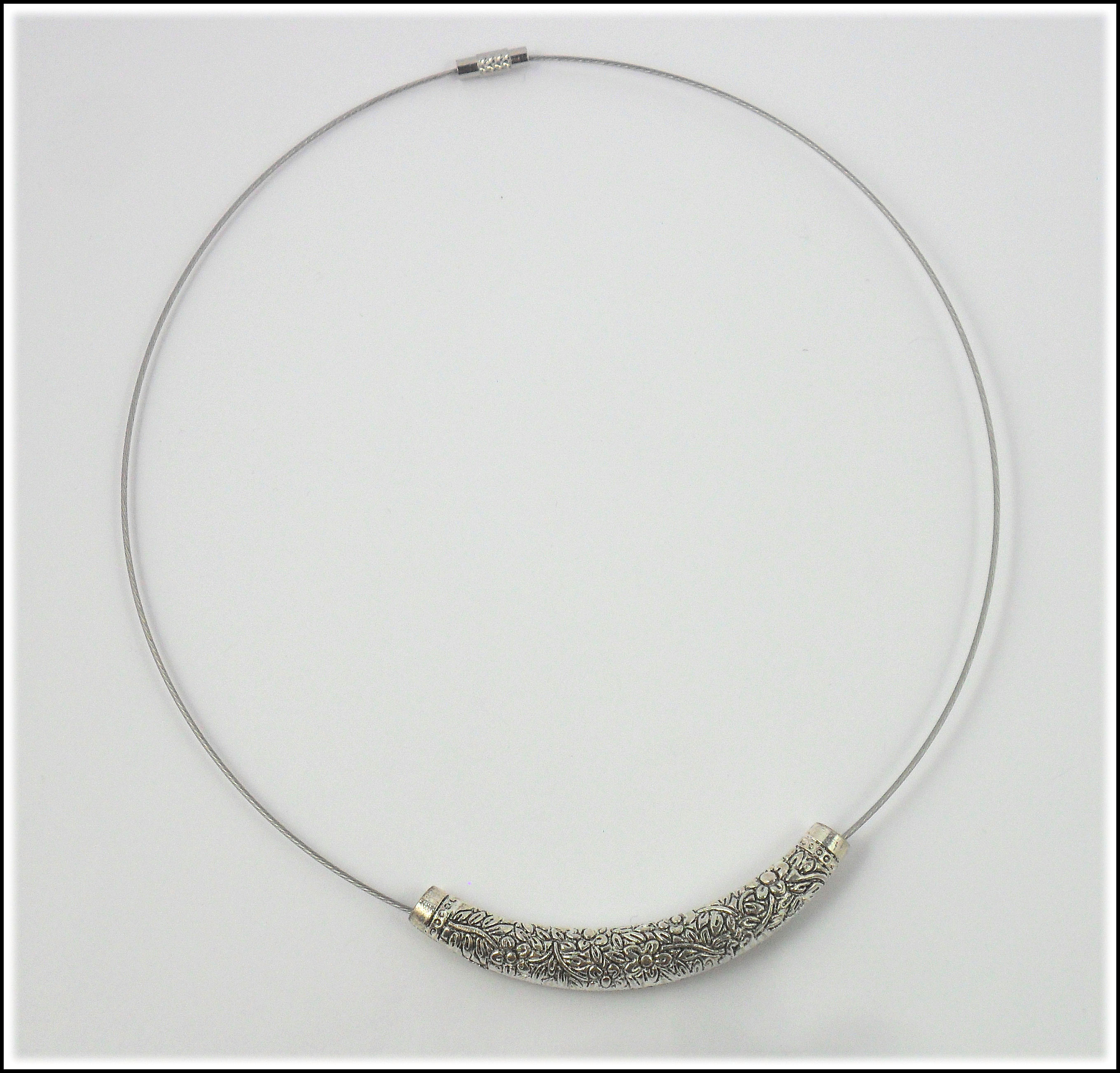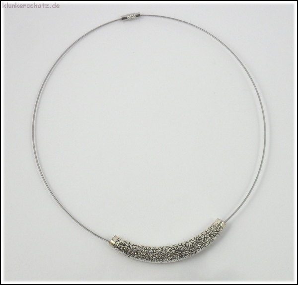 Ein detailverliebt gearbeitetes Element mit floralen Motiven „schwebt“ an einem schmalen, 1 mm „starken“, Halsreif aus Stahldraht, der durch einen Schraubverschluss geschlossen wird. Der Reif hat eine Länge von ca. 45,5 cm.