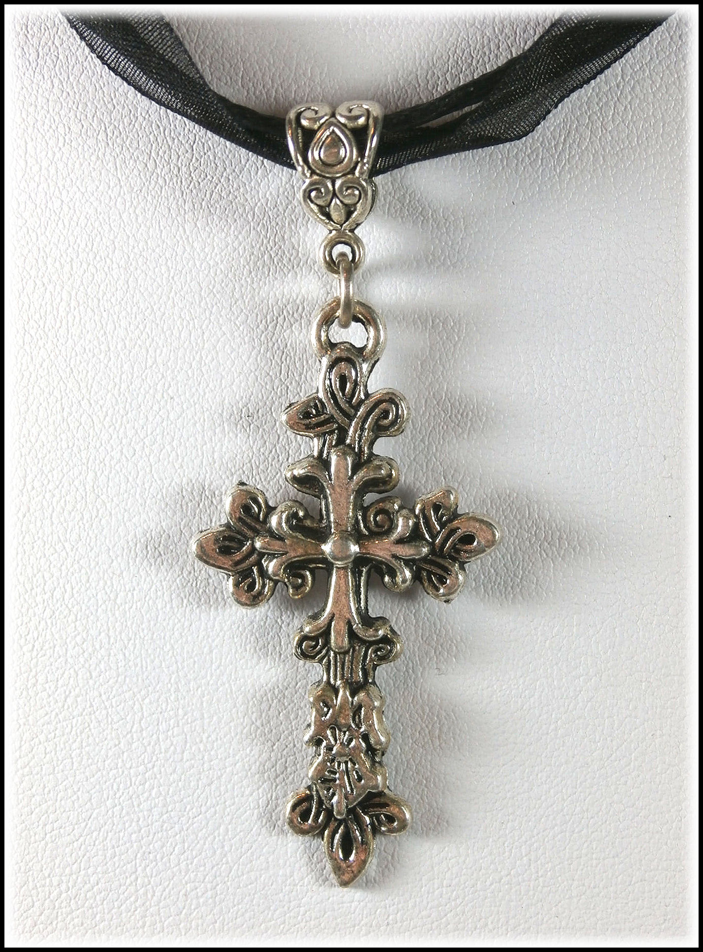 Ein wunderschönes, reich verziertes Gothisches Kreuz an einem mehrreihigen schwarzen Halsband.