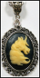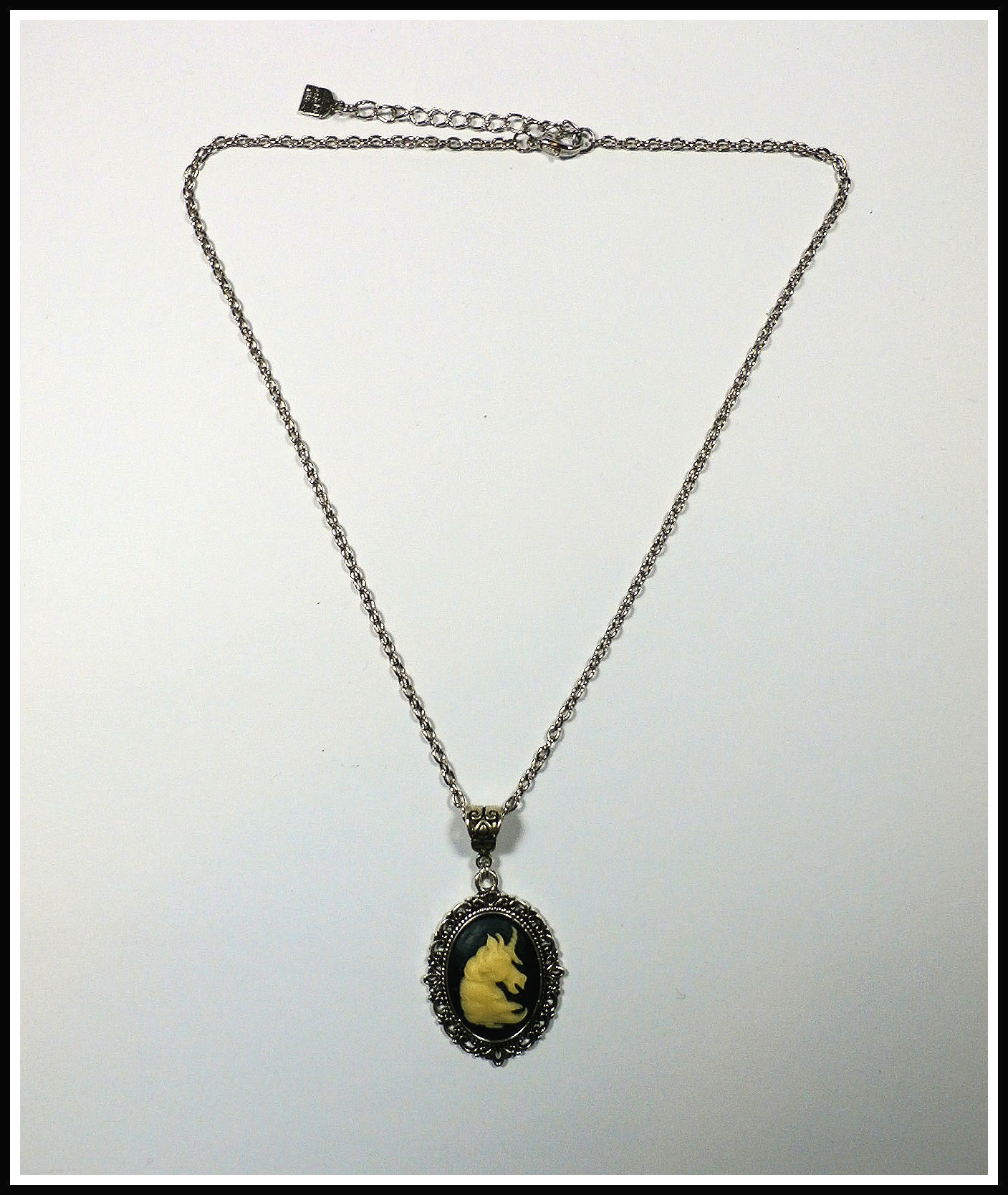 Das detaillierte Relief aus Resin zeigt ein vanillefarbenes Einhorn auf dunkelblaugrauem Untergrund, umgeben von einem ideal passenden Rahmen in Antiksilber. Dazu haben wir eine kurze Kette kombiniert.