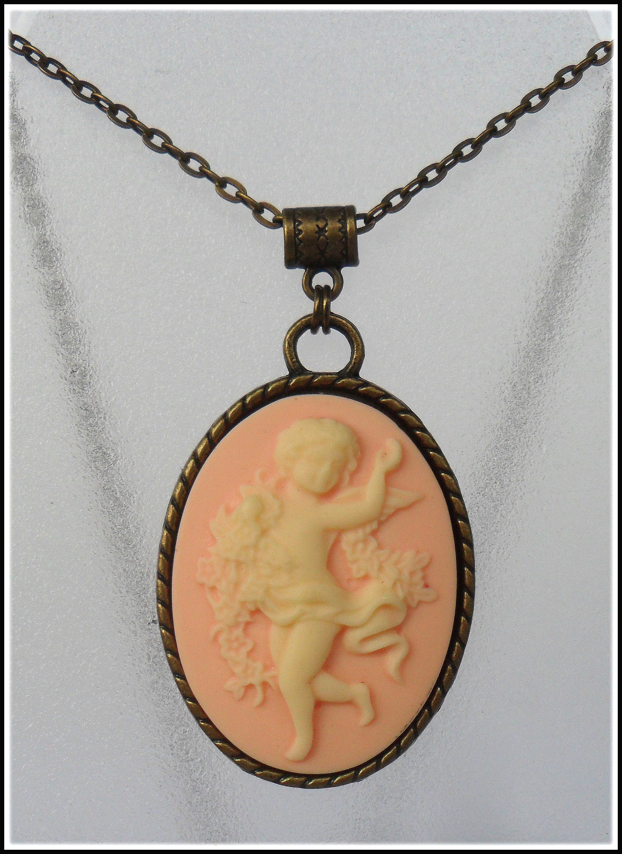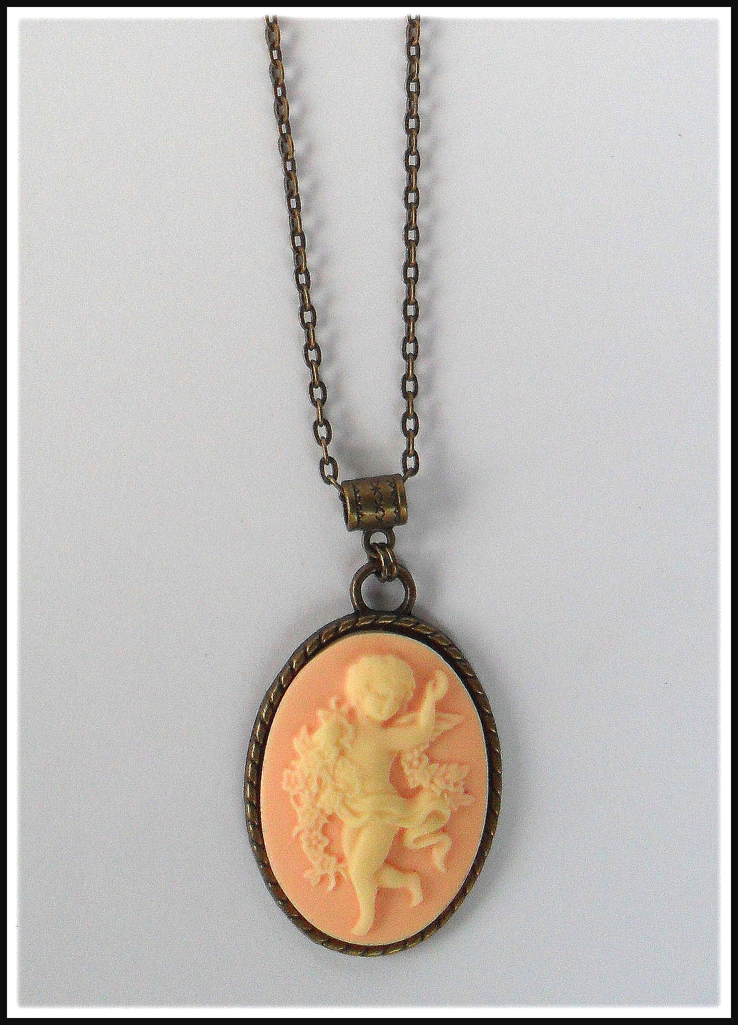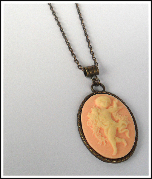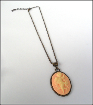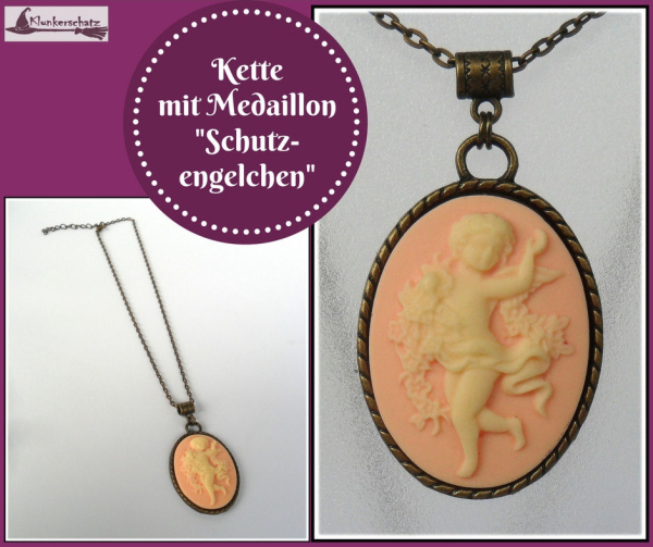 Ein wirklich romantisches Schmuckstück, dieses bezaubernde Medaillon „Schutzengelchen“! Das detaillierte Relief aus Resin zeigt ein vanillefarbenes Engelchen auf apricotfarbenem Untergrund, umgeben von einem ideal passenden Bronzerahmen. Dazu haben wir eine kurze Kette kombiniert, aber auch an einer langen Kette, wird der Anhänger sehr hübsch aussehen; wenn wir die Kette also für Sie austauschen sollen, sagen Sie uns einfach Bescheid.