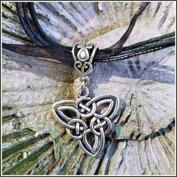 Das Band ist ca. 44 cm lang (da die Bänder handgefertigt sind, kann das immer mal um einige Millimeter variieren), inkl. Karabiner, plus 4 cm Verlängerungskette, an deren Ende sich eine winzige Triqueta befindet. Die Triqueta (oder auch Triquetta oder Triquetra genannt) findet sich schon seit Jahrtausenden im Symbolismus verschiedener Kulturen; am vertrautesten dürfte sie uns heute aus dem Keltischen, bzw. aus der Kult-Fernsehserie „Charmed“ sein, wo sie das „Buch der Schatten“ zierte. Dort steht sie für „Die Macht der Drei“, und ähnlich war die Bedeutung auch in alten Zeiten, wo die Triqueta z. B. für die „Dreifaltige Göttin“ in ihrer Erscheinung als Jungfrau, als Frau im gebärfähigen Alter und als weise Alte stand, aber auch für die „Drei“ in unser aller Leben – für Geburt, Leben und Tod.
