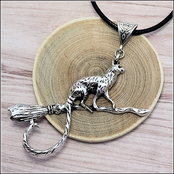 Die Verbindung zur Hexe wird bei diesem Kettenanhänger mehr als deutlich, denn hier hat sich die Hexenkatze ganz offensichtlich den Besen ihrer menschlichen Partnerin ausgeliehen und dreht eine Runde über den Nachthimmel.