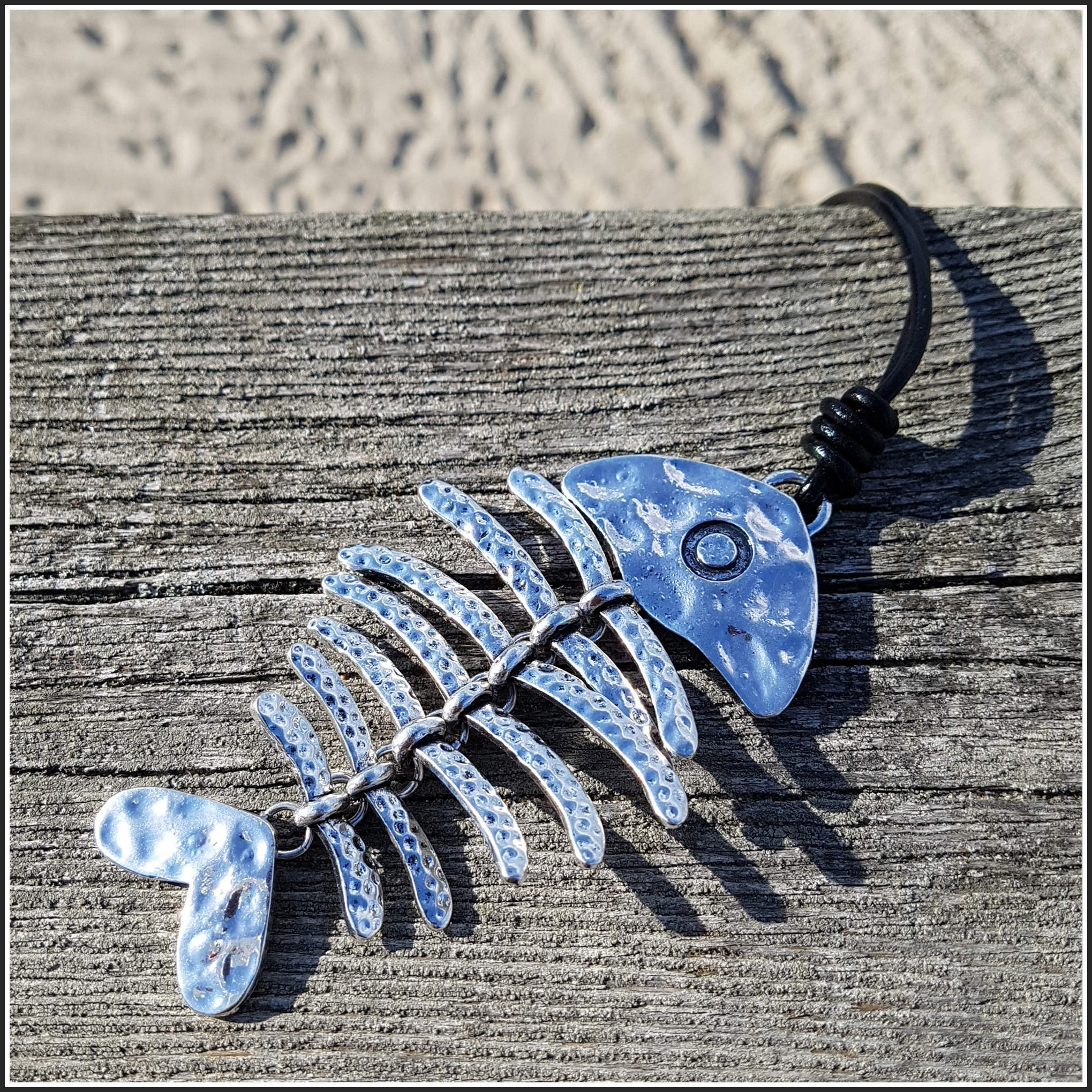 Eine außergewöhnliche Kette, bestehend aus einem langen Lederband und einem Anhänger. Das Lederband hat eine Gesamtlänge von 82 cm, plus 5 cm Verlängerung, und wird durch einen kleinen Karabiner verschlossen, lässt sich aber auch bequem über den Kopf ziehen.