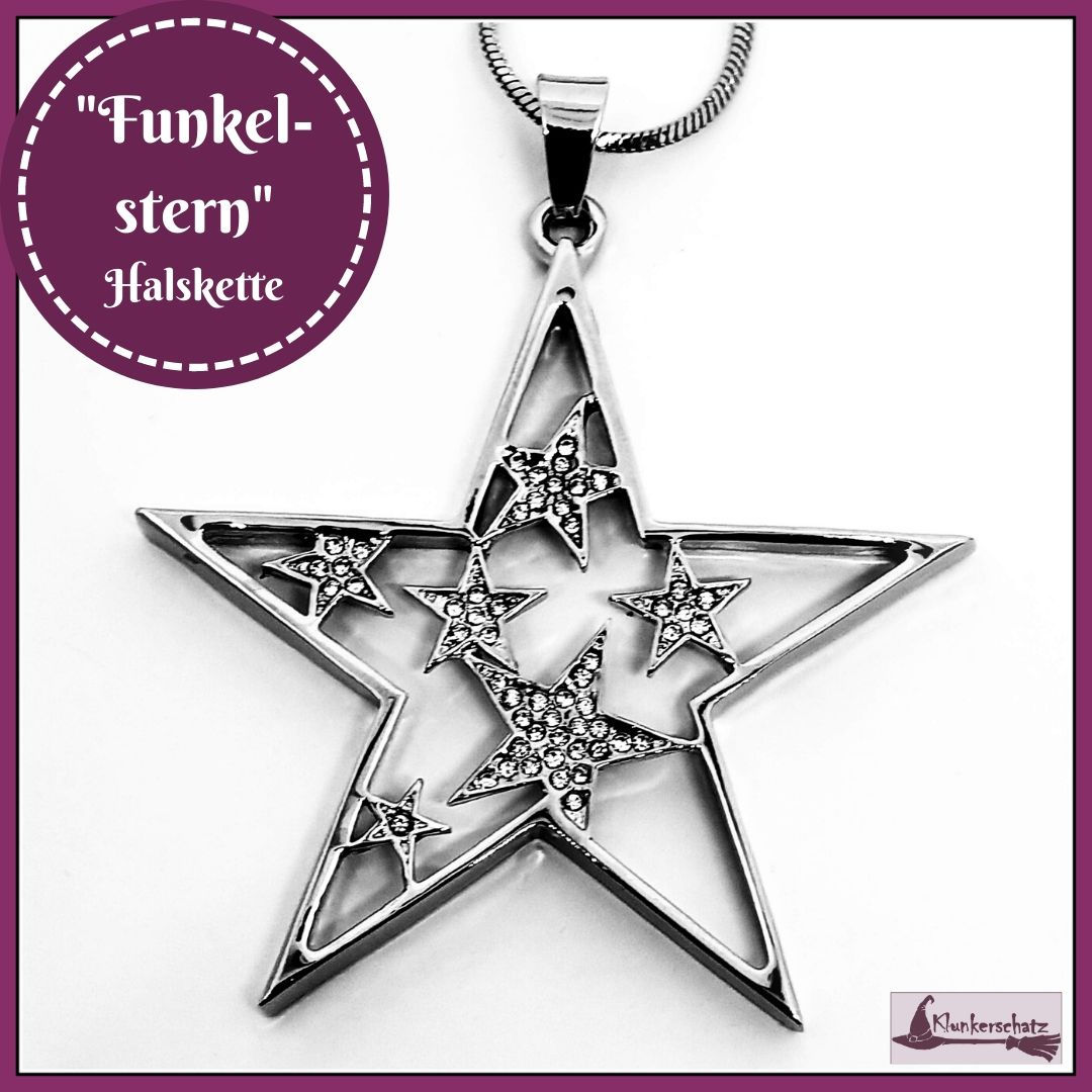 Geliefert wird der „Funkelstern“ aber mit dieser Schlangenkette, die eine Gesamtlänge von 72 cm hat, und lässt sich mittels der Verlängerungskette um weitere 6 cm verlängern. Sie wird durch einen kleinen Karabiner verschlossen.