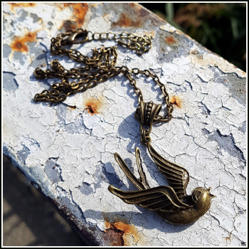 Der Anhänger dieser Halskette im angesagten Vintagestyle zeigt eine bildschöne Schwalbe. Das Motiv ist so richtig schön „old school“, wie es besonders im Rockabilly-Style gerne verwendet wird.