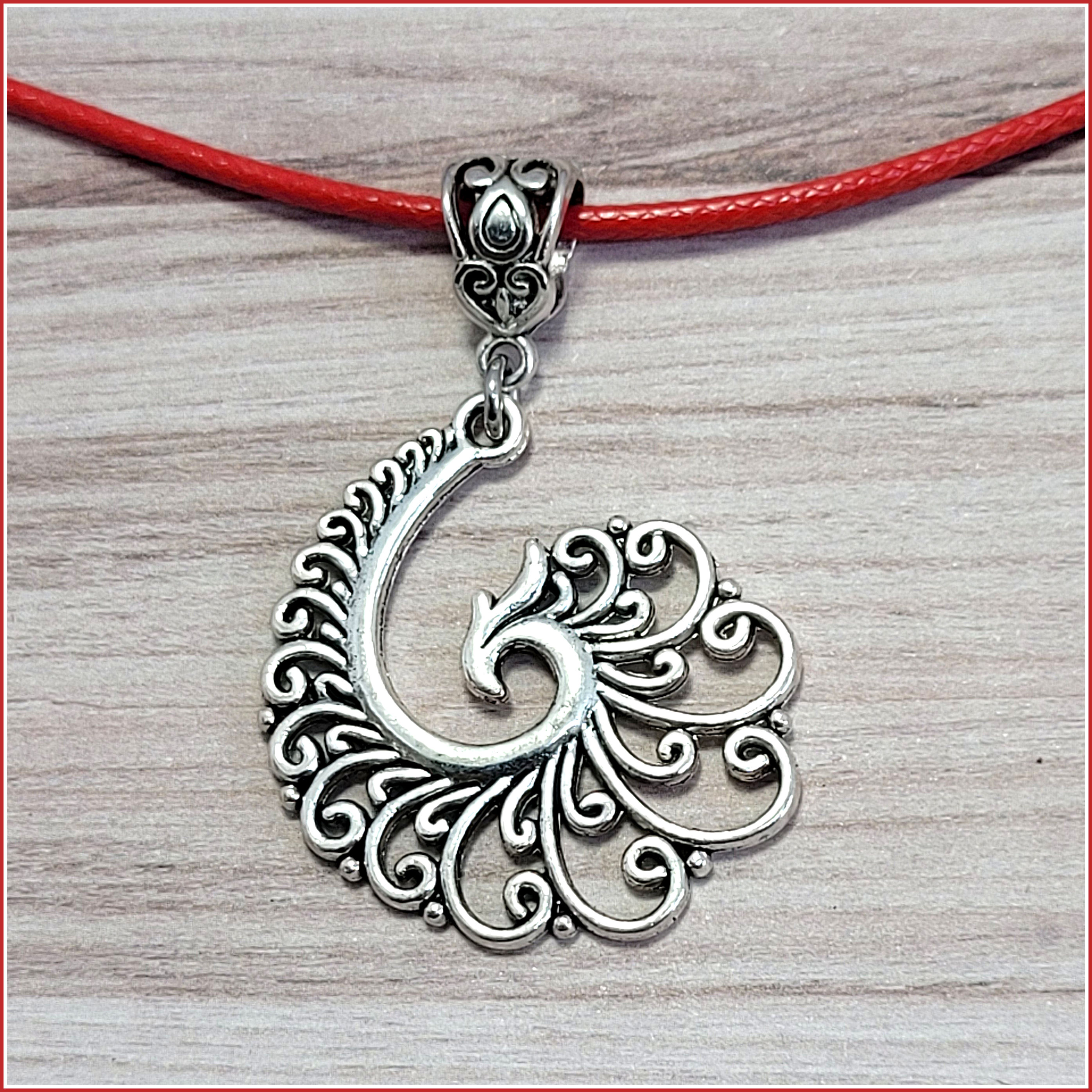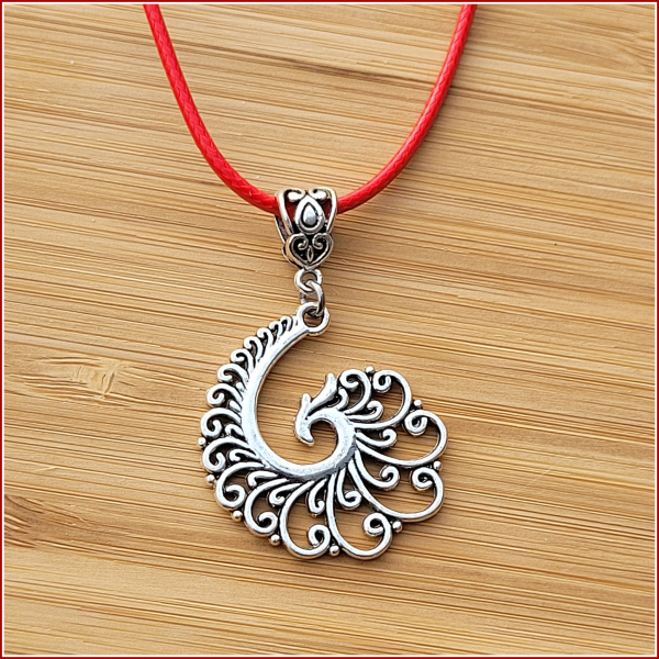 Dieser wunderschön gestaltete, abstrakte Phönix hängt an einer roten Textilkordel, denn natürlich ist rot als Feuerfarbe die Farbe des Phönix.