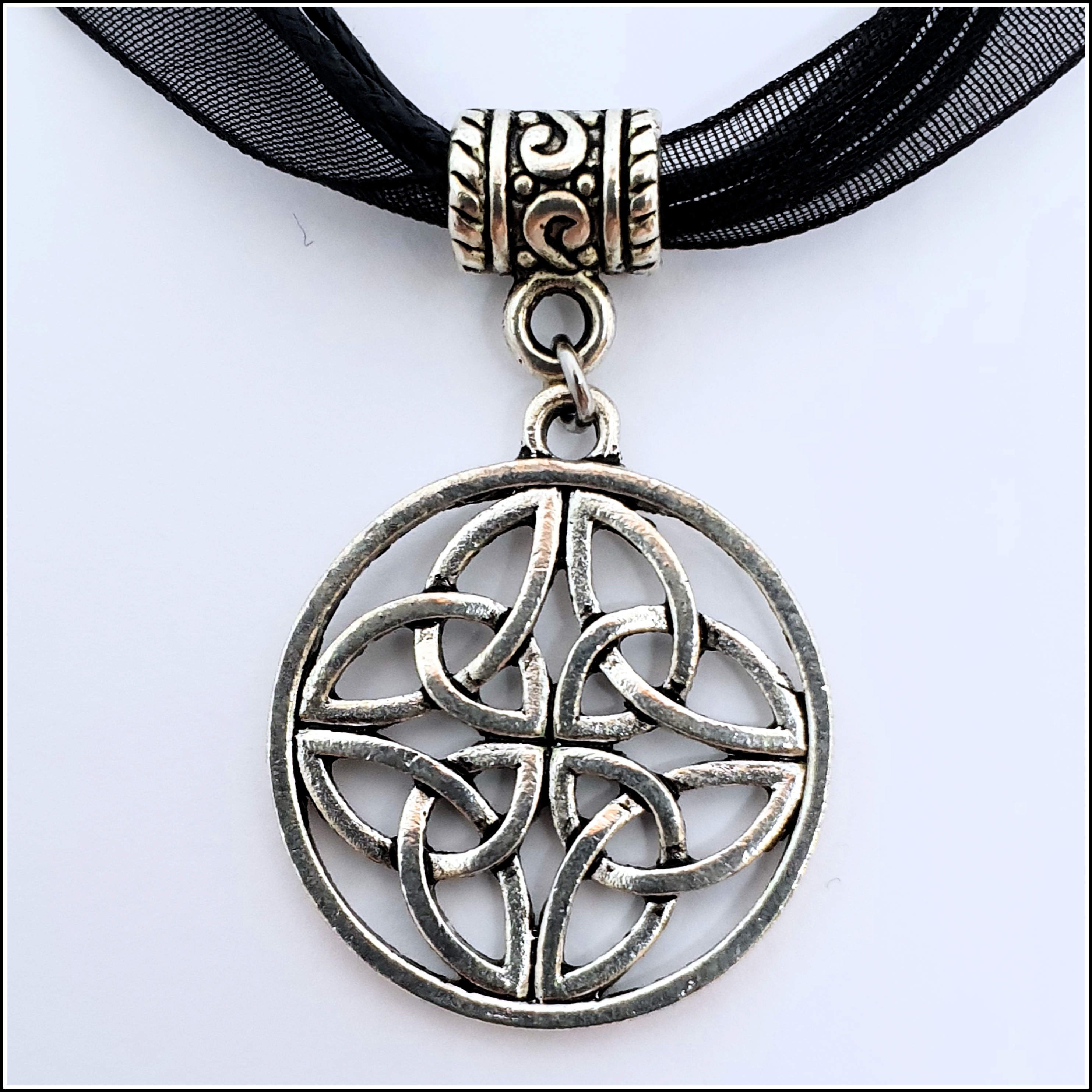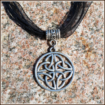 Ein keltisches Symbol, eine vierfache Triqueta, hängt an einem fünfreihigen Band in geheimnisvollem Schwarz (1 Oganzaband & 4 gewachste Baumwollkordeln ). Sollte Ihnen ein anderes Band aus unserem Shop farblich besser gefallen, schreiben Sie uns einfach an. Wir können das dann gerne austauschen.