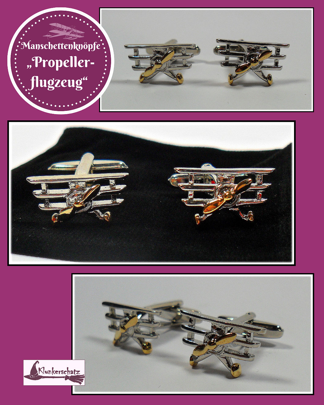 Wirklich außergewöhnliche Manschettenknöpfe wie aus der guten alten Zeit der Flugpioniere! Eine Propellermaschine von vorn – Propeller und Räder vergoldet.