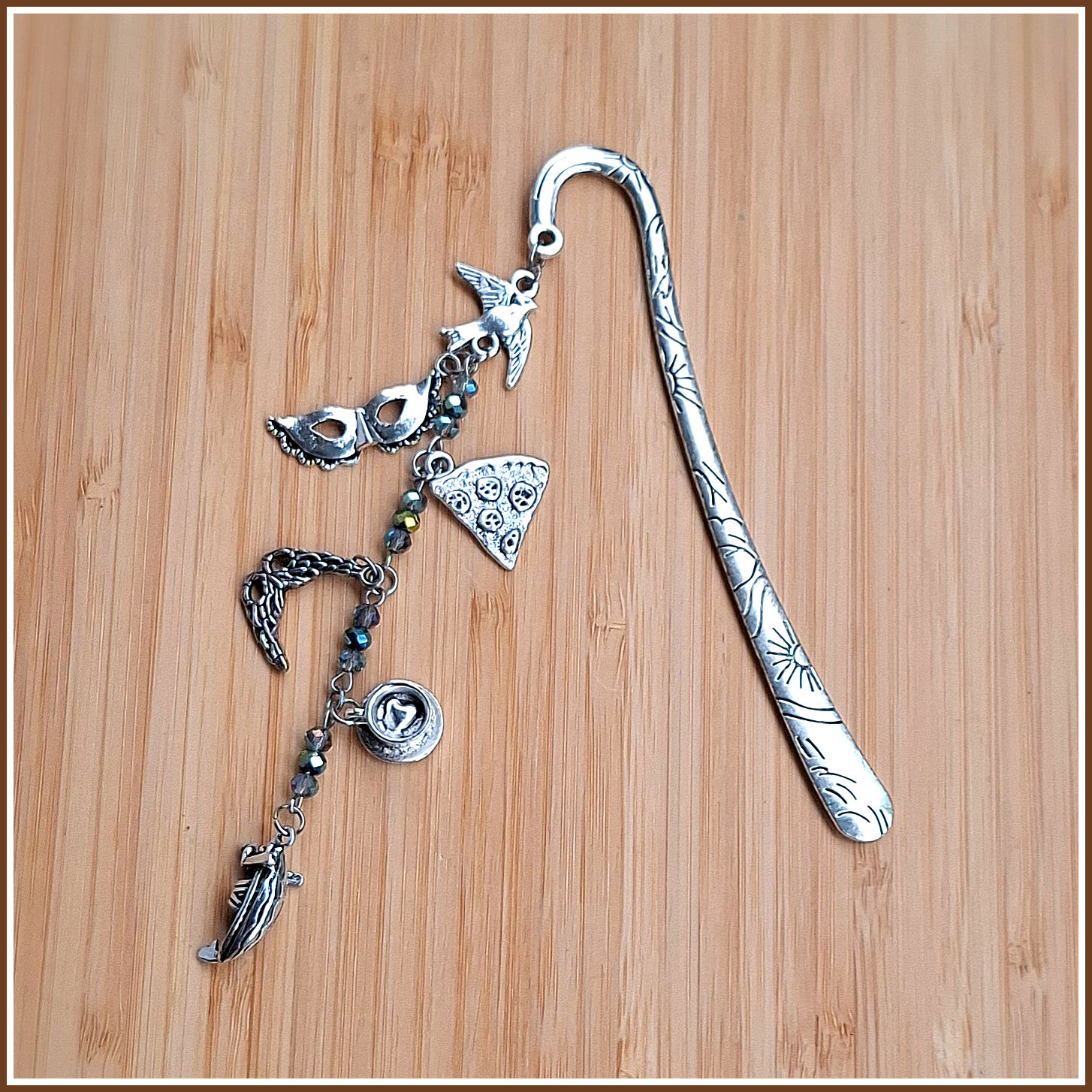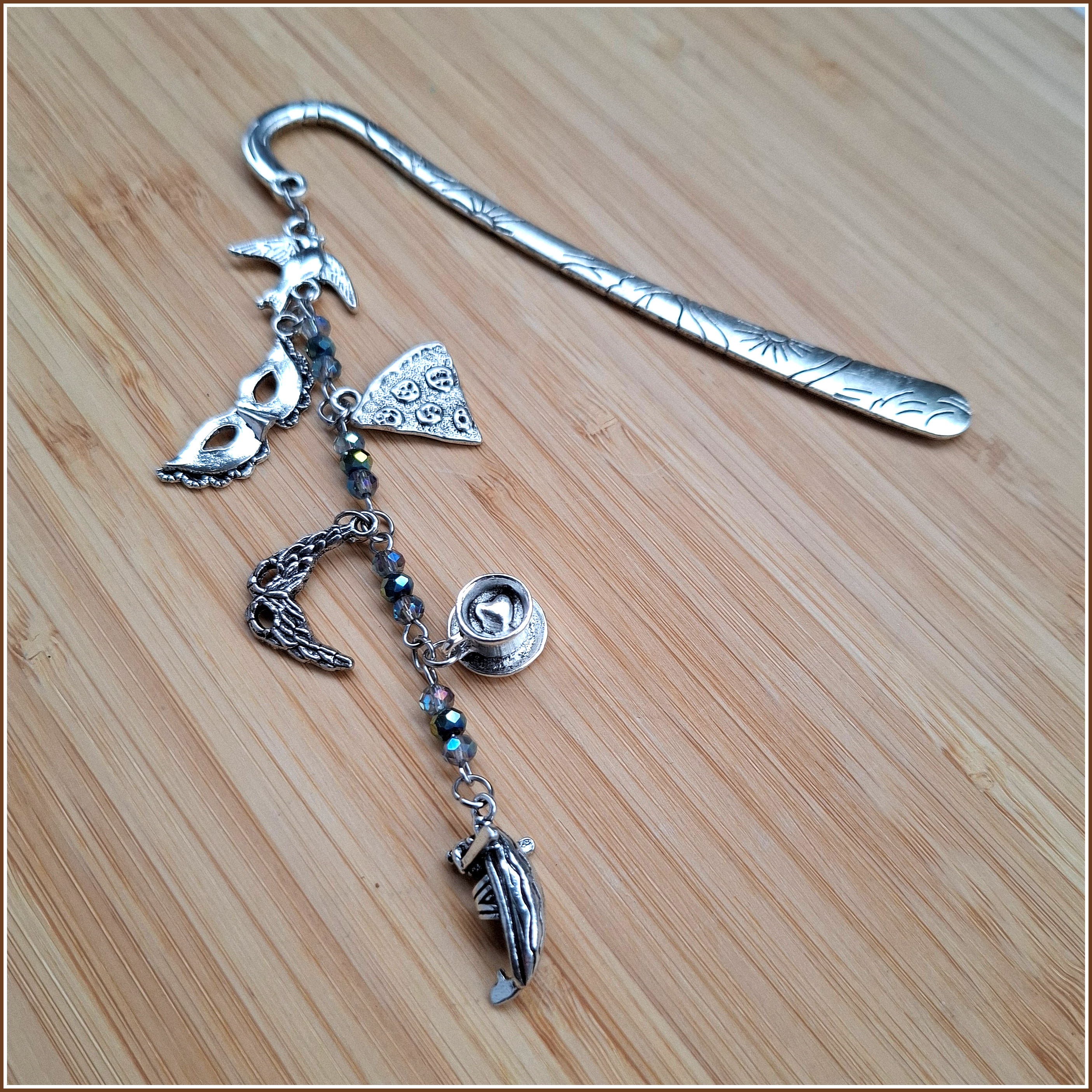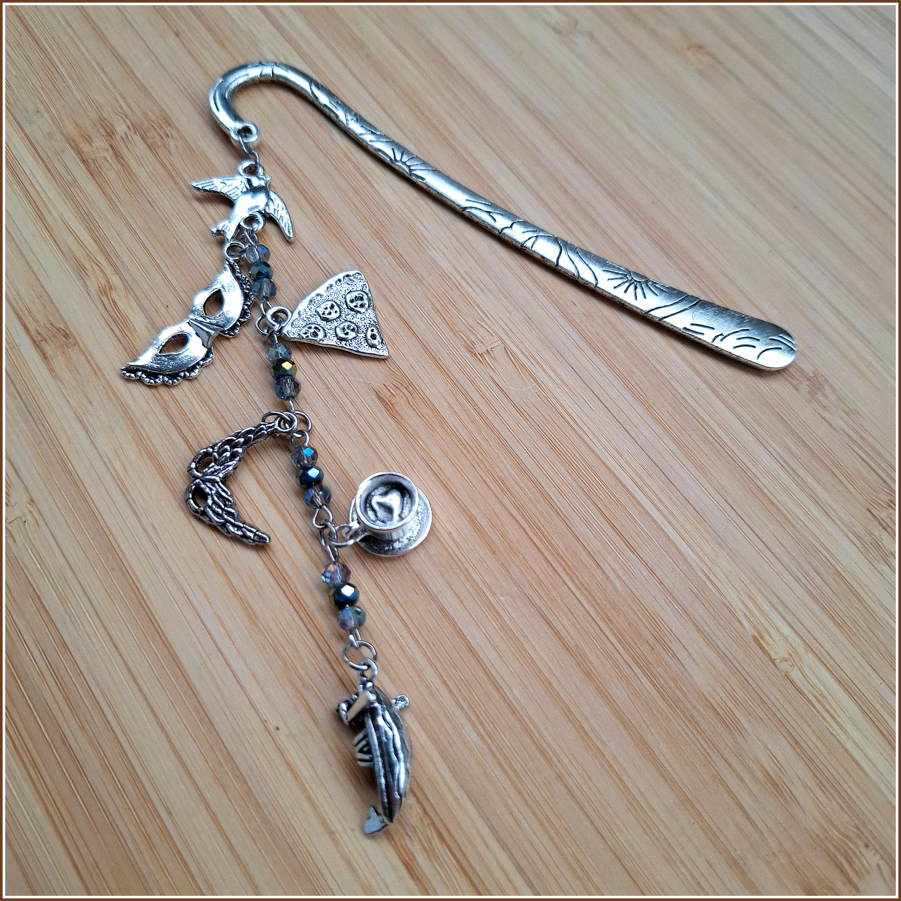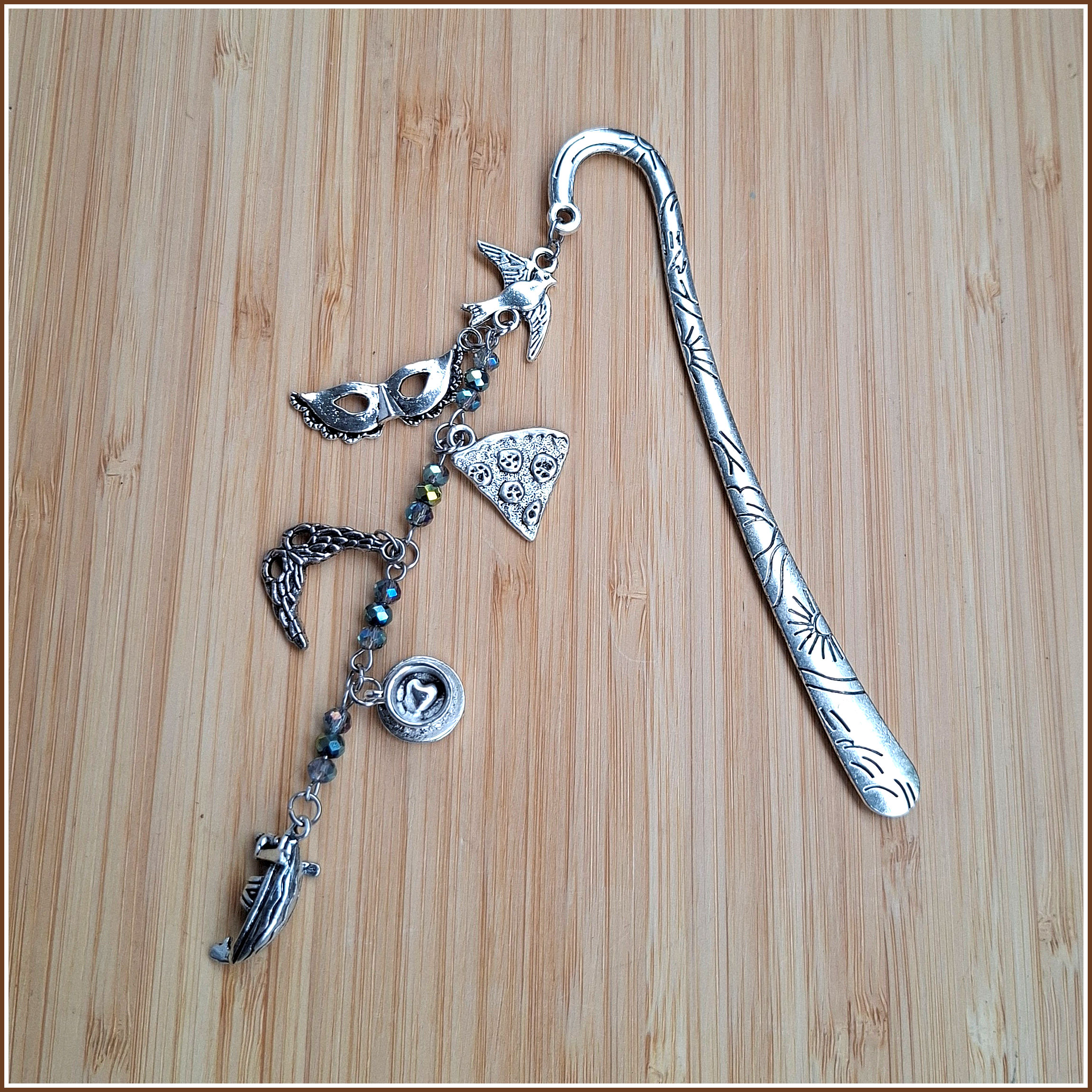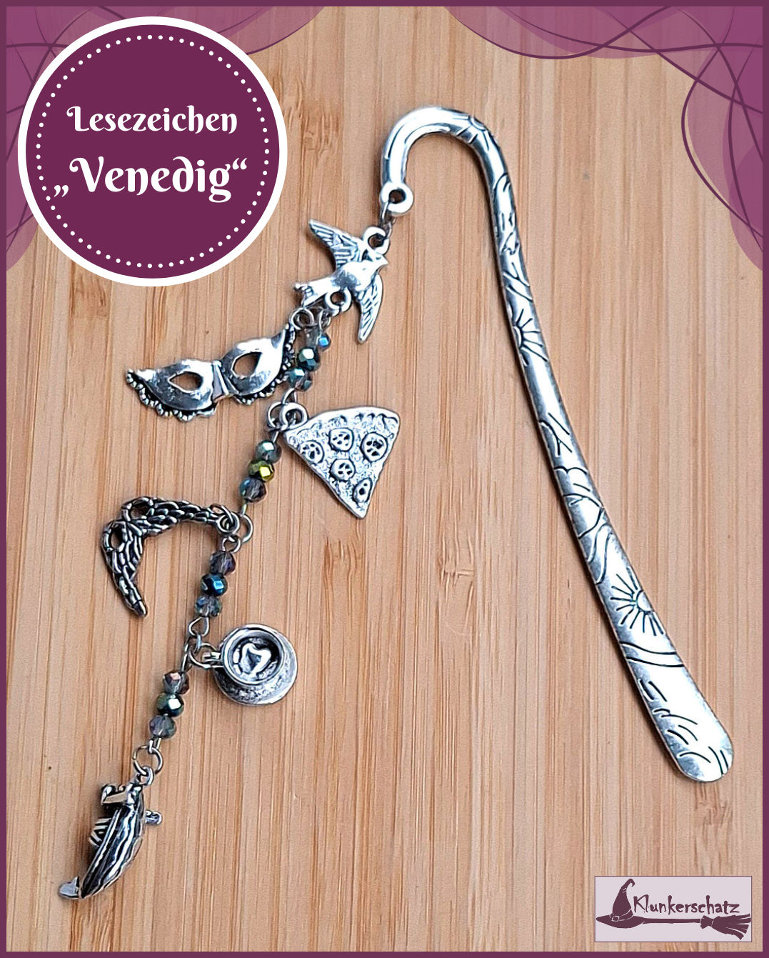Facettierte Glasperlen in unterschiedlichen Blautönen, eine Gondel, Masken, eine Espressotasse, ein Stück Pizza und die unvermeidliche Taube, die sicher gerade auf den Markusplatz flattert sind die Symbole, die sich hier an einem der schönsten Lesezeichenkörper überhaupt versammeln – das alles und noch viel, viel mehr, das ist Venedig!