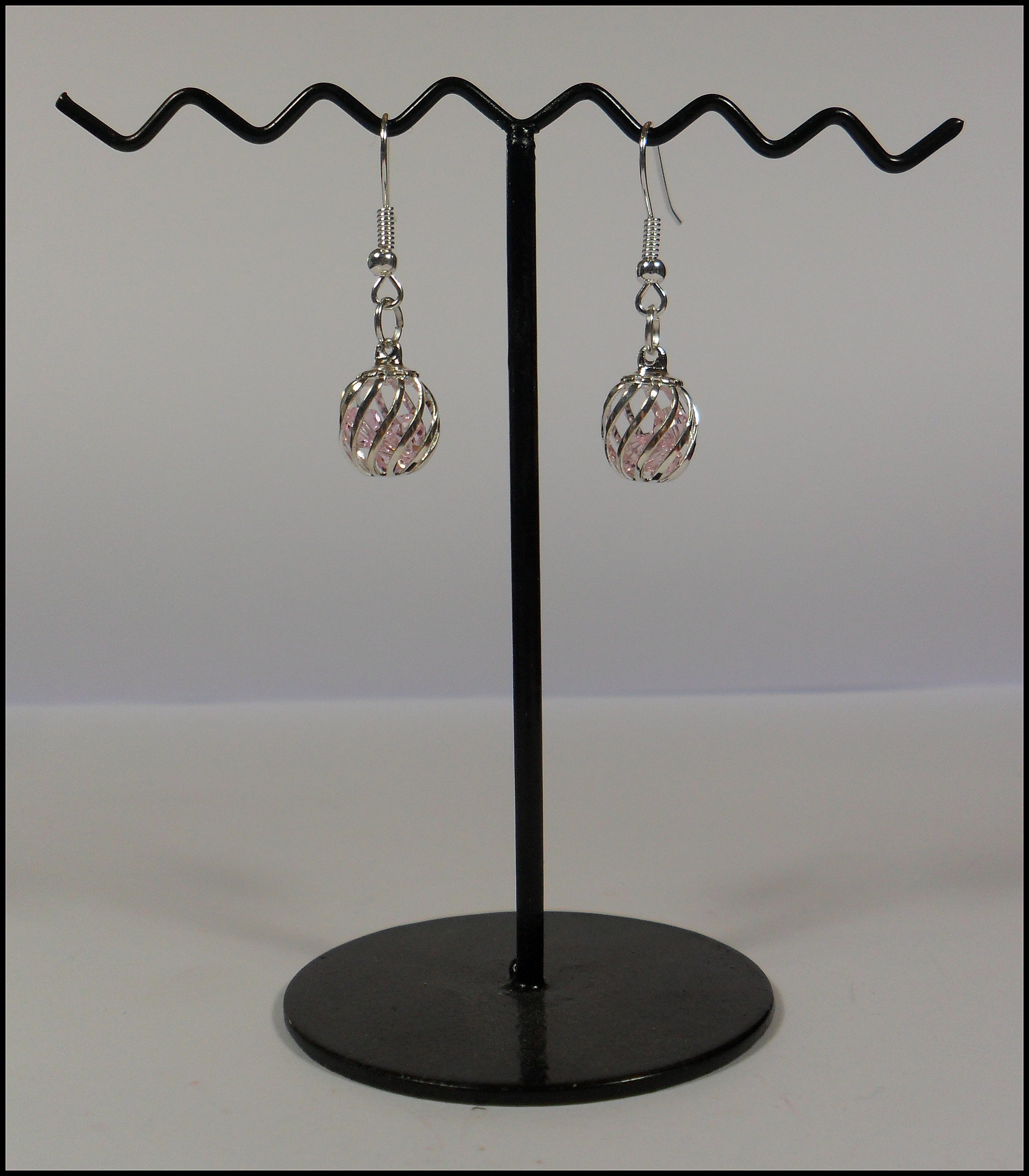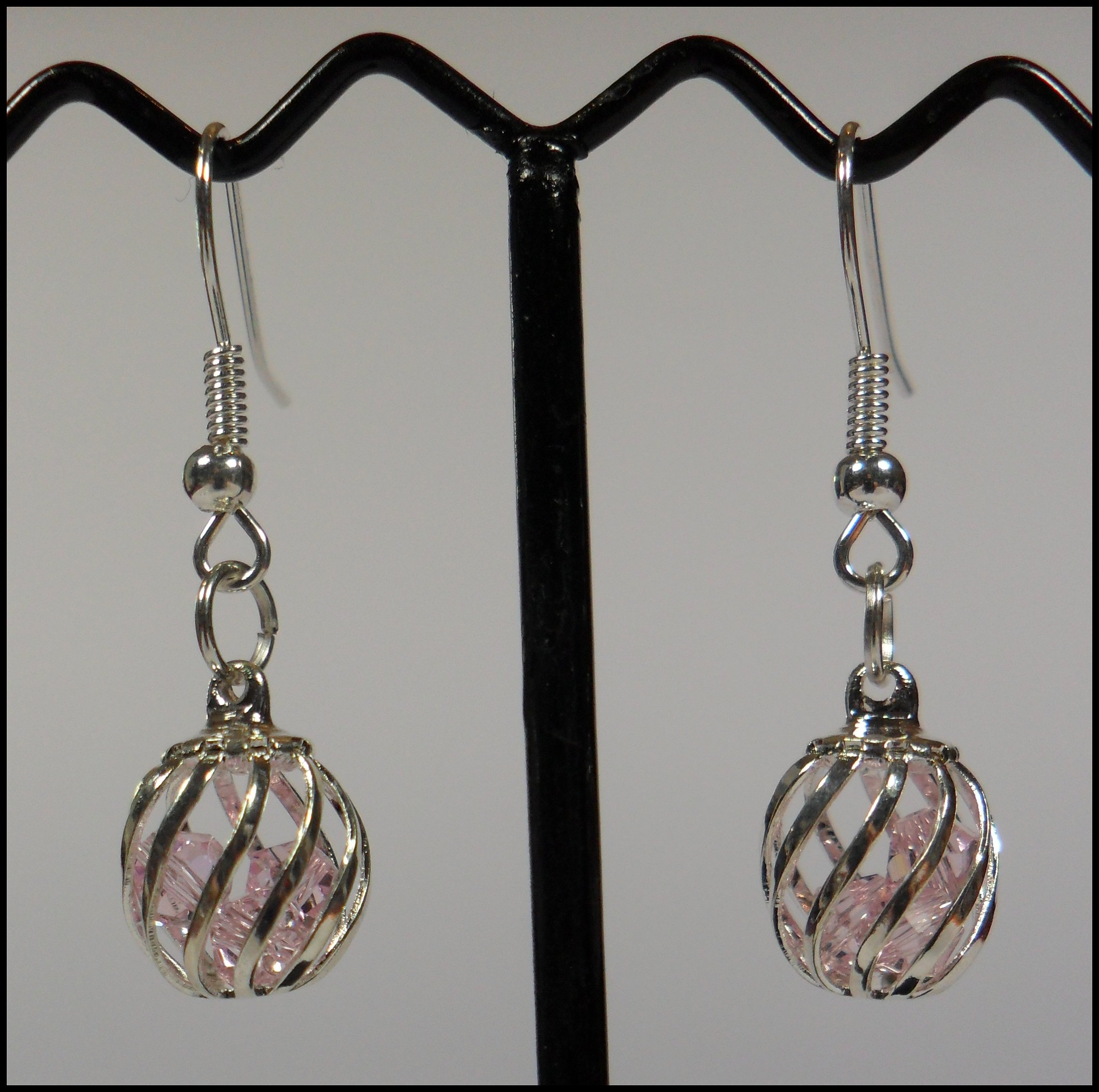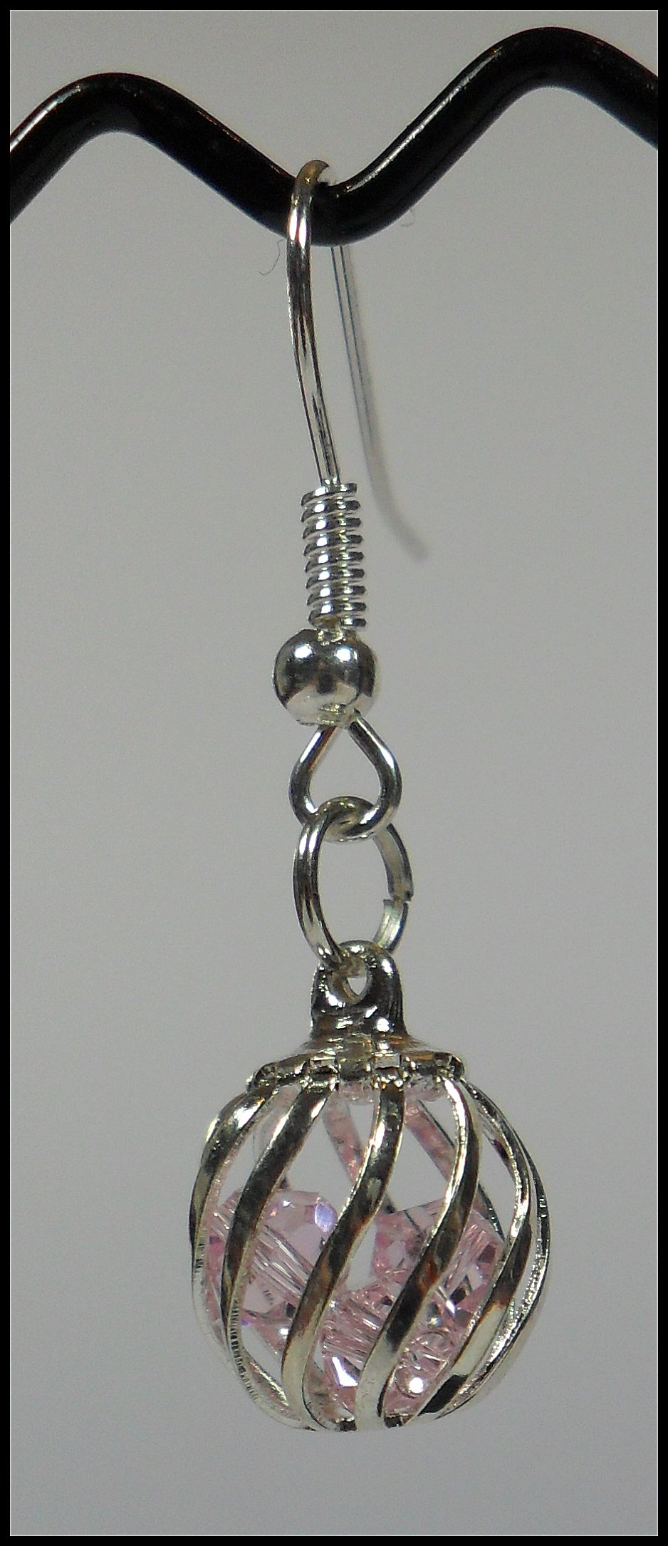 Entzückende kleine Ohrhänger, die durch ihre filigrane Liebe zum Detail bestechen. Die kleinen „Käfige“ enthalten jeweils 3 winzige, facettierte Glasperlen in zartem Rosa, die innerhalb des kleinen Gitterkäfigs frei beweglich sind.