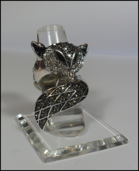 Ein großer, phantasievoller „Hingucker“, dieser entzückende Fuchs, der sich zusammengerollt um Ihren Finger kuschelt! Stirn und Schwanz sind besetzt mit funkelnden dunkelgrauen Strasssteinen (die fast wie Markasit wirken); Das Gesicht ist mit weißen Strasssteinen besetzt. Die Augen funkeln in Form schwarzer Strasssteine, und auch die Ohren sind schwarz abgesetzt.